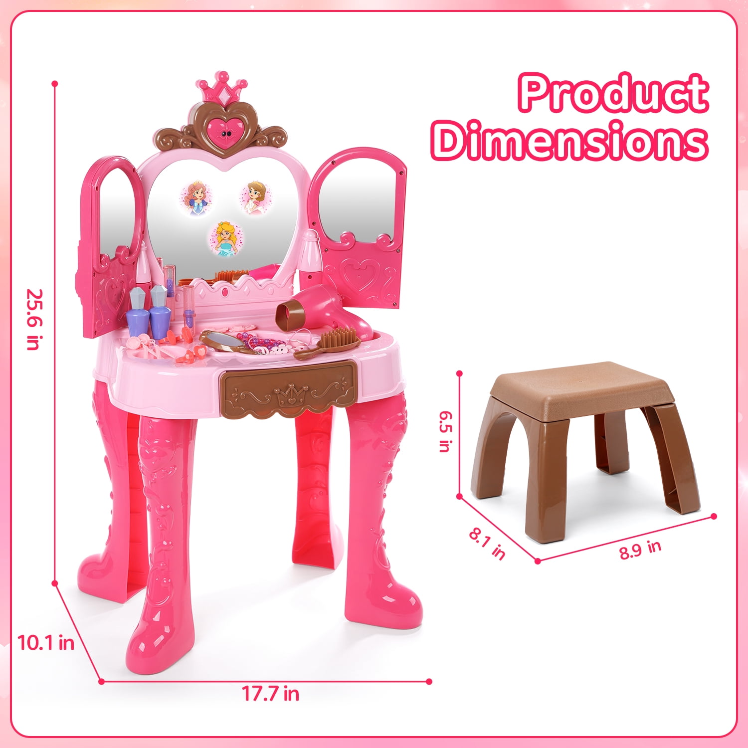 Beautiful Dressing table toy for little girls of age 3+ equipped with every kind of item. When you press the function button on the fairy infrared controller, the mirror door will open slowly with playing music and flashing light at the same time. Press again; the door will close slowly, music stop and the light to be off Your little princess can sit at her own dressing table, look in the mirror, pretend to do her makeup, and brush her hair. Develop their imagination, hand-eye coordination, confidence, and sense of beauty. Learn while you play! This Pretend Play Dresser set measures approximately 17.3 inches long x 9.0 inches wide x 29.2 inches high. The stool is about 7.5 inches long x 6.1 inches wide x 8 inches high. Using high quality ABS material, smooth edge, transparent anti-shatter mirror 100% safe, stable and anti-slip, play everywhere! All little girls dream of having their own dresser, Little Girl Princess Dresser set, satisfy her curiosity and fulfill your girl’s wish Princess dream! Perfect * for 2 3 4 5 year old girl’s birthday gift!
