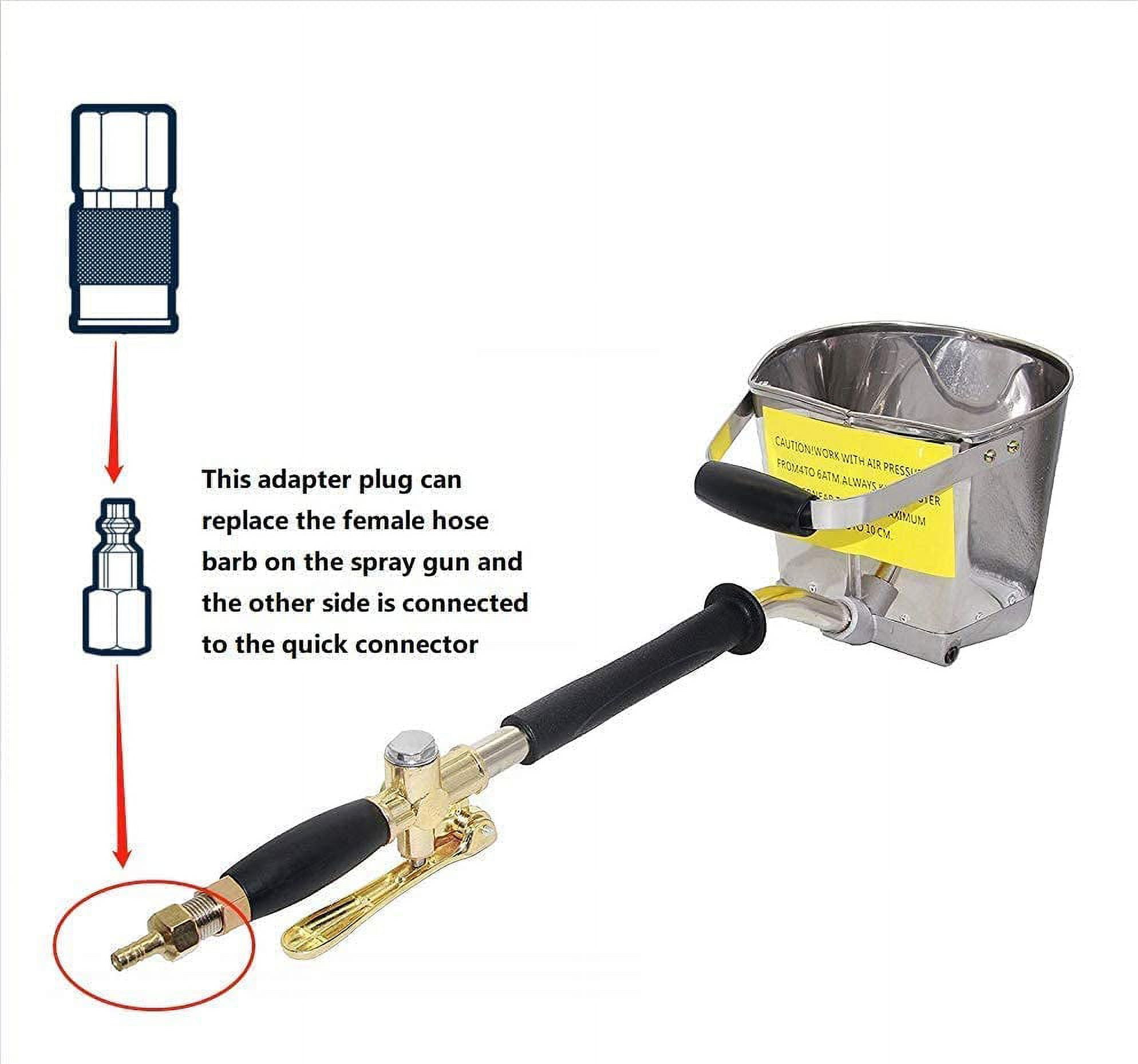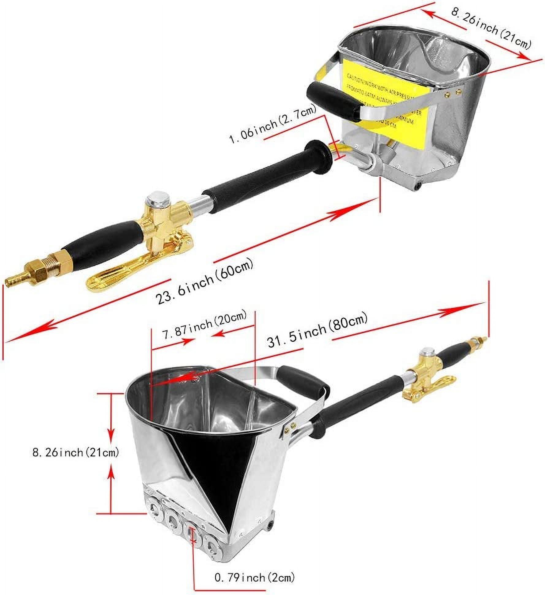 There is a hex nut fitting which can hold the handle & the bucket Four spraying holes,need to use with an air compressor. Handle on hopper for better control and ease of use. Fast and easy application of stucco, mortar and plaster. Pneumatically applied mixes offer a better water/cement ratio for a higher quality finished product. Faster spray speed, saving time and money.|Four-hole design,make the spray more uniform.|Stable spraying process and uniform and compact coating with high adhesive strength can be obtained by using the expert controller.