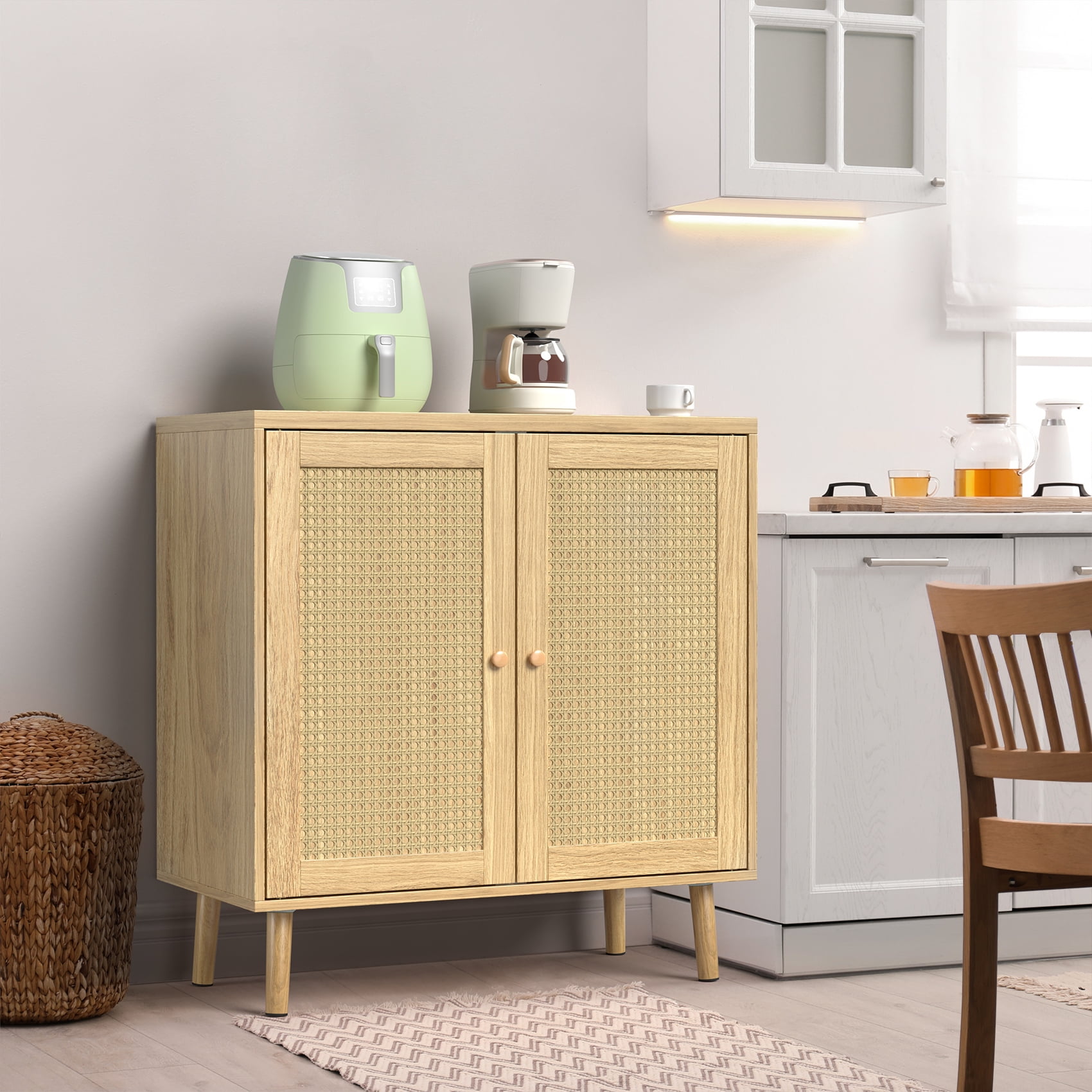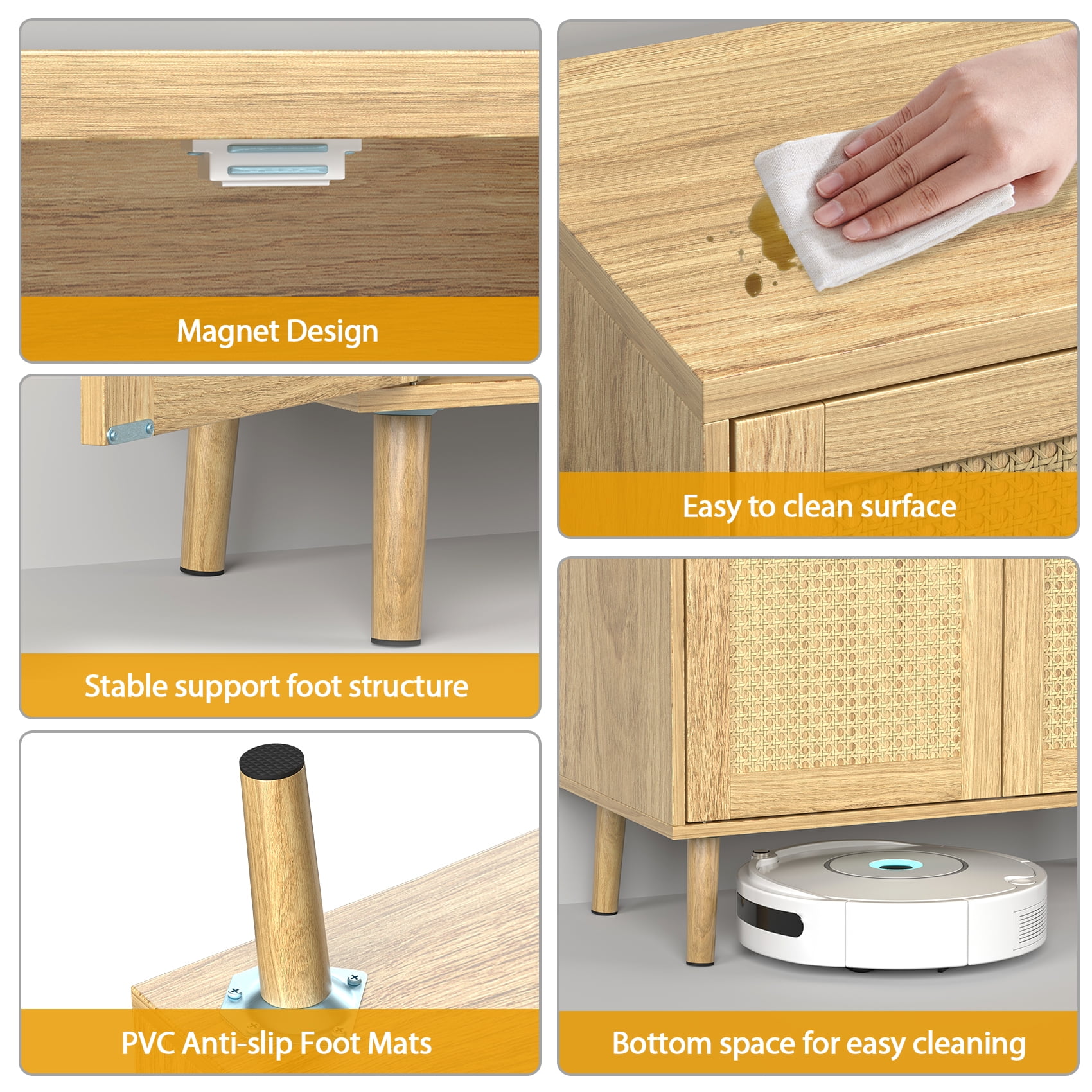 Ample Storage Space: The spacious desktop accommodates kitchen appliances like microwaves, ovens, coffee makers, and wine racks. Adjustable shelves offer flexibility for storing glassware, wine glasses, and large pots and pans, ensuring maximum storage capacity. Multi-Functional Design: This rattan cabinet seamlessly transitions between roles, serving as a kitchen sideboard, TV stand, storage console table, entryway cabinet, or bedroom accent cabinet. It adapts to your needs and enhances your home’s style. Refined Style: The natural color and rattan doors of this cabinet add rustic charm and elegance to your space. Combine it with other cabinets for a cohesive and aesthetically pleasing home decor. Easy Assembly: Clear instructions and labeled parts make assembly hassle-free. If you encounter any issues, our professional support team is ready to assist you. Versatile Functionality: Can be used as a serving station, display area for decor, or additional storage, making it a versatile piece of furniture for various needs. Elegant Design: Boasts a timeless, classic design with natural wood grain finishes, adding warmth and sophistication to any dining room or living space. Specifications: Product Dimensions: 15.74″D x 31.49″W x 31.49″H Drawer Dimensions: 15.74″W x 31.49″D x 12.2″H Item Weight: 53.6LB/PCS Mounting Type: Floor Mount Shape: Rectangular Number of Shelves: 3 Product Care Instructions: Wipe with Damp Cloth Assembly Required: Yes Package Contents: 1 x Sideboard Buffet Cabinet 1 x Accessory Kit 1 x Instruction Manual Suggestions: To maintain the longevity and appearance of this product, store it in a dry area away from direct sunlight.