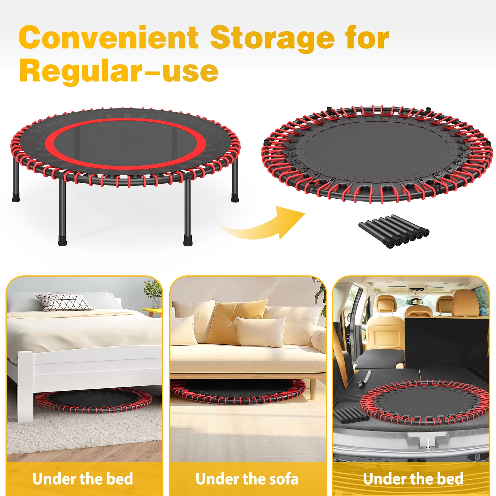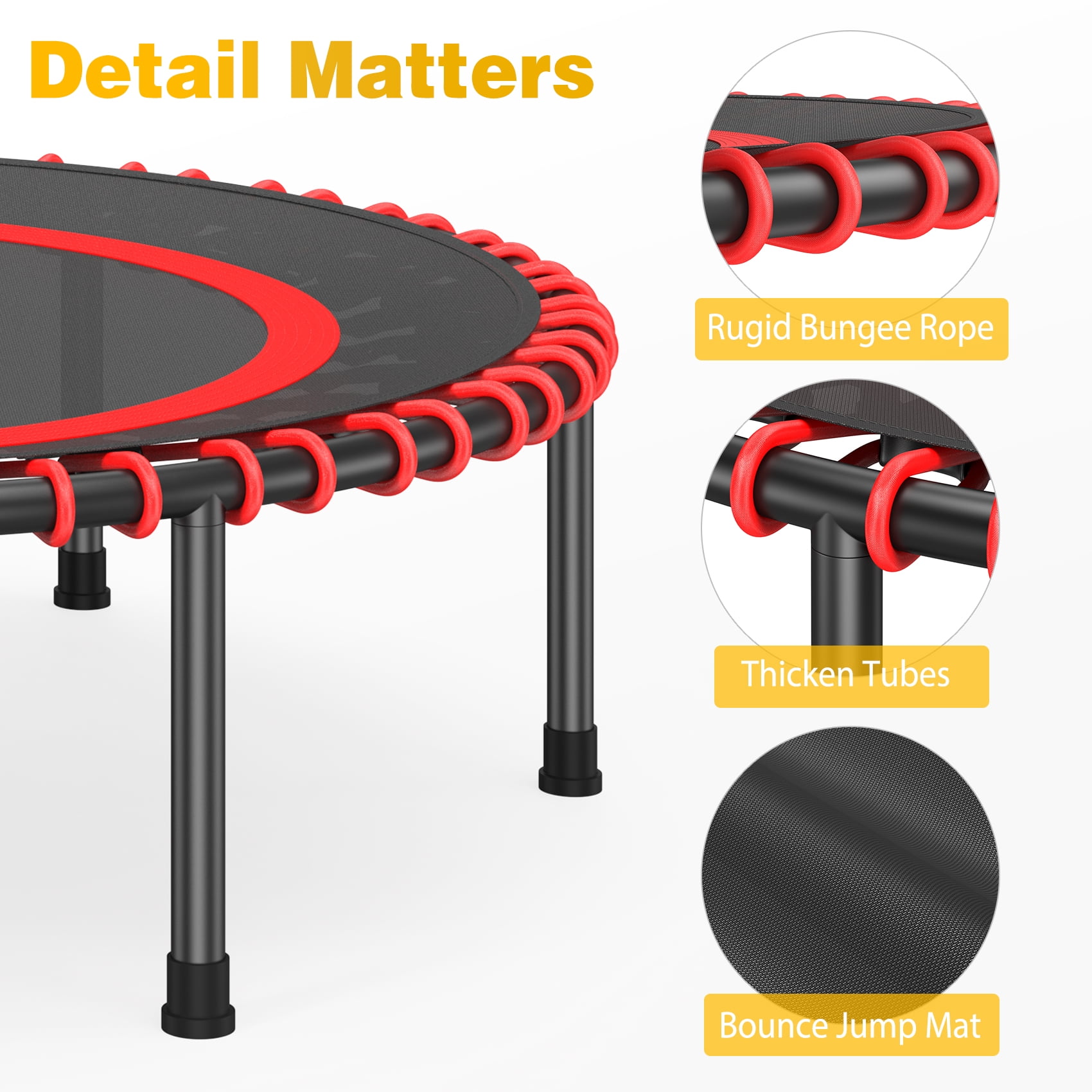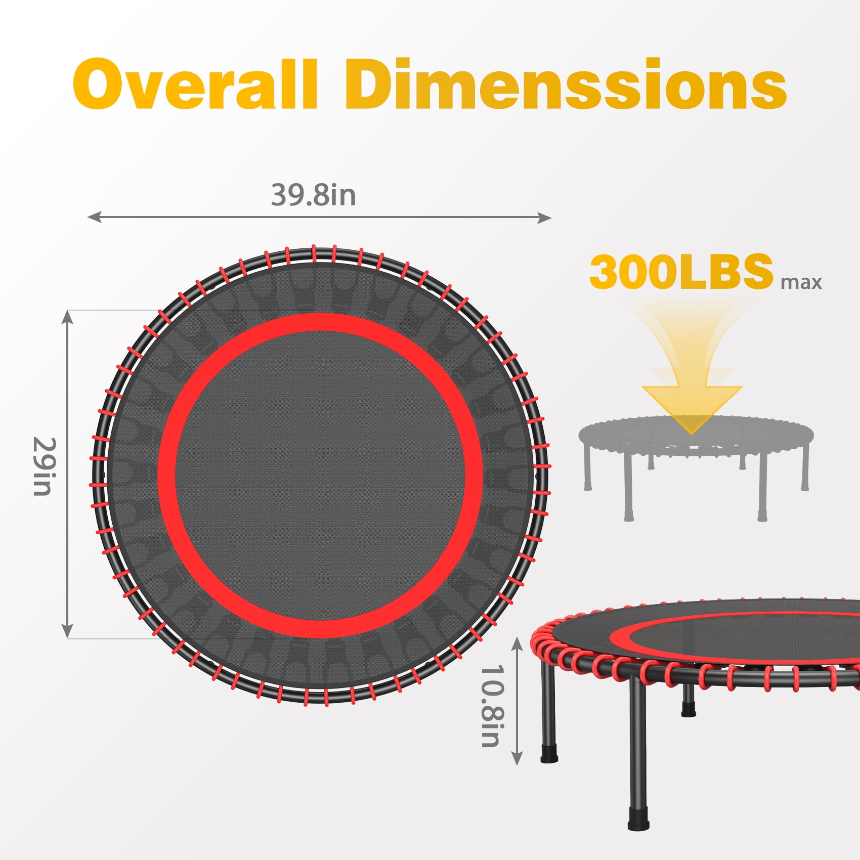 Enjoy a fun, safe, and supportive workout with the JOZ 40-inch Mini Trampoline, which helps tone your legs, abs, glutes, and back. The trampoline features an elastic safety pad and six detachable rubber-tipped legs for maximum protection, ensuring a secure and stable workout experience. The rugged steel frame and folding design make this trampoline compact and space-saving, perfect for indoor or garage use. With a 40-inch diameter and an all-steel frame construction, this trampoline offers exceptional stability and can support up to 250 pounds. The 30 tension cords and 30 resistance bands, each 2 inches wide, provide enhanced durability and stability for your workout. Target and strengthen various muscle groups, including your shoulders, hips, and legs, for a toned and fit physique. Achieve your weight loss goals with this effective fitness trampoline, as just 10 minutes of bouncing equals 1-hour jogging, 30 minutes of cycling, or 20 minutes of swimming. This trampoline makes an excellent gift for fitness enthusiasts, perfect for Christmas, Thanksgiving, birthdays, and other special occasions.