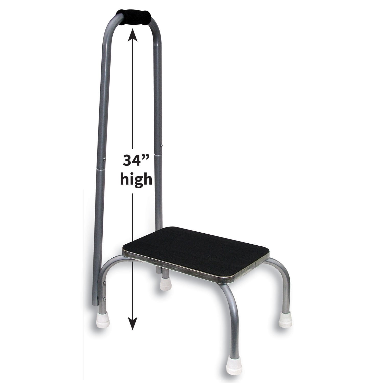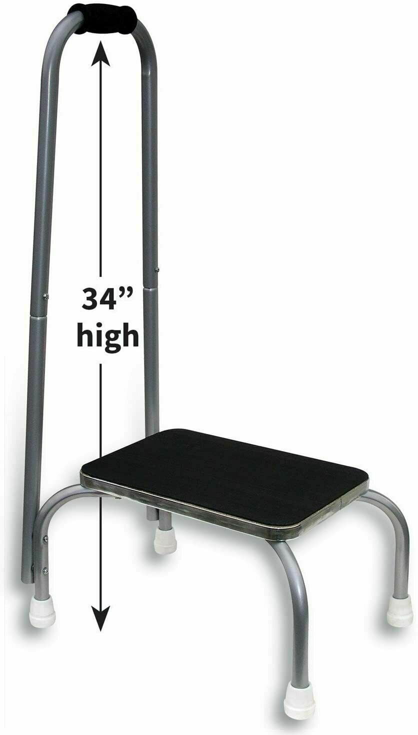 Safety Step Stool with Handle Aluminum Kitchen Step Stool Senior Handicapped Easily reach objects out of your grasp with the support of a convenient handrail, providing safety and stability. Safely step up to higher beds, vehicles, cabinets, and much more Great for Kitchen, Workroom & office The tall chrome-plated steel frame boasts a strong 300-pound weight capacity. Foam grip handle increases stability, Strong metal tubular construction Generously sized non-slip step with rubberized tread Rubber feet hold stool in place while protecting floors The extended leg design prevents Wobbling and Tripping