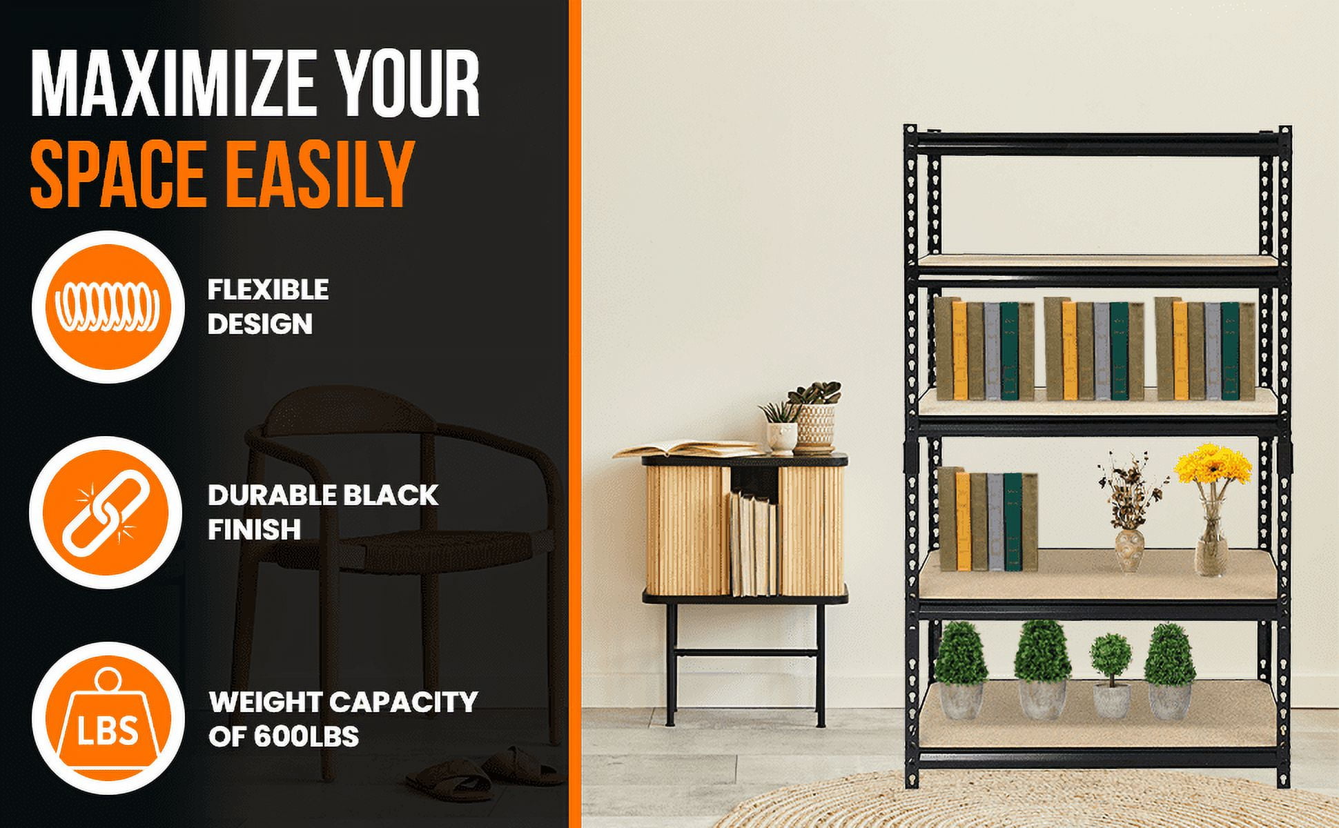 Each Post Has Open Slots Every 1-1/2 Inches Allowing Shelves To Be Adjusted At Different Heights To Accommodate Small To Larger Size Items. 5 Shelves That Provide Ample Storage For Bins, Boxes, Tools, Food Containers And More Steel Beams And Shelves With Particleboard decking and a durable black finish Weight Capacity Of 800Lbs. Per Shelf And 4000 Lbs. In Total Quick and easy to assemble, our innovative bolt-less assembly system makes it easy for you to snap the racks safely together with no bolts or screws required. This standalone shelf is ideal for laundry rooms, garages, basements, pantries, warehouses, or any cluttered home or office space Can be assembled as workbench Adult assembly required