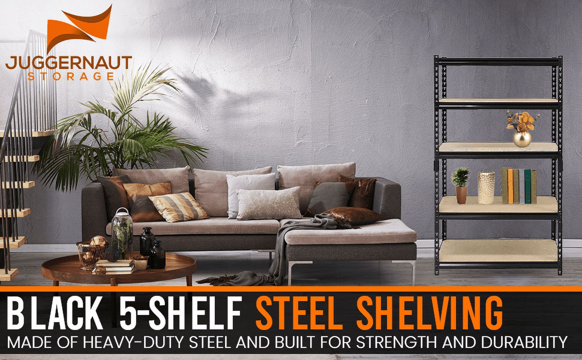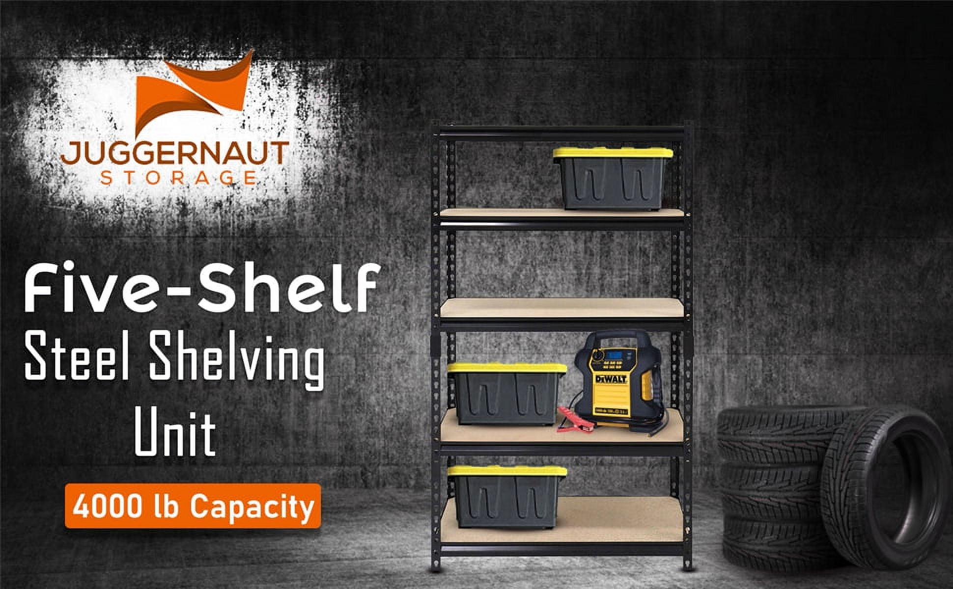 This 5-shelf storage unit is made of heavy-duty steel and built for strength and durability. The shelves of this five-tier shelving unit can be adjusted every 1-1/2″ to allow for extra space as needed, and each shelf has a weight capacity of up to 800 lbs when evenly distributed. The flexible design can be assembled vertically for traditional shelf space or horizontally for a workbench style piece. It measures 24″L x 48″W x 72″H. The Juggernaut Storage Rack 5-Shelf Steel Shelving Unit is available in a black finish that will last for a long time. Adult assembly required.