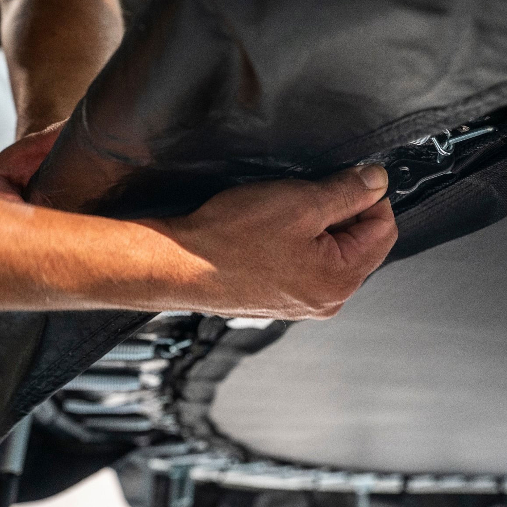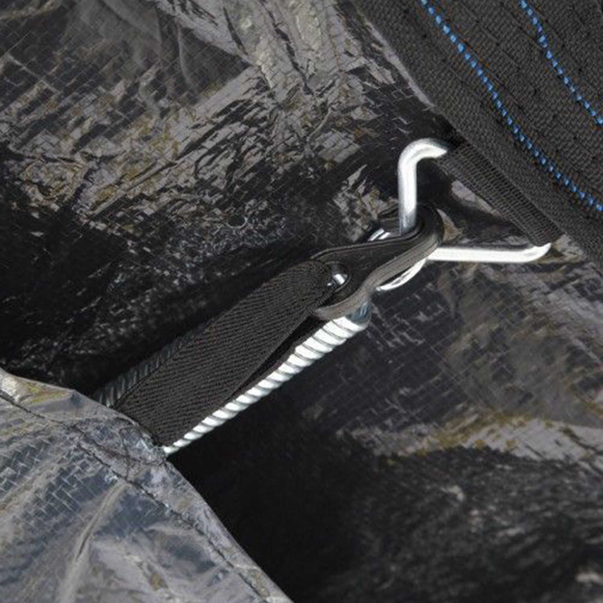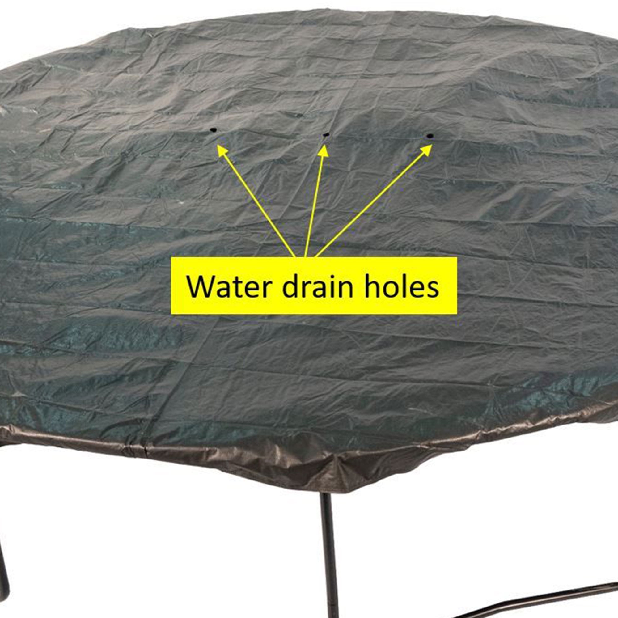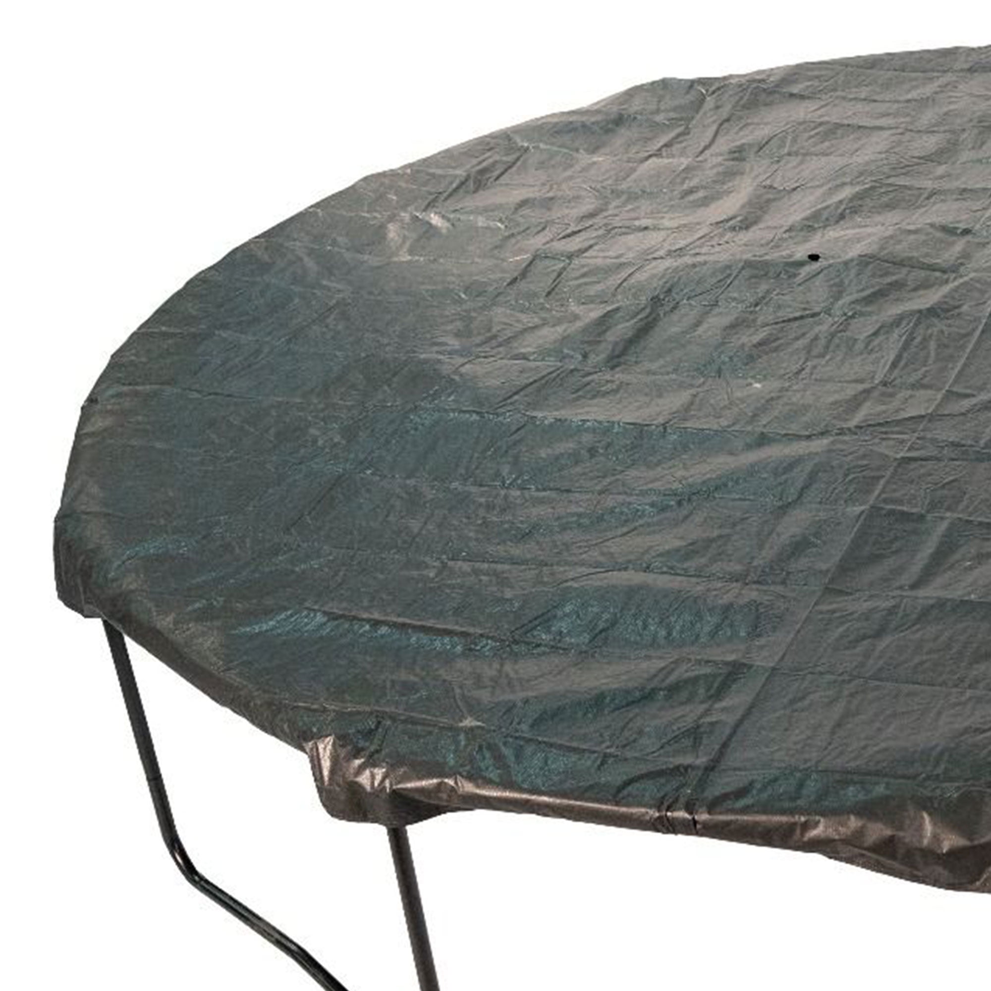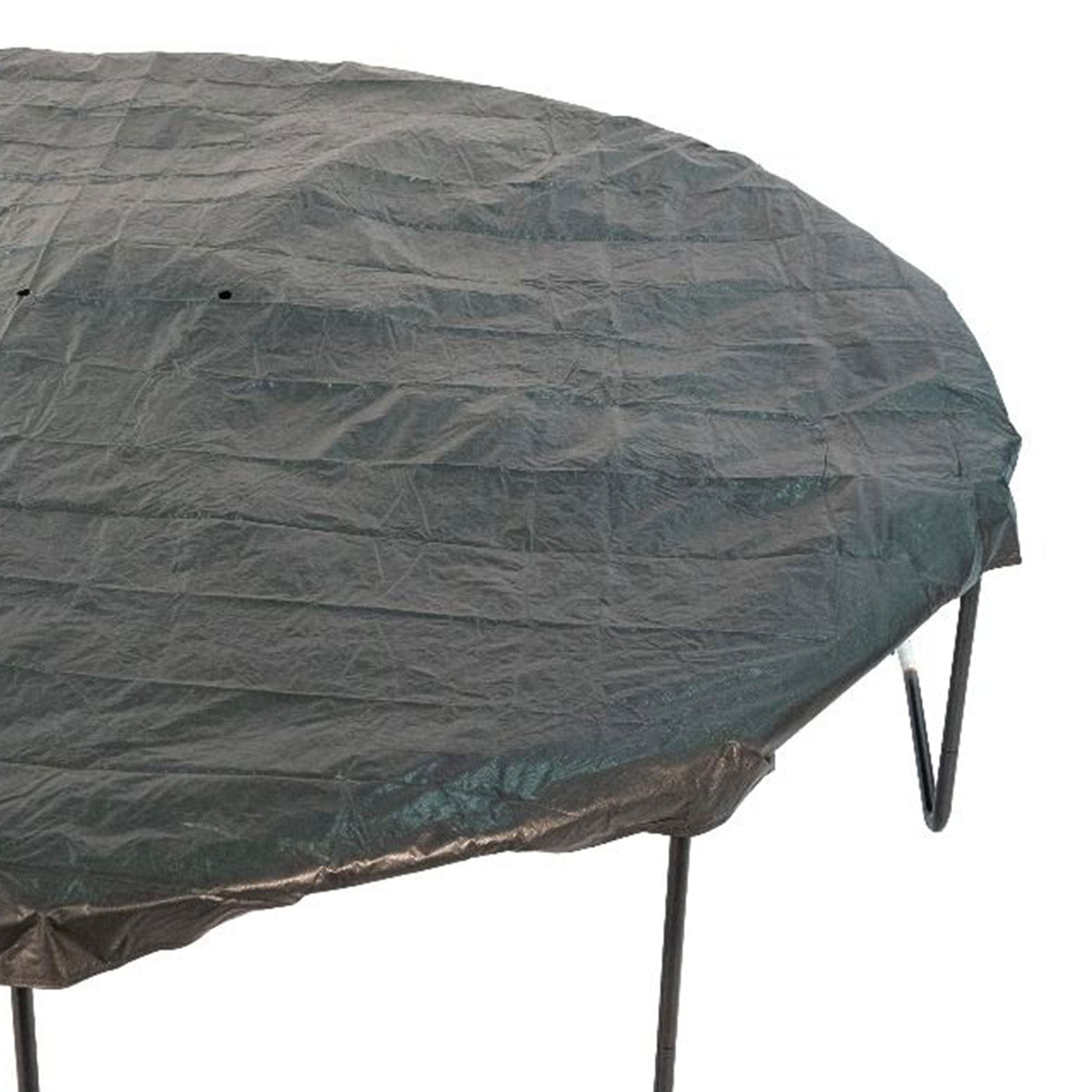 Our black UV resistant weather cover is made out of durable polyethylene material Weather covers designed to fit most Round Trampoline Frames A great way to protect your trampoline from the elements This weather cover design has attachable black plastic hooks to the V-rings Drain holes keep water from pooling on top of the trampoline and also reduce ice from forming in winter