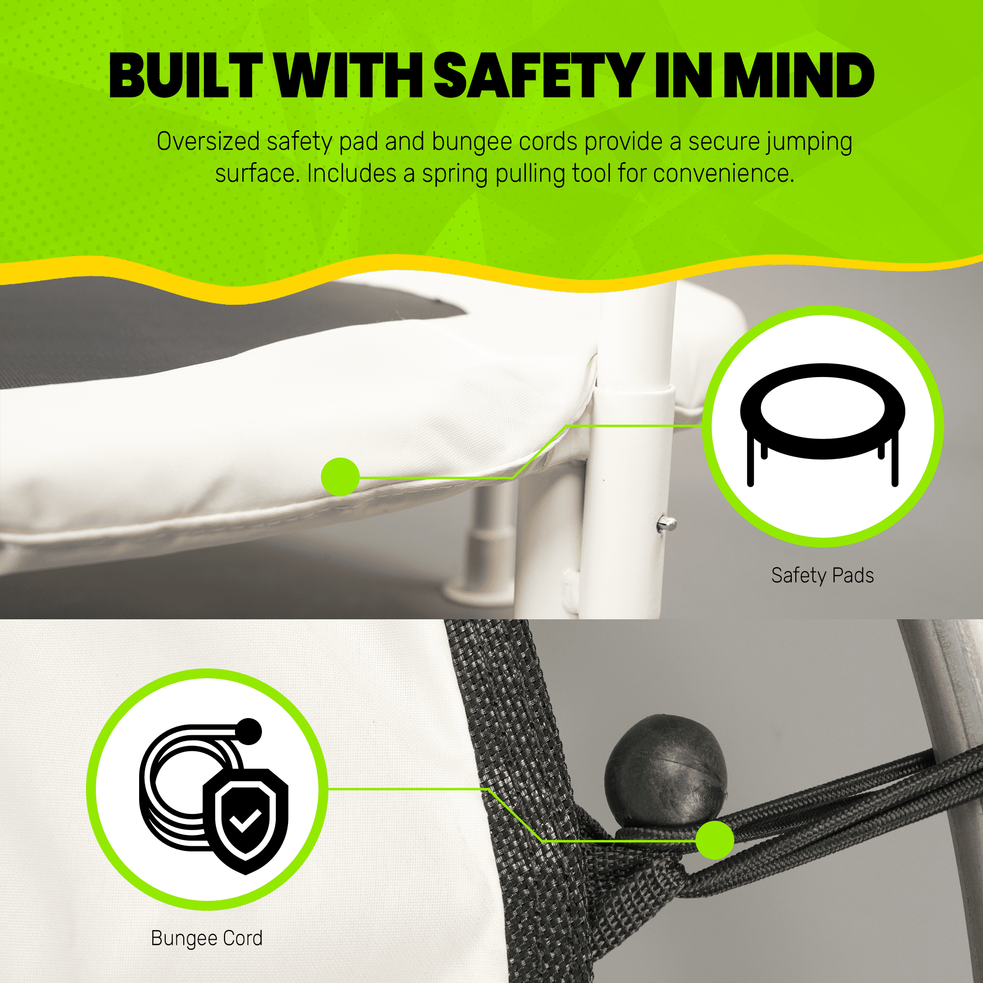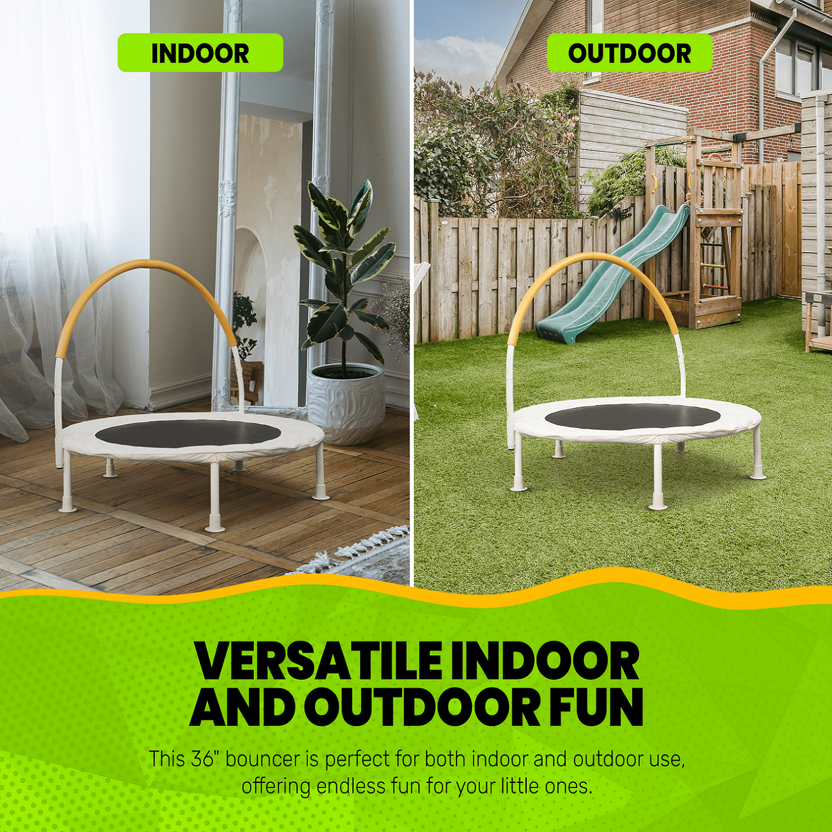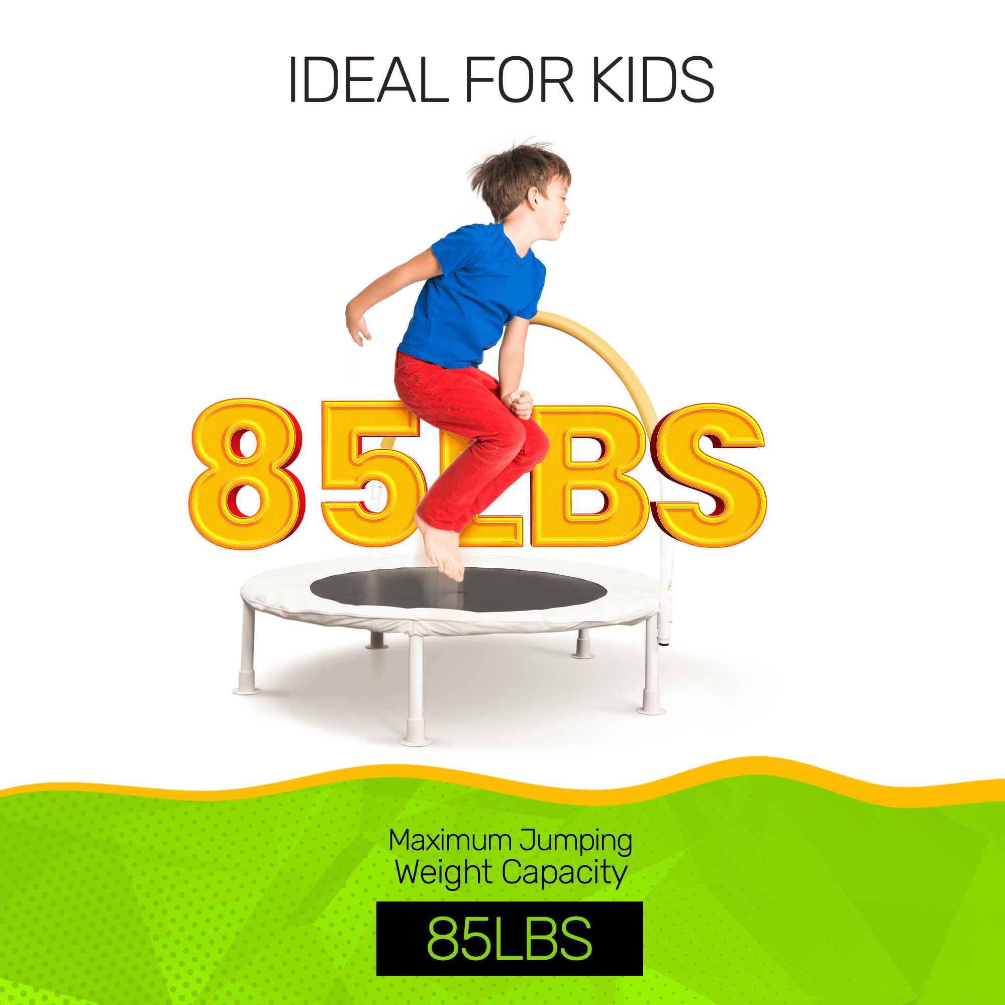Versatile Indoor and Outdoor Fun: Enjoy bouncing anywhere with this 36″ diameter bouncer designed for both indoor and outdoor use ensuring endless fun for your little ones. Durable Construction: The rust-resistant galvanized steel frame ensures durability, featuring an easy-to-assemble unique toprail system for hassle-free setup. Powder Coated Perfection: Featuring powder-coated legs and handle rail, this trampoline not only ensures durability but adds a touch of style to your play area. Sturdy Support: Equipped with 5 plastic capped legs, providing stability and reducing the risk of floor damage. The foot covers are versatile in different flooring, by adding friction/ suction on wood and tile. Cushioned Protection: Sleeve covers and a foam-padded handlebar provide extra protection, ensuring a safe and comfortable bouncing experience Safety First, always: The oversized safety pad and bungee cords contribute to a secure jumping surface, and the package includes a spring pulling tool for added convenience. Perfect for the Little Ones: With a maximum weight capacity of 85 lbs. or less, this trampoline is tailor-made for smaller children, prioritizing their safety and enjoyment. Bed is assembled with bungee cords. Meeting Standards: Rest easy knowing it meets or exceeds the latest toy’s product safety standards, prioritizing safety and quality.
