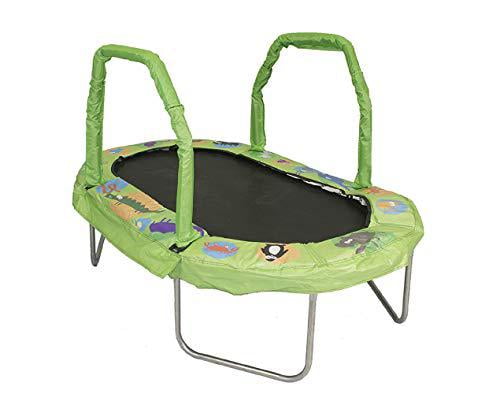 3.5″ galvanized springs (36) · An easy to assemble top rail system with 8 top rails · A rust resistant galvanized steel frame; · A large jumping surface in unique oval shape · 2 handle bars for stability with height of 24″ each. · Colorful green animal printed safety pad with mounting straps to secure pad · Coordinating green foam sleeve covers to match safety pad · Trampoline can be used indoors or outdoors. · Maximum weight capacity is 110 lbs.
