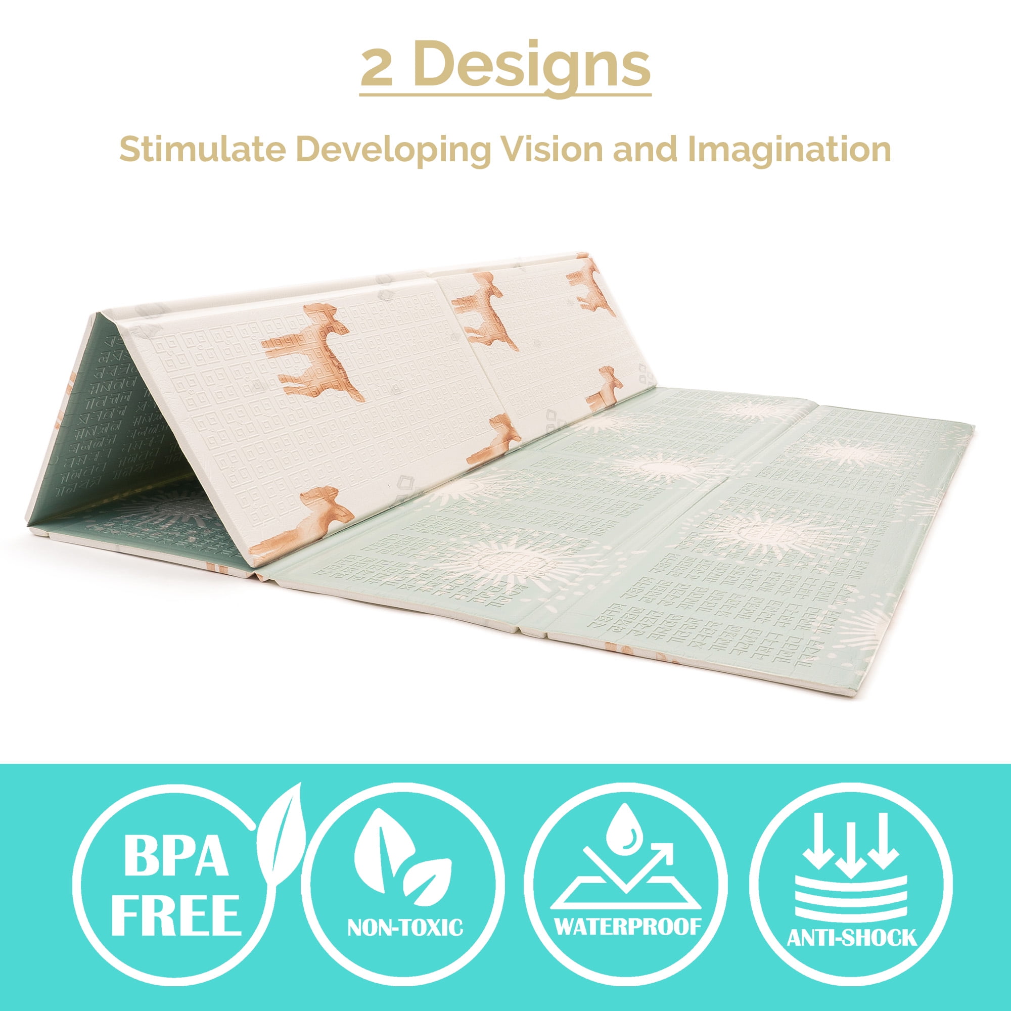 Spacious Kid Play Mat – Give your little one plenty of space to play, nap, or crawl. This extra large baby playmat offers a spacious area for family bonding, making it a must-have for new moms. Easy to Pack – This crawling mat adopts a foldable design for easy and compact storage, collapsing to 35″ x 15.25″ x 6″. Store it under the crib, in the room, or load it into the car for outdoor trips. Versatile Usage – Designed for infant activities like tummy time, crawling, learning to walk, playing, and sleeping, ensuring your baby’s comfort all the time. Safe & Secure – Non-Toxic, BPA, Phthalate, and Odor-Free. The thick XPE foam padding and non-slip textured surface provide a secure and reassuring play area for your infants and toddler kids. Multi-Functional Floor Mat – Suitable for indoor and outdoor use like family outings, travel, picnics, beaches, parks, daycare centers, gyms, bedrooms, living rooms, kindergartens, and more. Effortless Clean-Up – Say goodbye to stains and messes. This soft foam mat is lightweight and waterproof, ensuring easy clean-up for parents. Foldable and Portable – With this unique accordion-style folding design, you can take this padded baby floor mat with you anywhere you travel with babies and toddlers. Reversible Design – Engage your babies as they explore this beautiful design with neutral colors on both sides. It’s the perfect playtime companion for your baby.