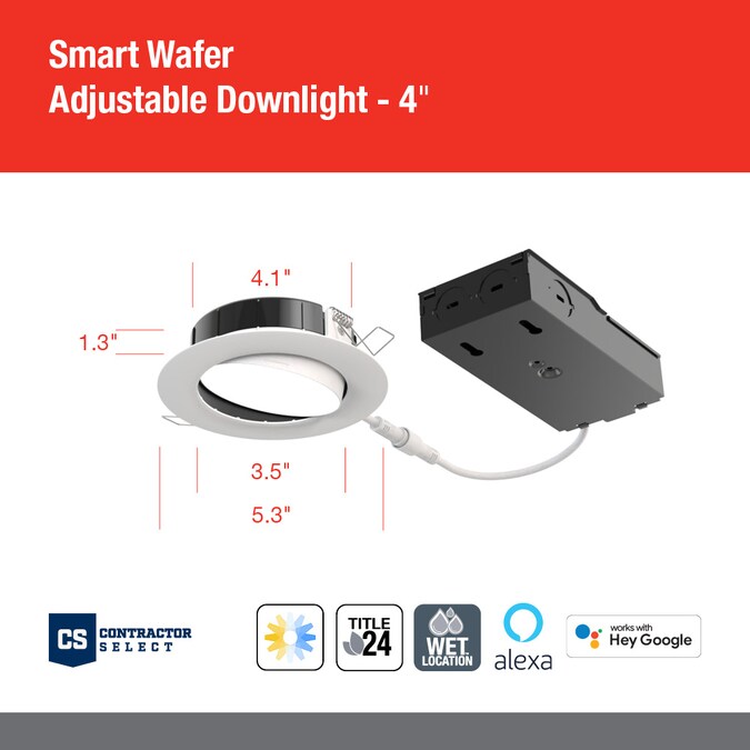 The Juno 4in. Smart Adjustable Wafer is the perfect way to get connected with your smart home lighting solution. Juno Smart Wafers use Bluetooth or Zigbee to pair to your mobile device or compatible smart home hubs and are also certified with SmartThings, Alexa and Google Home platforms once installed.
