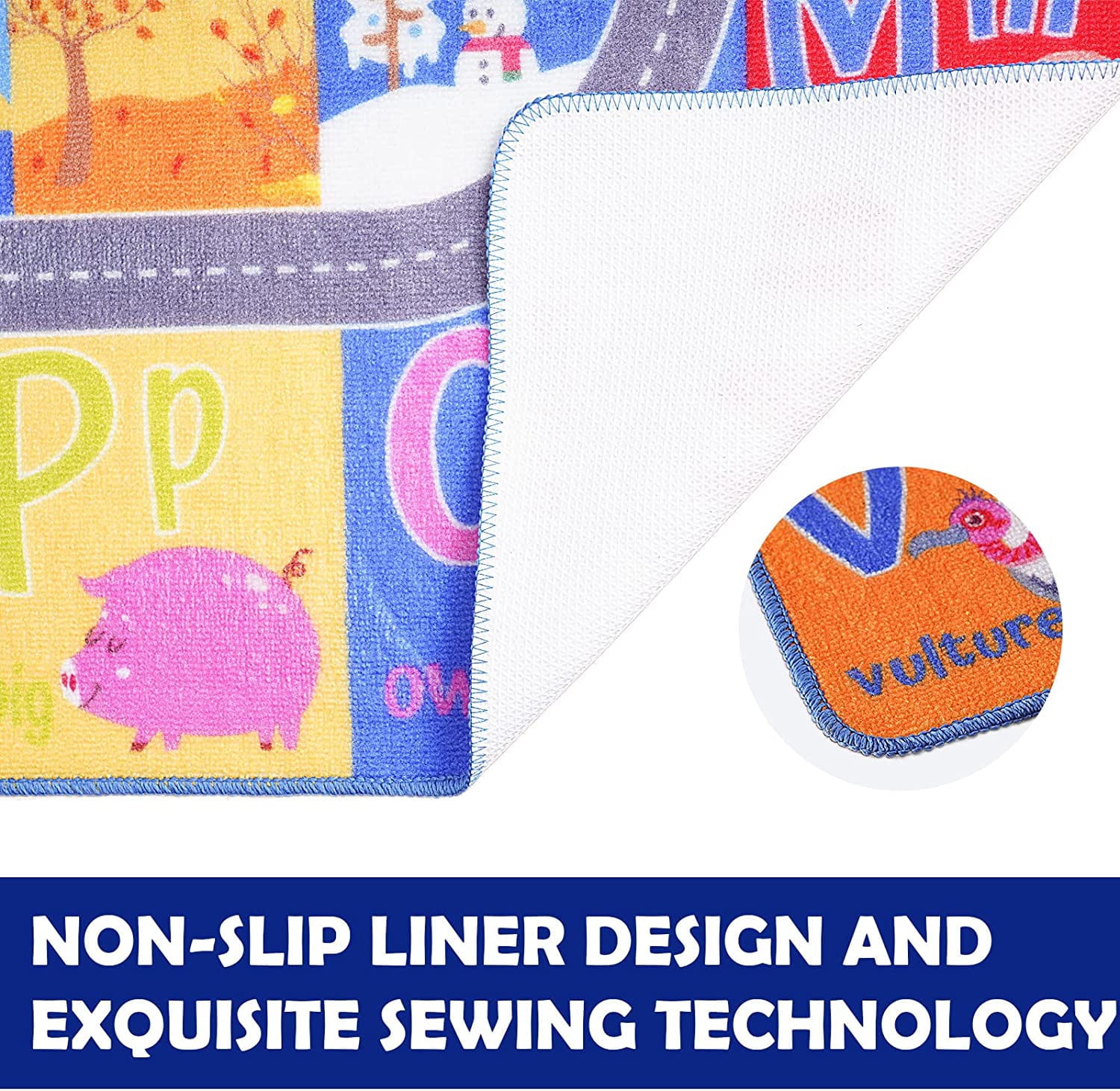 Junovo kids playmat.Our carpet perfect for teaching your child in an interactive way through memory game.There is seasons, shapes, animals, colors, letters and other patterns on the rugs.It can engage children in learning while they play.Our rugs made from quality polypropylene with a non-skid rubber backing, you can be confident that they’ll withstand regular playtime – year after year.
