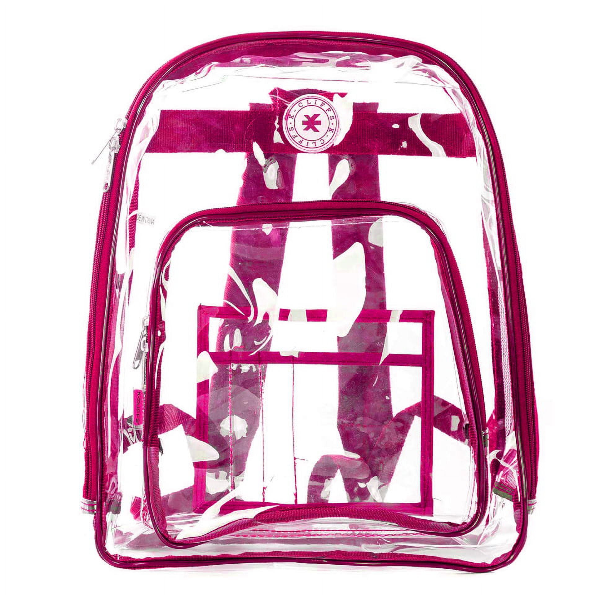 K-Cliffs See-Through School Backpack. Transparent PVC with Hot Pink Trim. Dimension: 17″x13.5″x7″ Heavy duty zippers. Sturdy mesh pocket on both sides. Padded and adjustable shoulder straps easily , Teen-adult