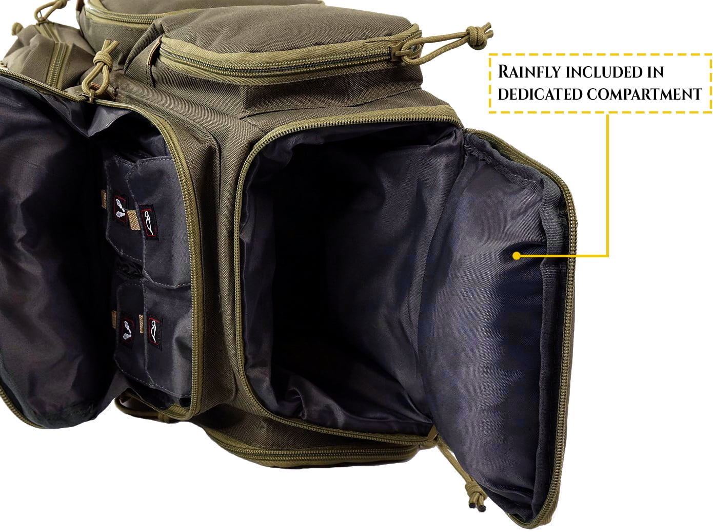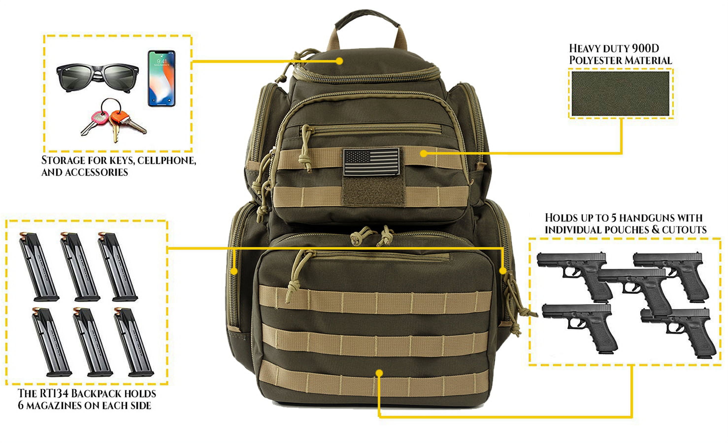 K-Cliffs High Quality Durable Shooting Range Backpack with Rain Cover. Perfect for camping Trekking, Hiking and traveling. Heavy Duty Material: High Density 900D Polyester Color: Khaki Range Backpack Dimensions: 18 x 13 x 10 Package Contents: 1x Backpack, 5x pouches, 1x rainfly. FREE U.S. flag patch included! Unisex, Adults
