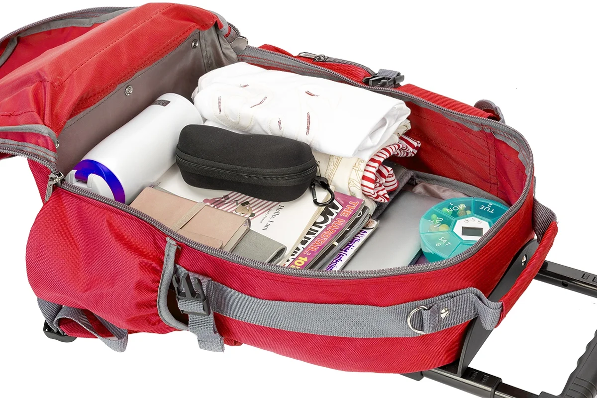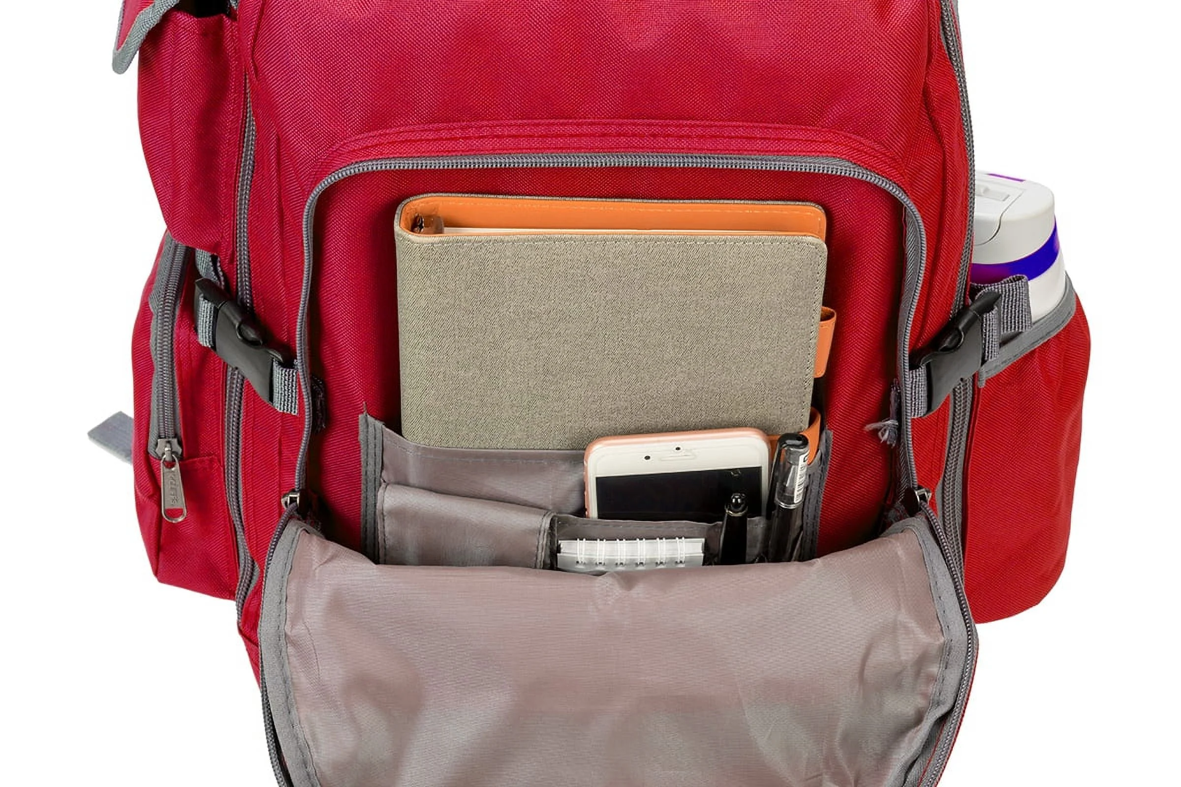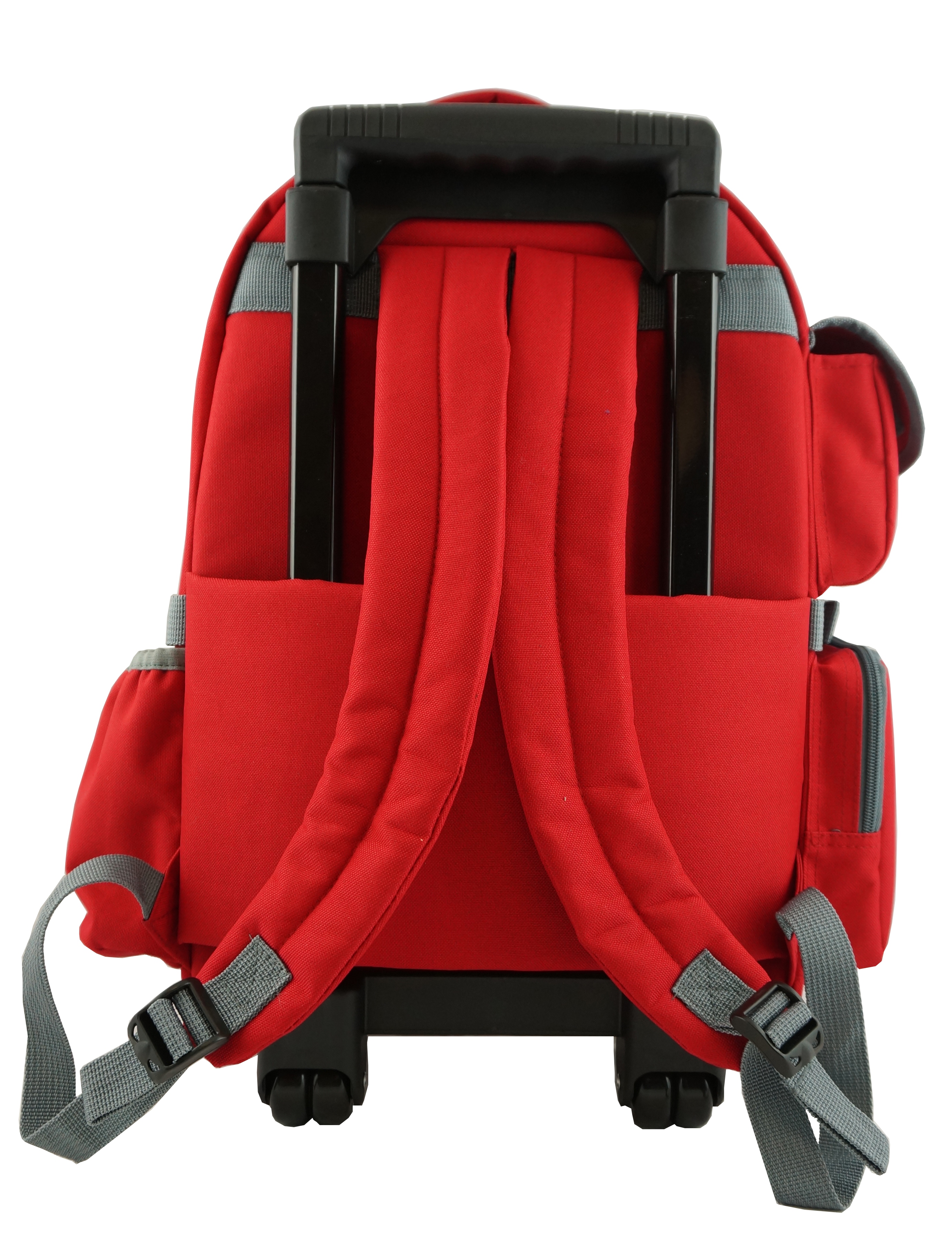 Total of 10 external pockets for keeping everything well organized. Elementary-Adult Large main compartment with dual zipper Large front pocket with Organizer Side pocket for Cell Phone and Accessories, Zippered side pocket. Durable self fabric side pocket for water bottle, fits 32oz Gatorade bottle. Extra Long 39″ handle length from ground to top.Adjustable padded shoulder straps with place to Store them while rolling. Front expandable pocket with buckle and small zipper pocket on Pocket flap. Zipper front pocket with front mesh pocket attached.Quick release compression strap on both sides of Backpack.Sturdy padded fabric handle with metal D ring on each side for extra attachments.