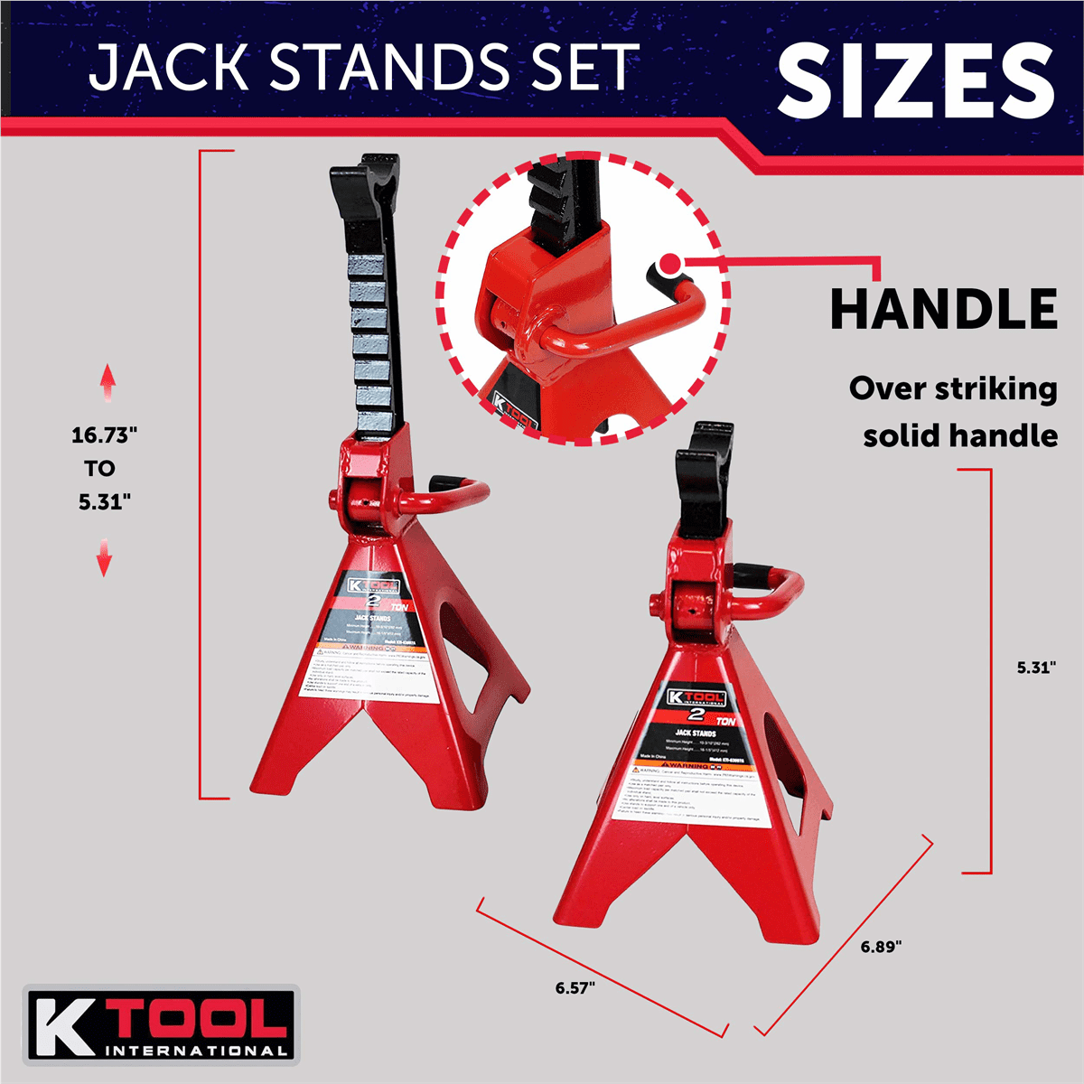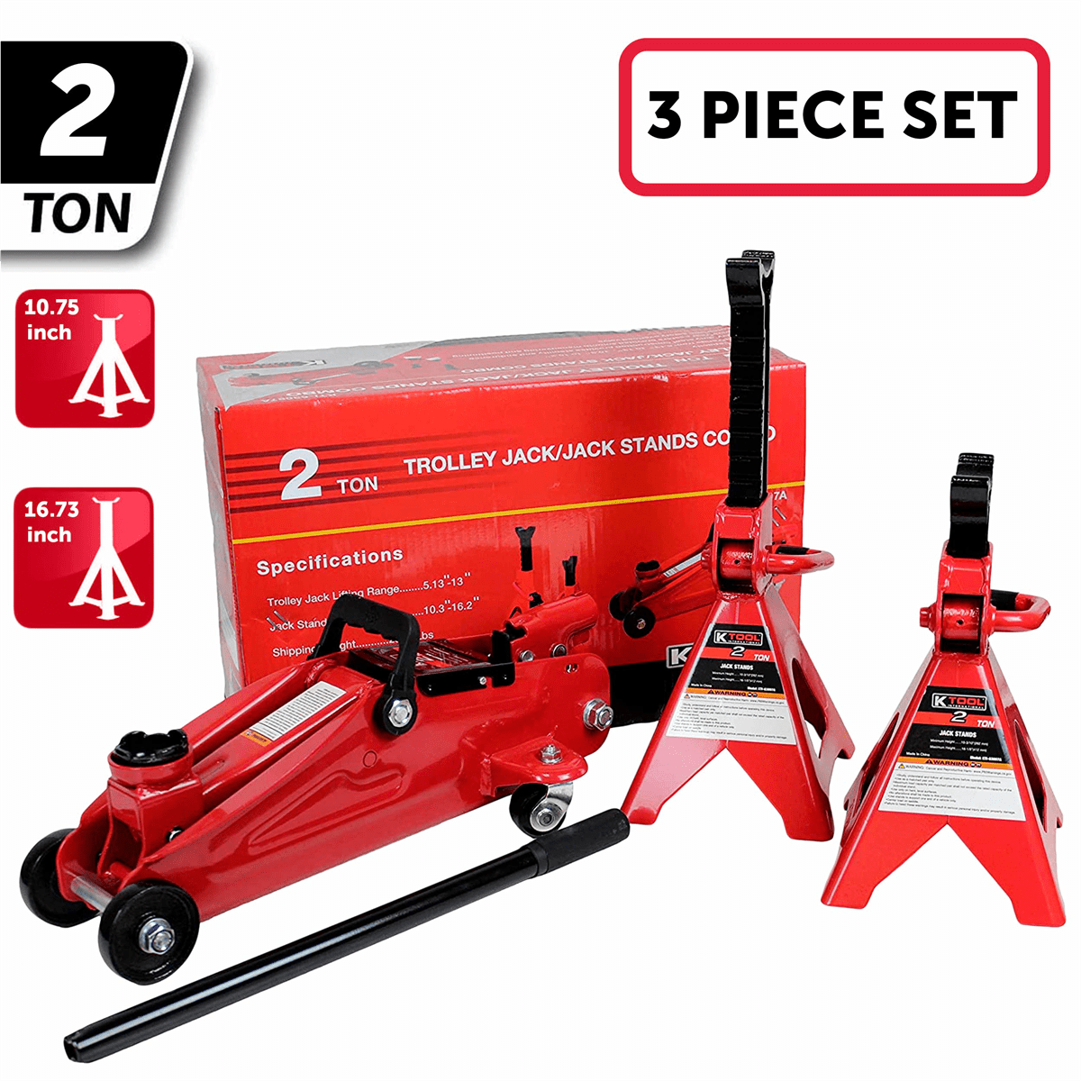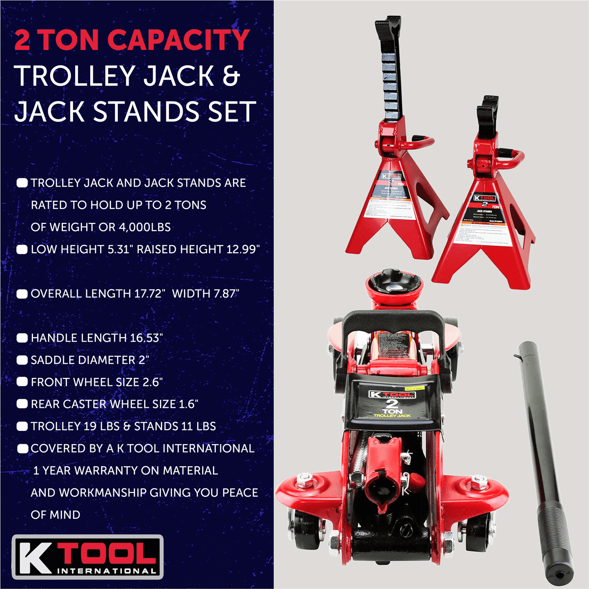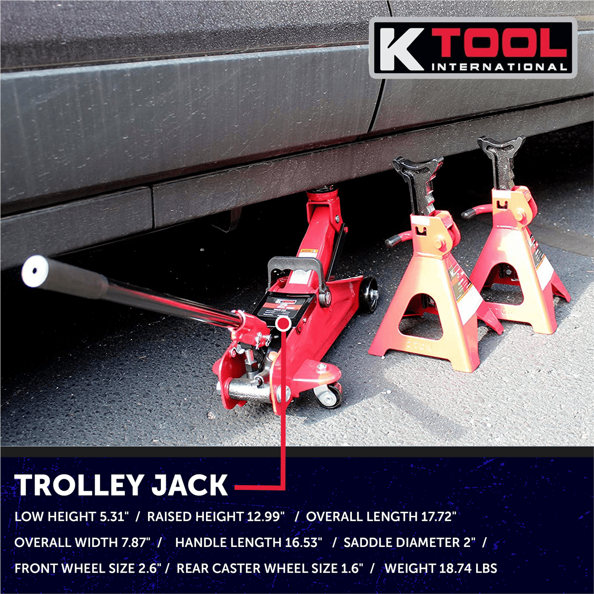 TROLLEY JACK: This 2 ton trolley jack is designed for a wide range of automotive lifting applications. Specifications include a 5.3″ minimum lifting height and a 13″ maximum lifting height DURABLE CONSTRUCTION: Crafted from heavy duty steel, this jack ensures stability and long-lasting durability for years of service EASY TO USE: Rear swivel casters facilitate quick and smooth maneuvering in your workspace. Excellent for use in automotive and mechanic shops SAFETY FIRST: Includes integrated an bypass safety valve to prevent overextension and use beyond rated capacity, ensuring preservation of the product and safety of the user WARRANTY INCLUDED: K-Tool provides a one-year warranty on material and workmanship to guarantee a worry-free purchase. We stand behind the quality of our work, so you can purchase with peace of mind