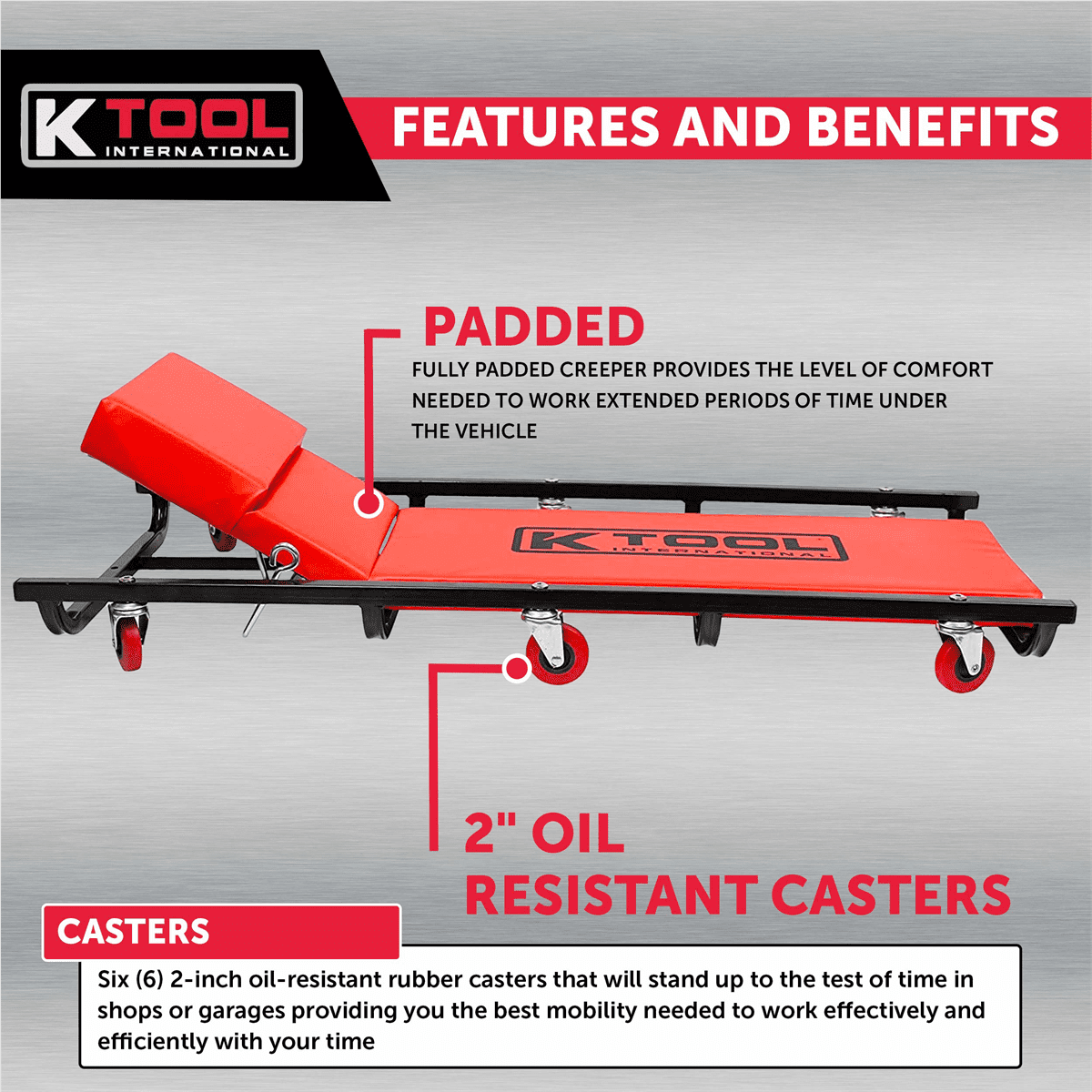 HEAVY-DUTY STEEL FRAME FOR DURABILITY: Constructed with a heavy-duty steel frame, this 40″ creeper is built to last, providing maximum strength and stability for mechanics and DIY enthusiasts working on cars, trucks, and SUVs ADJUSTABLE PADDED HEADREST FOR COMFORT: The fully padded body and adjustable headrest offer superior comfort, making long hours of underbody repairs, oil changes, and inspections more comfortable by supporting the back and neck SIX 2″ OIL-RESISTANT SWIVEL CASTERS: Equipped with six 2-inch oil-resistant rubber casters, this creeper glides effortlessly across the garage floor, allowing you to easily reposition while working under vehicles, without worrying about oil or debris slowing you down LOW-PROFILE AND ERGONOMIC DESIGN: Featuring a low-profile, ergonomic design, this creeper is perfect for fitting into tight spaces under vehicles, giving you the clearance needed to work efficiently on any automotive task PORTABLE AND EASY TO USE: The lightweight design and compact size make this creeper easy to transport and store in any garage or shop. The combination of the rolling wheels and padded seats ensures a comfortable work experience every time