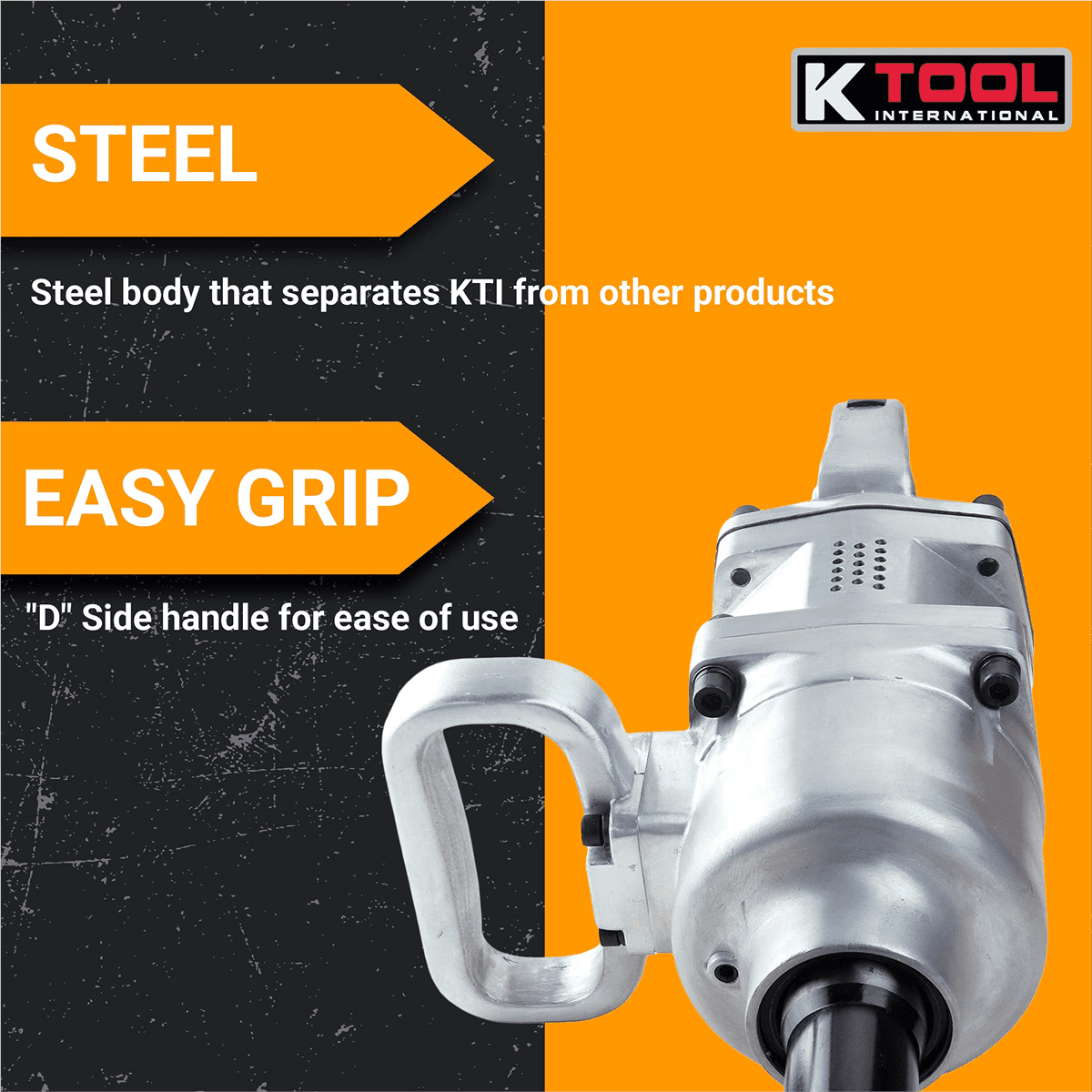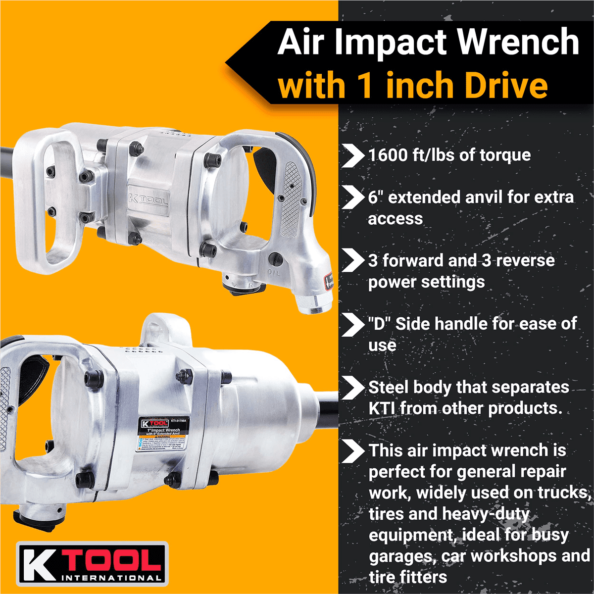 The K Tool International Air Impact Wrench is the best in the industry! This 1-inch drive impact wrench has a 6-inch extended anvil for extra access and has 1600 ft. lbs. of ultimate torque! Power and practicality all in one. The extended 6-inch anvil provides the user with extra access on the job. The “D” shaped handle is designed for ease of use. This impact wrench is not only affordable but is built using a far stronger material than many competitors. The body of this impact wrench is made of steel while many competitors use plastic AND they charge more for their product. Something about holding steel while using an impact wrench makes you know you have a superior product. Multiple settings for a variety of needed power to include 3 forward and 3 reverse power settings. This tool is a workhorse with high levels of powerful and extreme durability. Since 1984, K Tool International leads the market by ensuring that our products are rugged, reliable and reasonably priced for a variety of users and shops.