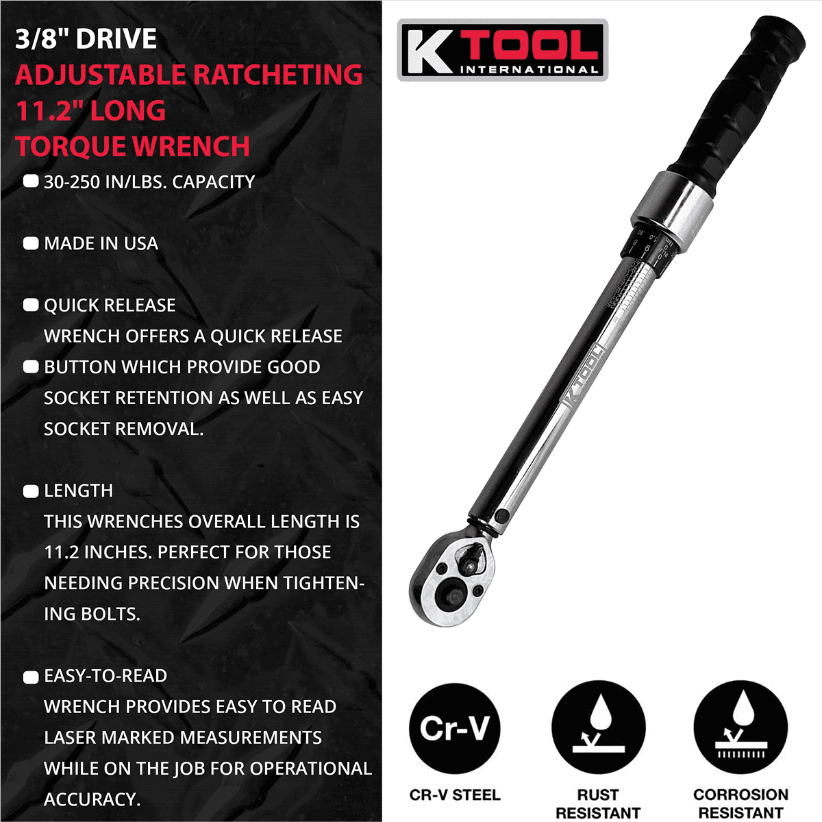 [CAPACITY] – This 3/8″ drive torque wrench provides 30-250 in/lbs capacity of torque force. [QUICK RELEASE] – Wrench offers a quick release button which provide good socket retention as well as easy socket removal. [DURABLE RATCHET] – the K Tool International tool is rugged and designed for shop use. Torque wrench was designed for accuracy, strength and reliability to tackle your toughest jobs. [LENGTH] – This wrenches overall length is 11.2 inches. Perfect for those needing precision when tightening bolts. [EASY-TO-READ] – Wrench provides easy to read laser marked measurements while on the job for operational accuracy.