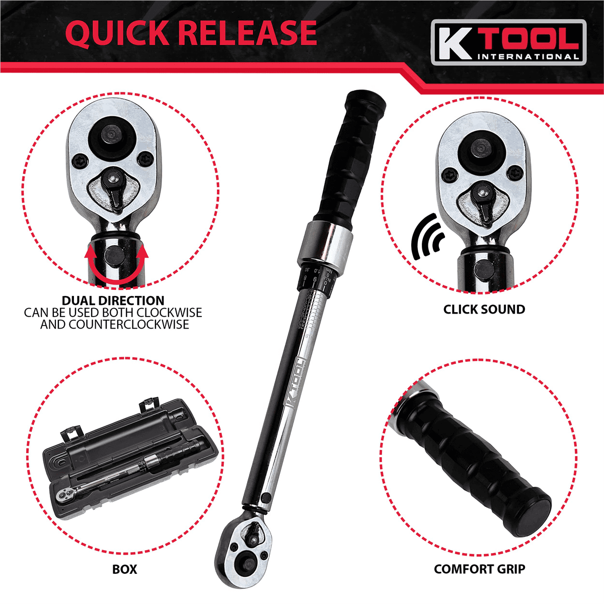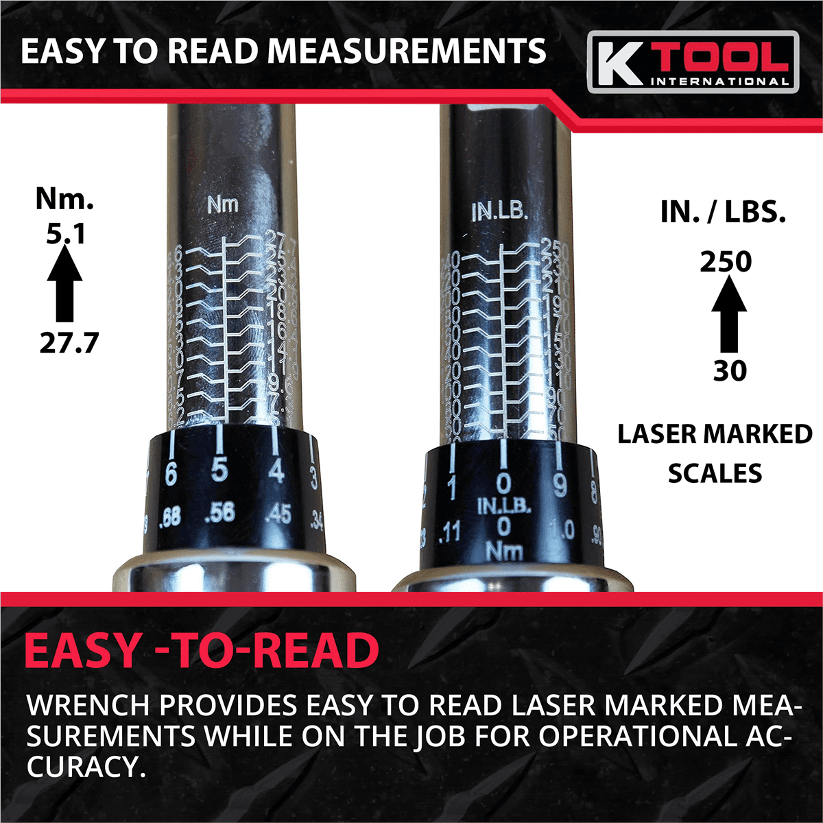 Features and Benefits:Dual scale, calibrated dual directionPositive lock with spring loaded pull down lock ringFast, accurate and easy to set with ergonomic comfort-gripEasy-to-read laser marked scalesIndividually serialized with matching certifi cate of calibration traceable to N.I.S.T.Most feature quick release buttons which provide good socket retention as well as easy socket removal (except KTI72176A)Each comes in a blow molded caseAccuracy: ± 4% clockwise ± 6% CCW of indicated value, CW, from 20% to 100% of full scaleMeets or exceeds ASME B107.14M-1994, ISO 6789 StandardsCovered by a 1-Year limited warranty