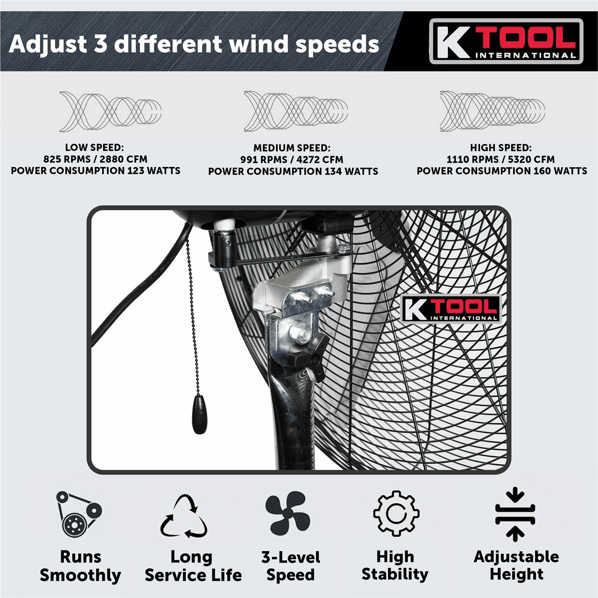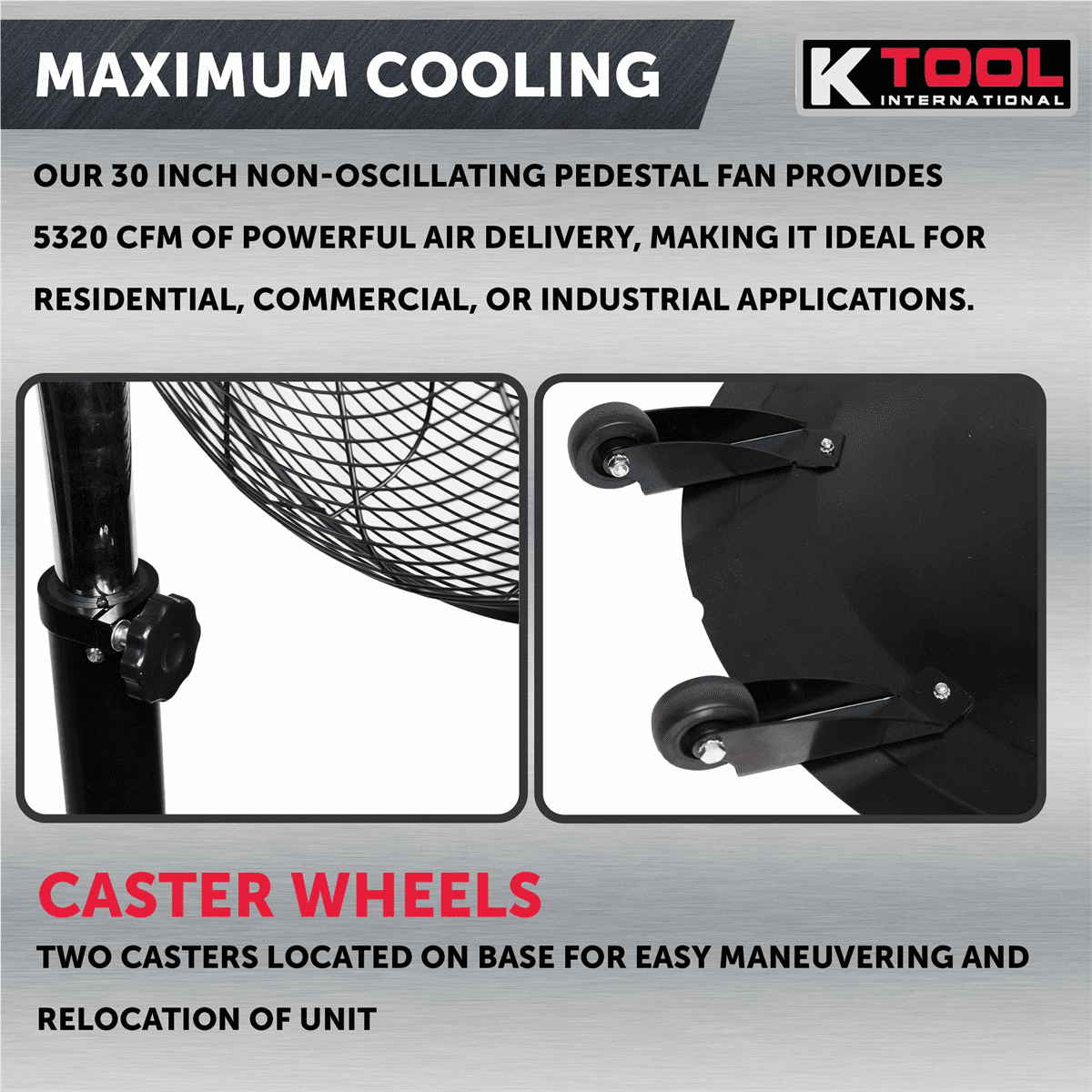 [MAXIMUM COOLING] – Our 30 Inch oscillating Pedestal Fan provides 5320 CFM of powerful air delivery, making it ideal for residential, commercial, or industrial applications. [CASTER WHEELS] – Two casters located on base for easy maneuvering and relocation of unit [3 SPEEDS] – High Speed: 5,320 CFM with power consumption 160 Watts ; Medium Speed: 4,272 CFM with power consumption 134 Watts; Low Speed: 2,880 CFM [MULTI-USE]- Oscillating function ensures coverages making it great for residential, commercial, or industrial use [HEIGHT ADJUSTABLE] – Height is adjustable up to 76 Inches