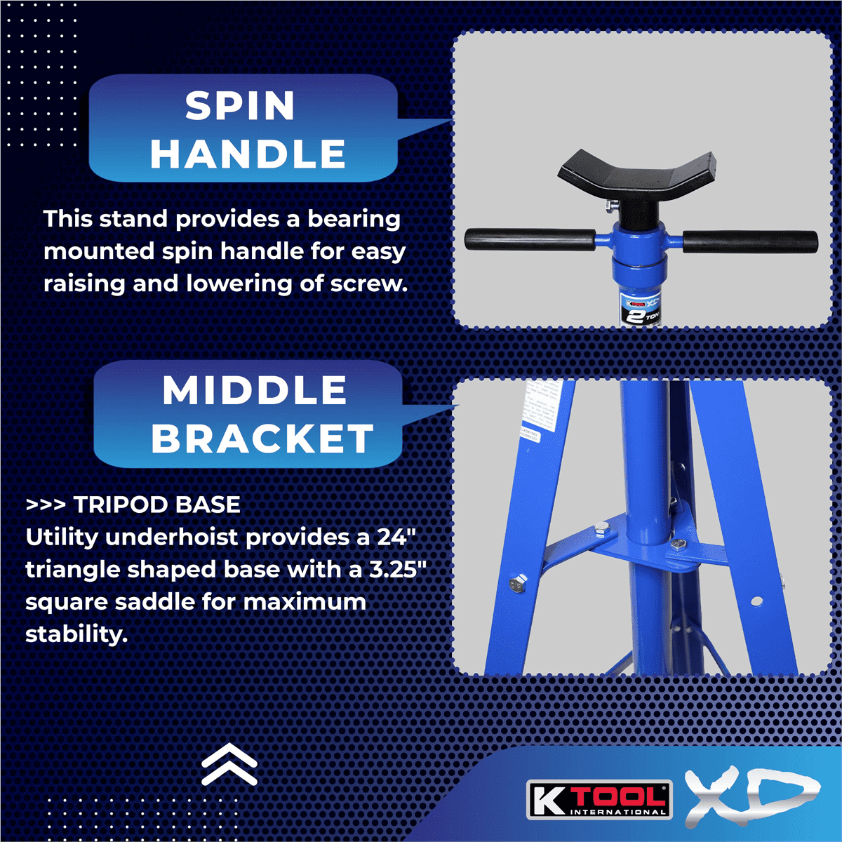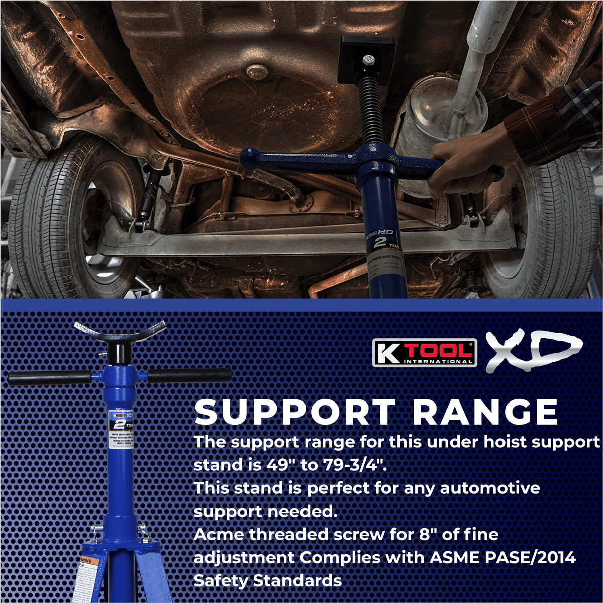 The K Tool International XD61002 2 Ton Automotive Under Hoist Tripod Stand is a vital tool for automotive repair shops, garages, and DIY enthusiasts, providing safe support for heavy vehicles with a capacity of 4,000 lbs. Its adjustable support range of 49″ to 79.75″ accommodates various vehicle heights, offering versatility for different projects. Made from heavy-duty steel, this tripod stand ensures durability and strength for professional use. The stable 24″ base enhances safety, minimizing the risk of tipping during operation, while the 3.25″ saddle serves as a secure support point for vehicle stability. Whether changing oil or performing repairs, this stand makes automotive tasks easier and safer.