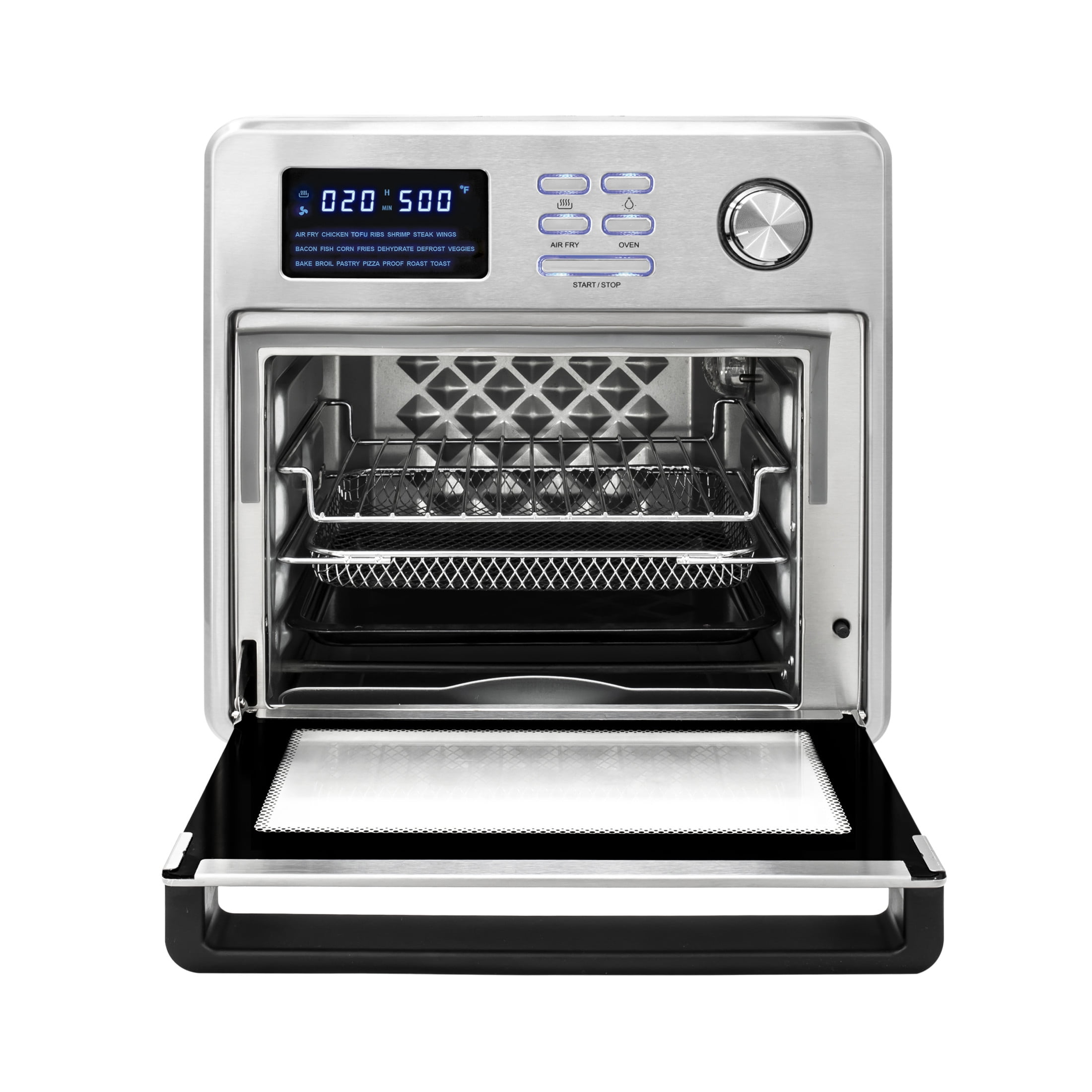 9-in-1: air fry, bake, toast, roast, grill, braise, sear, broil, and dehydrate Turbo Maxx Technology and supercharged hot airflow cook faster than ever A bright LED display with 21 smart presets takes the hassle out of cooking Air fries food to a delightful golden crisp with little to no oil, giving you all the crunch, and none of the guilt! 500 F of sizzling searing power achieves perfect caramelization on meat and veggies 16-quart capacity fits 6 slices of toast, 8-inch personal pizza Accessories are dishwasher safe, oven cavity wipes clean with a moist towel, for effortless cleanup Accessories include: air frying basket, air rack, baking tray, crumb tray, and tray handle 13.15 in D x 13.19 in H x 10.01 in W; 13.78 lb