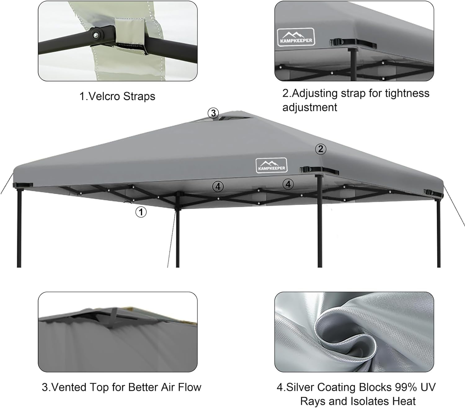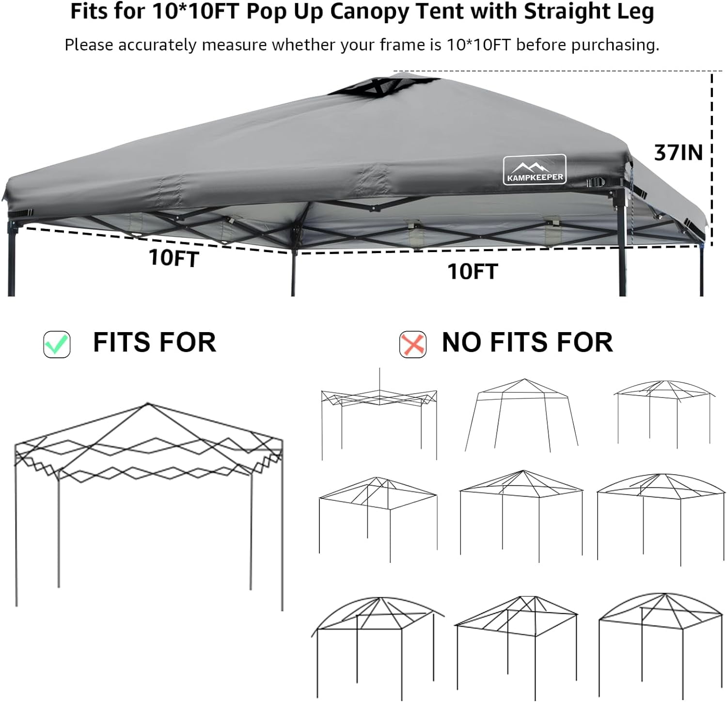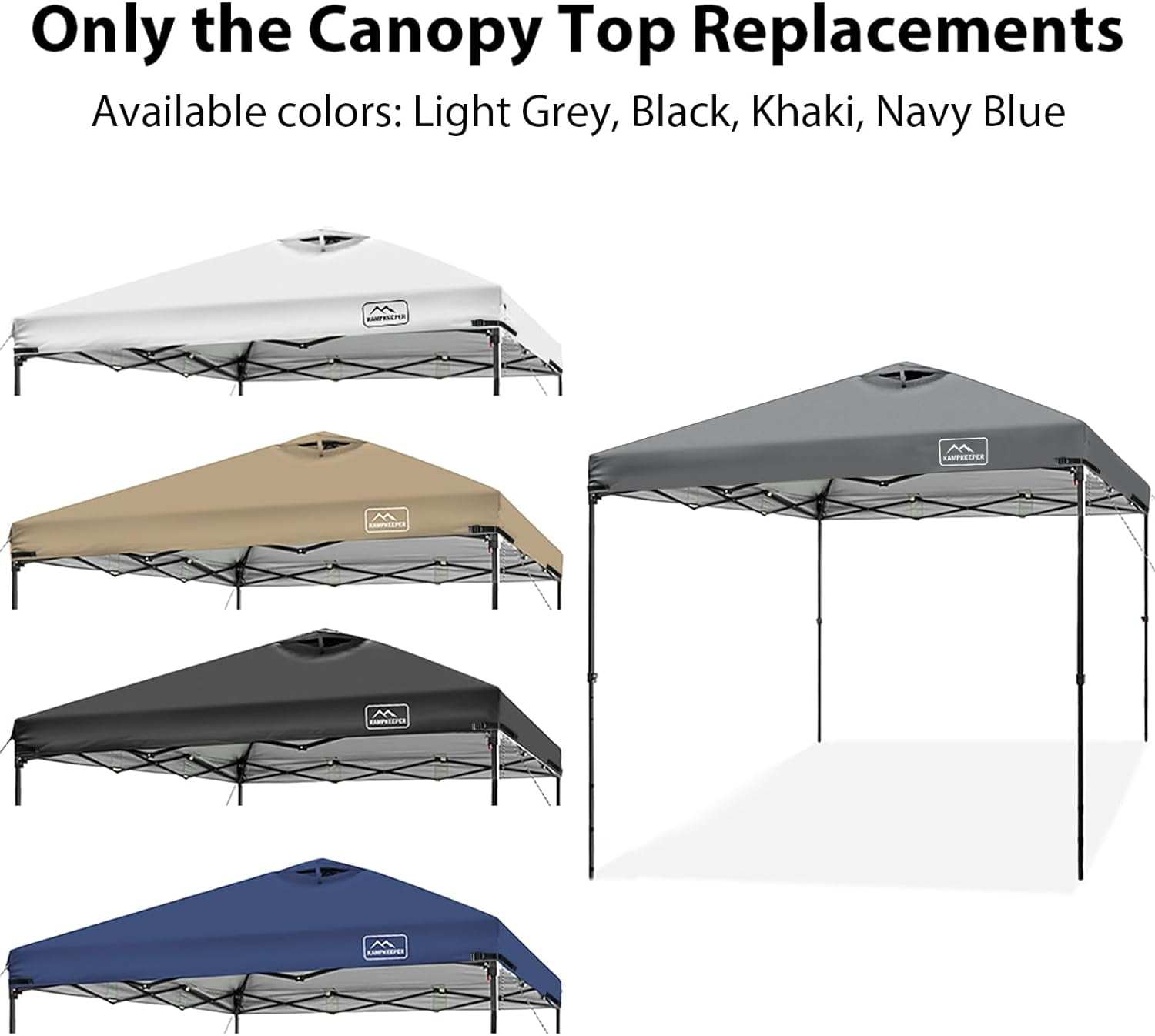 Kampkeeper 10 x 10 ft Dark Gray Pop up Outdoor Canopies, Waterproof AntiUV and Waterproof: Made of polyester with PU coating, this outdoor canopy tent top is waterresistant and effectively blocks up to 95% of the sun’s UV rays Easy to Set Up: Features multiple velcro tabs for conveniently securing the canopy top to shelter frames, allowing for quick installation in minutes. Adjustable straps at all four corners enable you to customize the tightness OneTier Replacement Canopy: Designed to fit most standard canopy frames with 4 straight foot legs, this 10x10ft canopy top is ideal for replacing a broken one or as a backup. Please measure your frame accurately, as actual dimensions may vary Roof with Air Vent: Equipped with an air vent for improved air circulation, making it suitable for commercial or recreational use, including trade shows, outdoor events, camping, picnics, parties, BBQs, and sporting events Package Details: This product includes only the outdoor canopy top replacement; the frame is not included