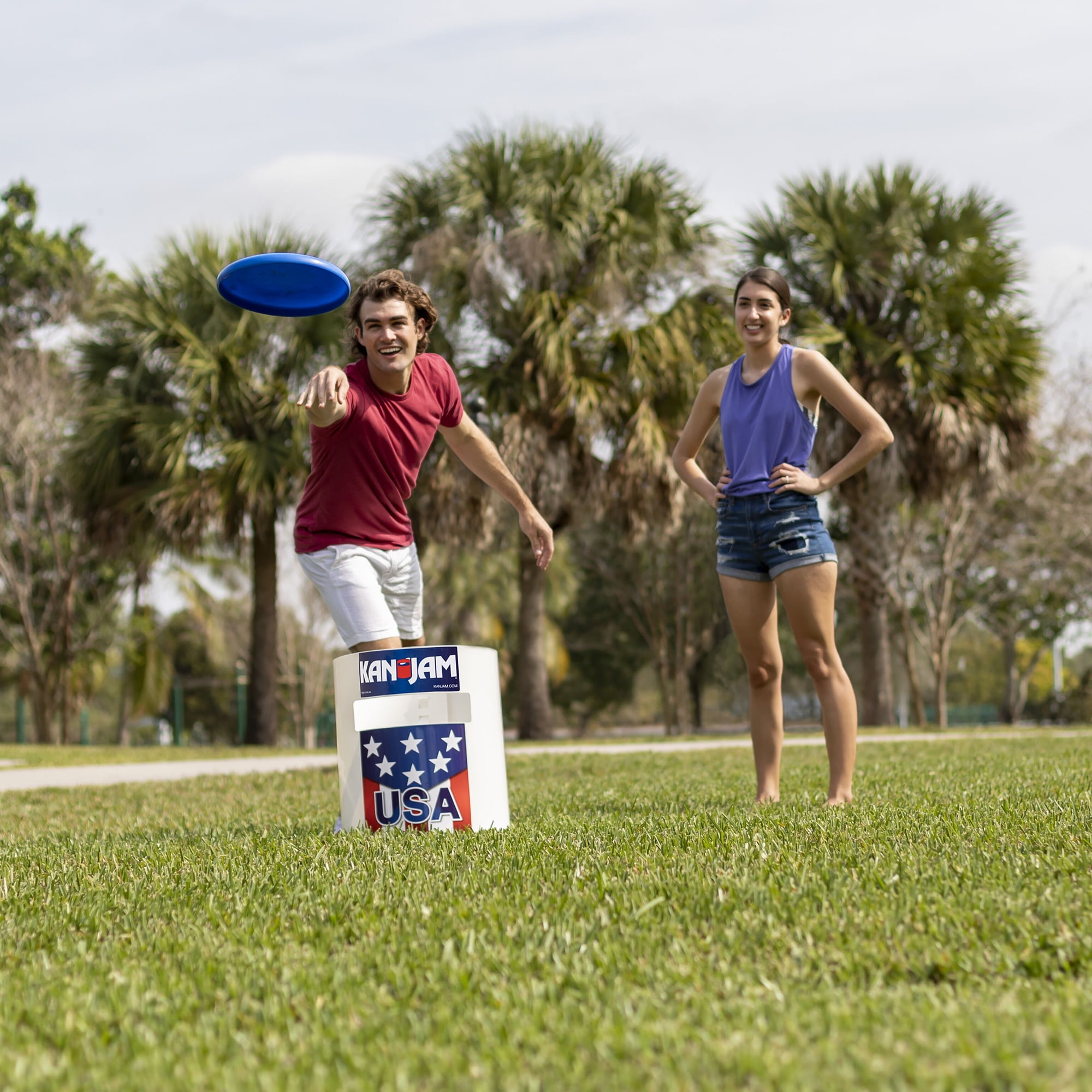 FAVORITE OUTDOOR GAME: Kan Jam is tremendously fun and a popular competitive team game similar to cornhole, washer toss and horseshoes. Great for kids and adults. HOW TO PLAY: Take turns throwing and deflecting the frisbee across the yard, beach, or park at the goal – 21 points wins, or go pro and slot the flying disc for an INSTANT WIN! EASY SET UP: So easy to set up, you can play in seconds! FOUR PLAYER ACTION: Similar to cornhole, there are two teams of two players who stand at opposite goals and work together to score points. SET INCLUDES: (2) Kan Jam USA Goals and (1) 11in. 168g Official USA Kan Jam flying disc PLAY ANYWHERE – Kan Jam is perfect for the backyard, the beach, the park, or tailgate. Kan Jam is so light weight and easy to assemble you can bring it anywhere, set up and play within seconds! EASY TO STORE: Easy to store Kan Jam in your trunk, closet or garage.