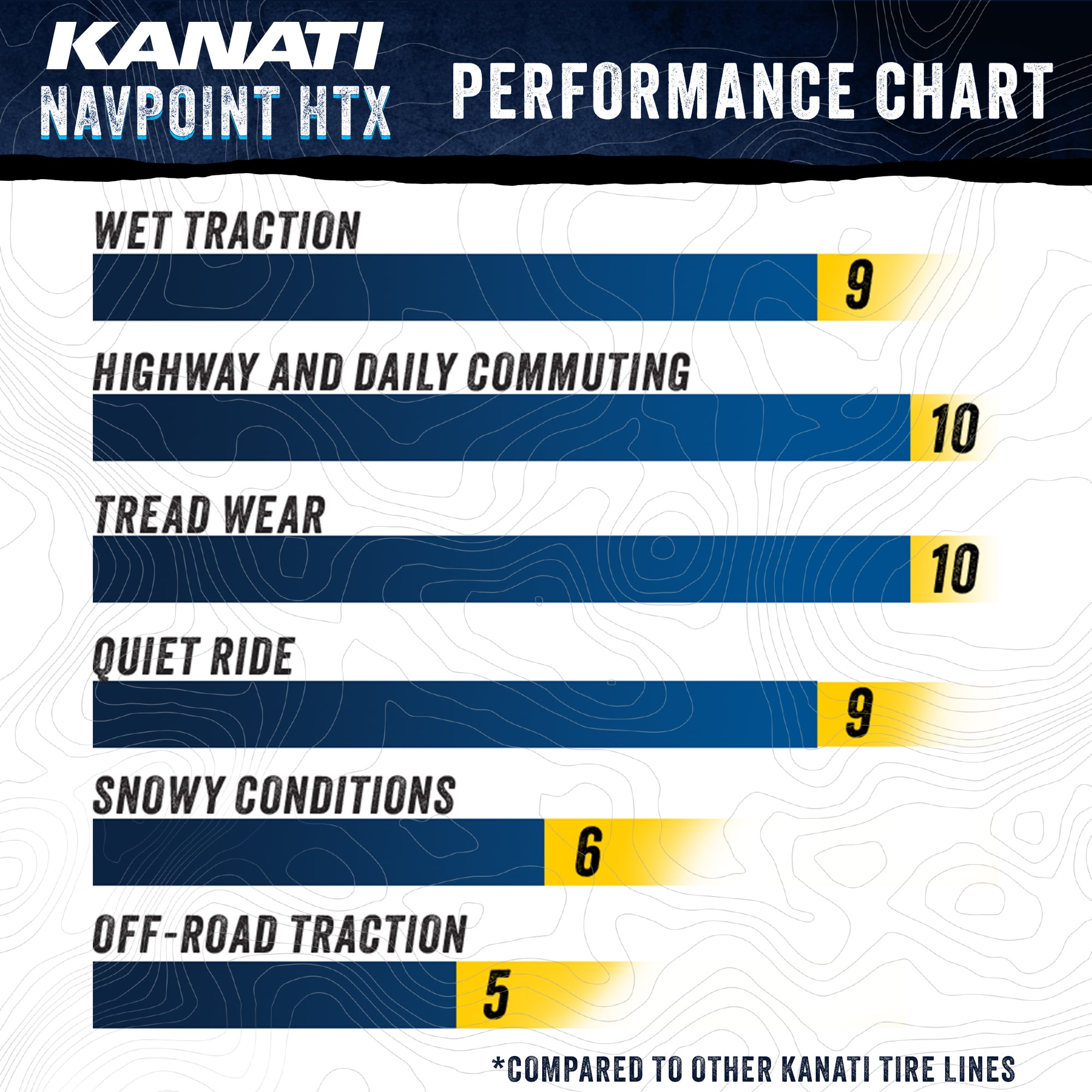 Kanati Navpoint HTX LT265/75R16 123/120R E OVERVIEW Designed for SUVs and light trucks, the Kanati Navpoint HTX is an all-season tire option as it offers enhanced grip, traction, and control on dry and wet surfaces thanks to the large tread blocks and performance siping. While the two wide longitudinal grooves clear water to avoid the risk of hydroplaning, the solid shoulder design with multiple sipes of the Navpoint HTX promotes even wear and enhanced stability and control.