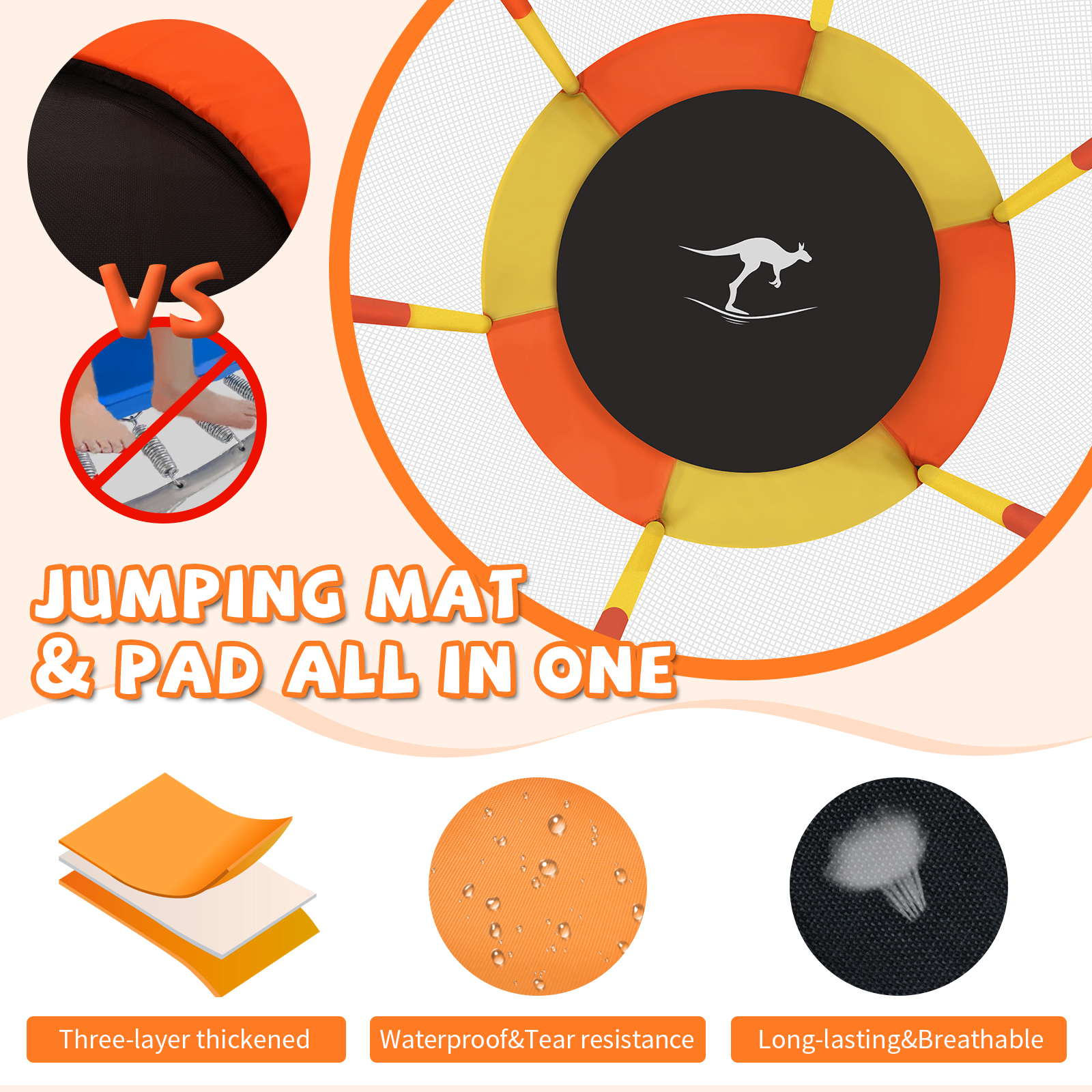 Kangaroo Hoppers aims at safety and fun. We are dedicated to making every kid jump and exercise like a kangaroo and being as safe as a baby in the pouch. This mini trampoline is a perfect recreation for kids because it can be used in children’s daily activities as well as some other exercises full of fun. Products Dimention: ★Size: 48″ X 48″ X 43″ ★Weight Capacity: 330 LBS ★Gift Parts: Basketball Hoop; Small Basketball; Ocean Ball Specification: ★Overall Steel Frame Structure: Avoids wobbling during jumping and provides kids with the 360°handle bar. ★Distance-free Design: There is no gap between the jumping mat and the safety pad. Avoid children from being stuck in the gap and offer protection for them. ★Easy Installation: The instruction manual contains detailed installation steps and warnings of product usage.