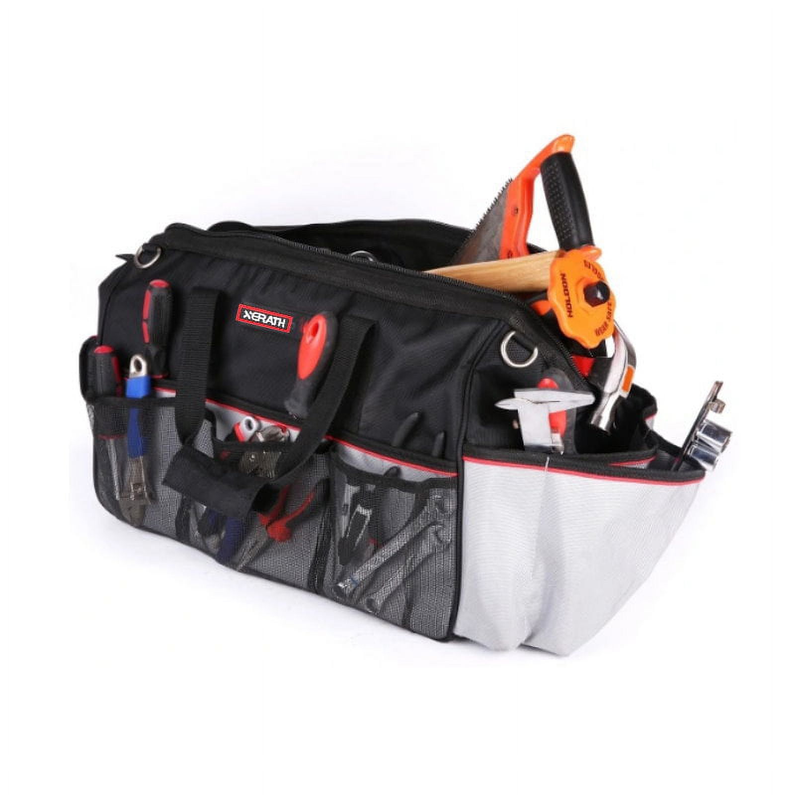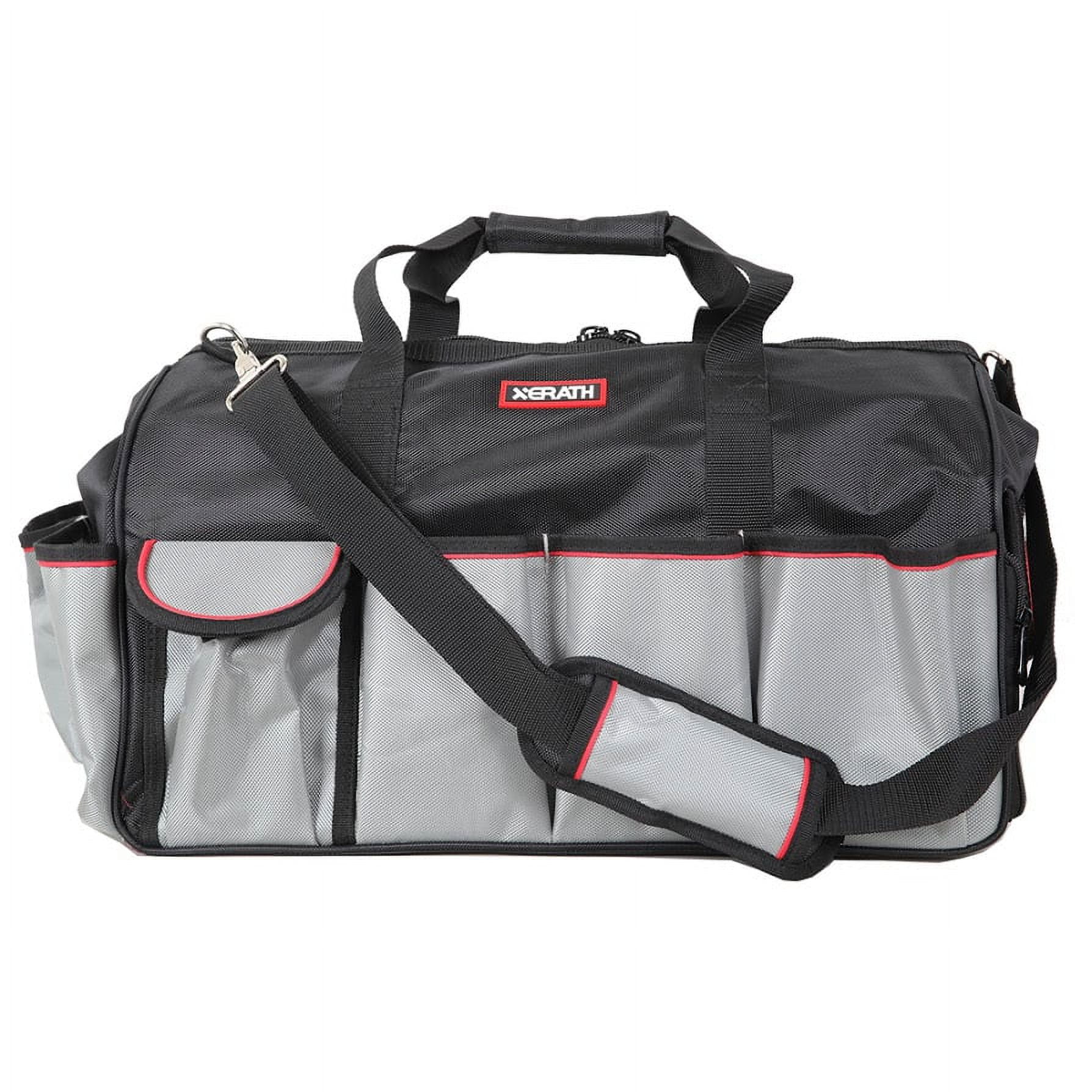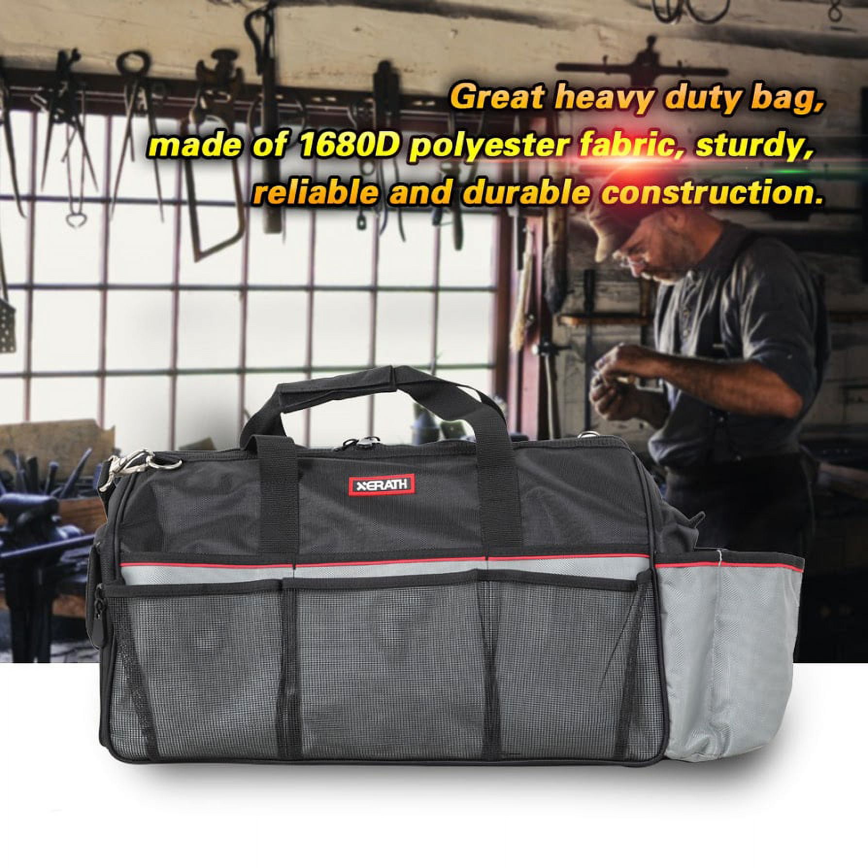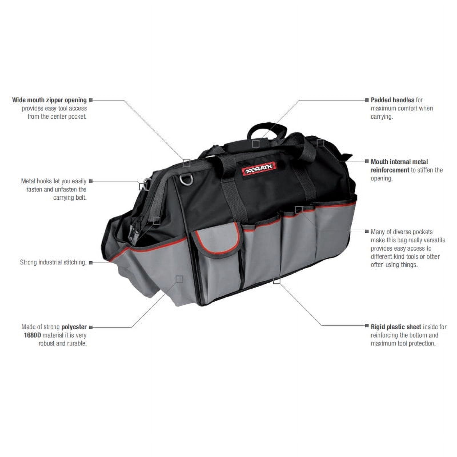 XAH-BGM09 Large Soft Tool Bag has 2 inside dividers and 13 external pockets for a range of storage uses. Constructed of 1680 denier Spun Tuff fabric for durability, the bag has a dual-zipper top with pull strings for easy opening and closing. 8 internal elastic straps accommodate a wide variety of tools and tool sizes. This bag features rigid plastic sheets inside for reinforcing the bottom and the sides. It is also provided with wide mouth zipper opening for easy tool access from center pocket.lot of space in the main compartment for your tools provide quick tool recognition. This bag features rigid plastic sheets inside for reinforcing the bottom and the sides. Feature: Metal Hooks Let You Easily Fasten And Unfasten The Carrying Belt. Padded Handles For Maximum Comfort When Carrying. Mouth Internal Metal Reinforcement To Stiffen The Opening. Rigid Plastic Sheet Inside For Reinforcing The Bottom And Maximum Tool Protection. 2 Dividers With Tape Holder Inside. Top Two Double-Pull Zipped Adjustable Shoulder Strap Wear-Resist Floor Mat Material: 1680D Polyester +PE Board+ Plastic Feet Size: 21.7″ X 11.8″ X 13.8″ Weight: 6.4 lbs