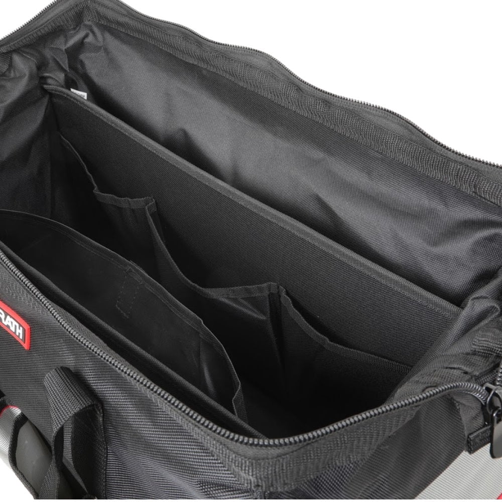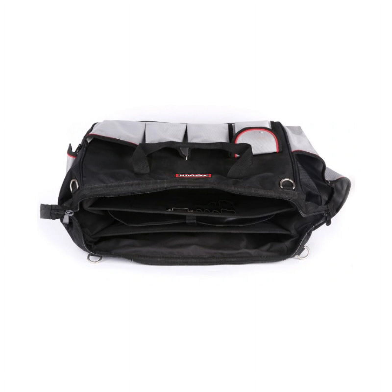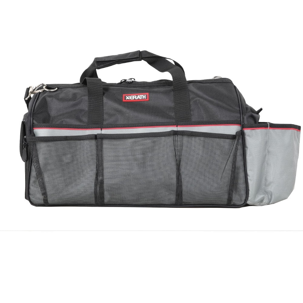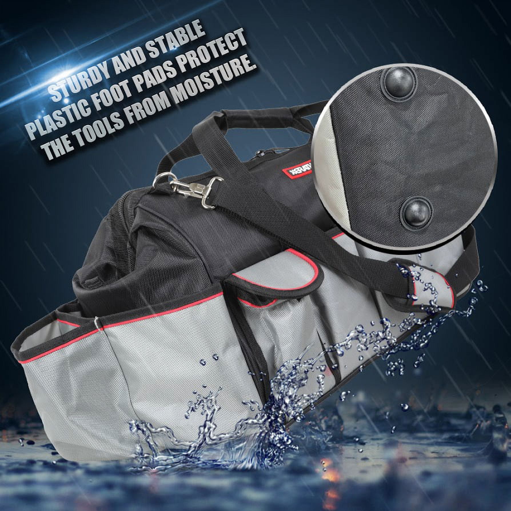 XAH-BGM09 Large Soft Tool Bag has 2 inside dividers and 13 external pockets for a range of storage uses. Constructed of 1680 denier Spun Tuff fabric for durability, the bag has a dual-zipper top with pull strings for easy opening and closing. 8 internal elastic straps accommodate a wide variety of tools and tool sizes. This bag features rigid plastic sheets inside for reinforcing the bottom and the sides. It is also provided with wide mouth zipper opening for easy tool access from center pocket.lot of space in the main compartment for your tools provide quick tool recognition. This bag features rigid plastic sheets inside for reinforcing the bottom and the sides. Feature: Metal Hooks Let You Easily Fasten And Unfasten The Carrying Belt. Padded Handles For Maximum Comfort When Carrying. Mouth Internal Metal Reinforcement To Stiffen The Opening. Rigid Plastic Sheet Inside For Reinforcing The Bottom And Maximum Tool Protection. 2 Dividers With Tape Holder Inside. Top Two Double-Pull Zipped Adjustable Shoulder Strap Wear-Resist Floor Mat Material: 1680D Polyester +PE Board+ Plastic Feet Size: 21.7″ X 11.8″ X 13.8″ Weight: 6.4 lbs