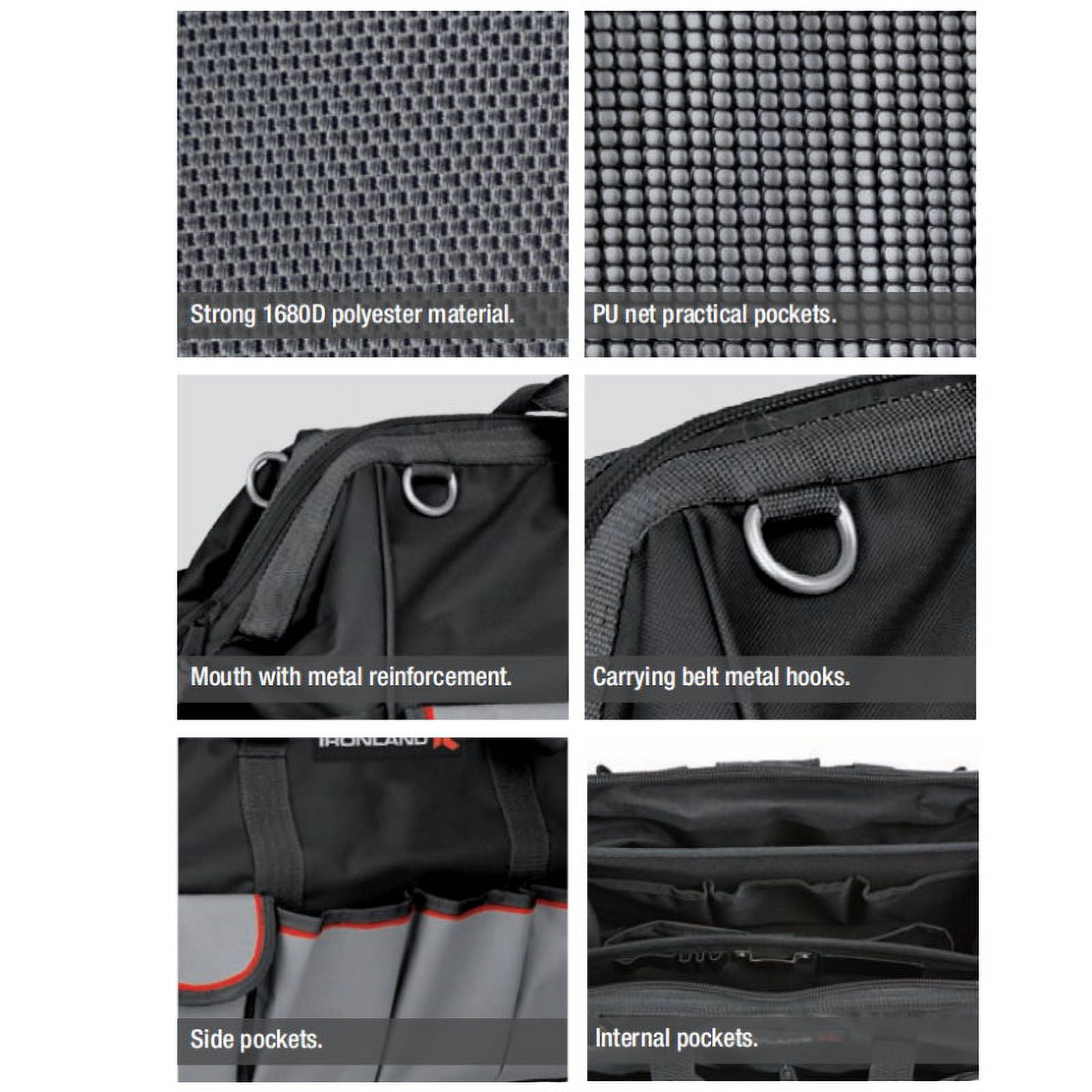 1.Metal Hooks Let You Easily Fasten And Unfasten The Carrying Belt. 2. Padded Handles For Maximum Comfort When Carrying. 3. Mouth Internal Metal Reinforcement To Stiffen The Opening. 4. Rigid Plastic Sheet Inside For Reinforcing The Bottom And Maximum Tool Protection. 5. 2 Dividers With Tape Holder Inside. 6.Top Two Double-Pull Zipped 7.Adjustable Shoulder Strap 8.Wear-Resist Floor Mat