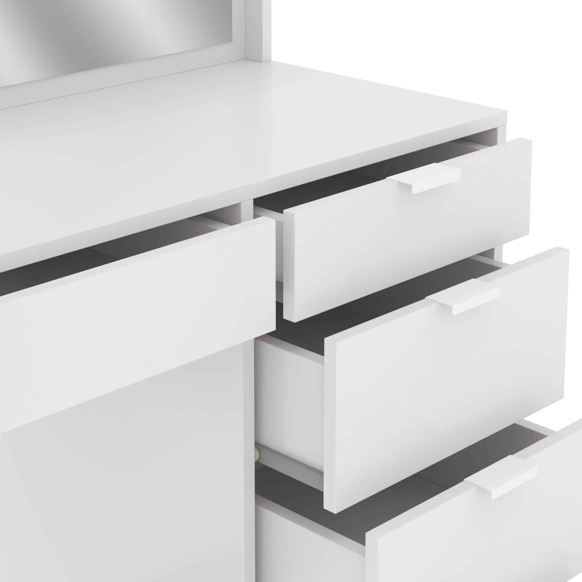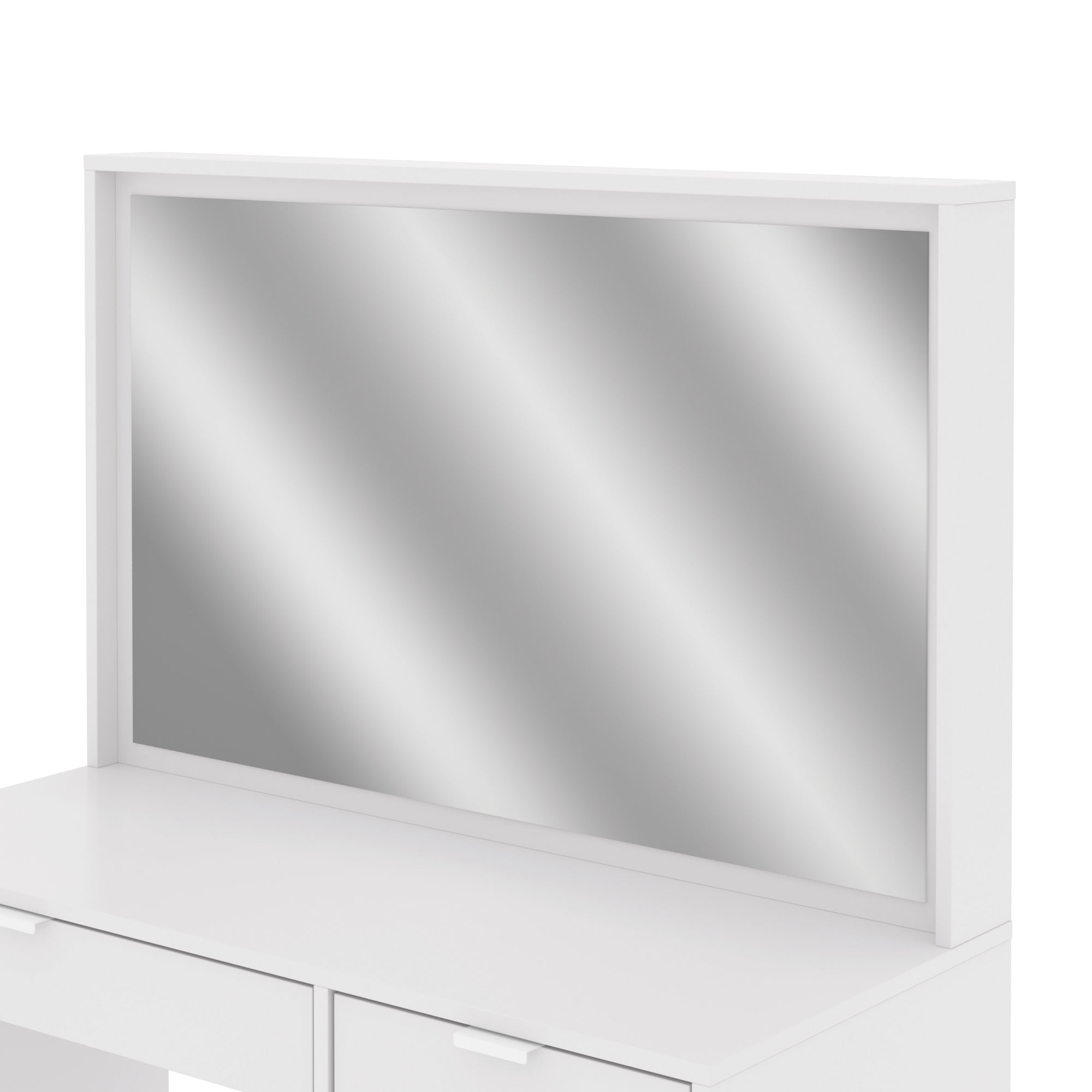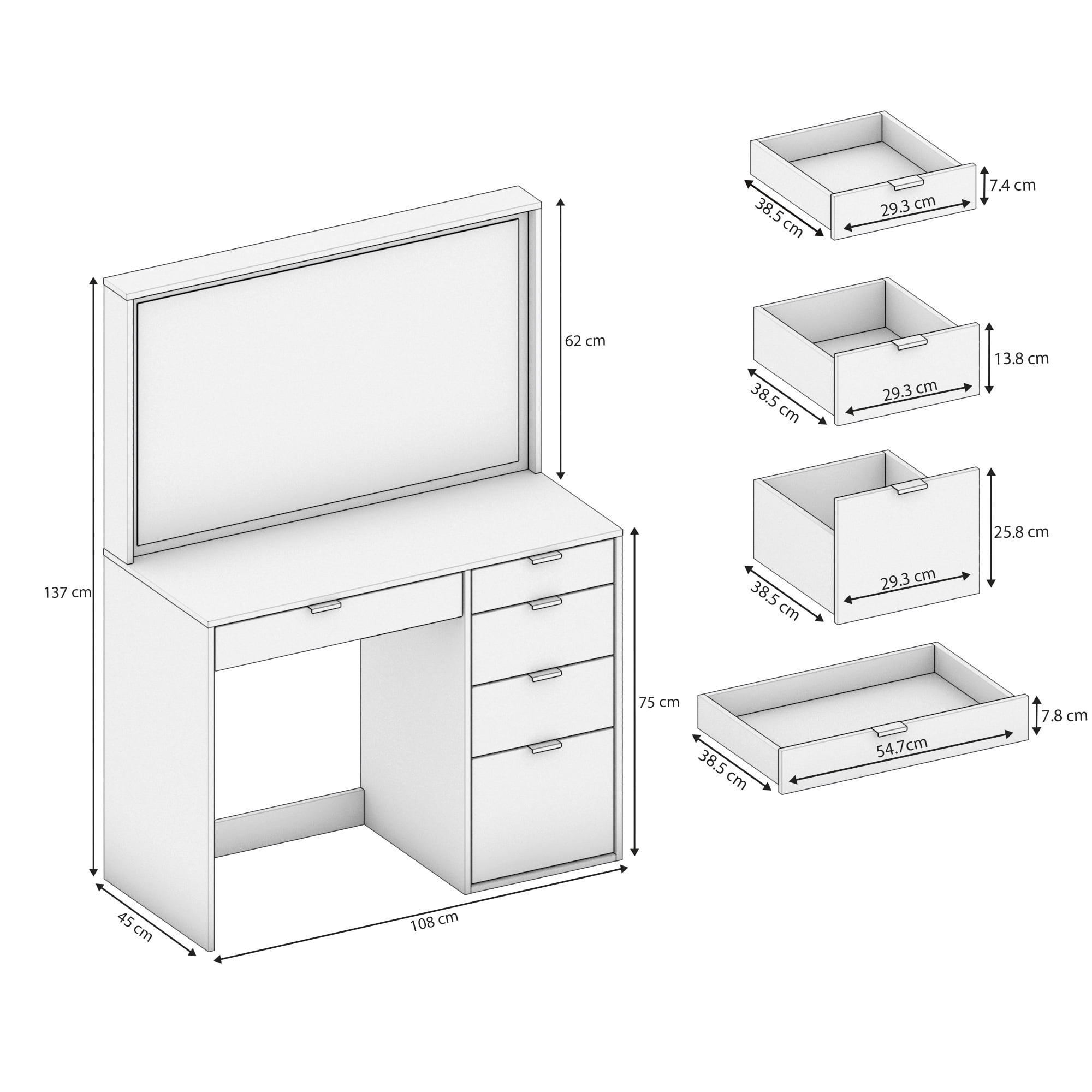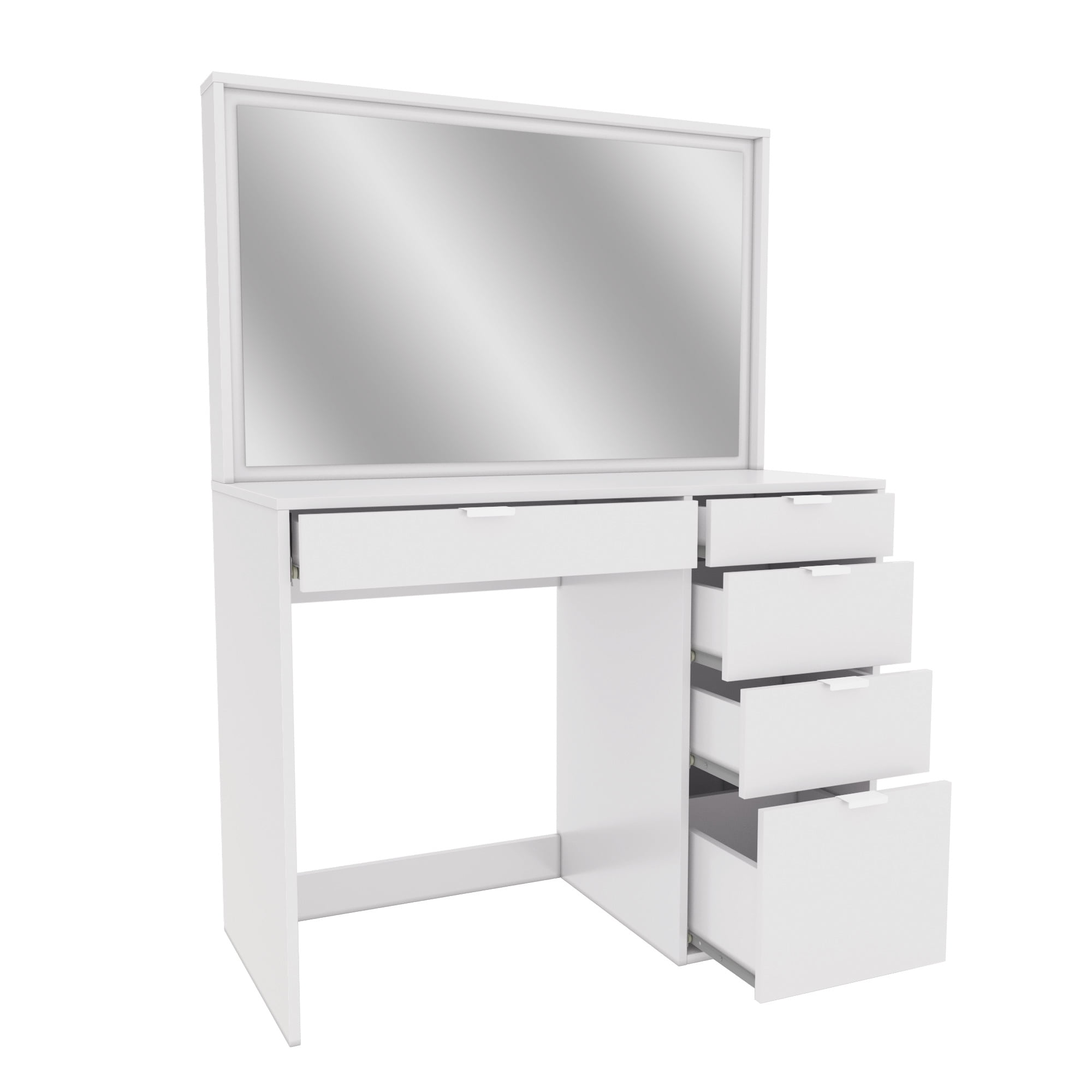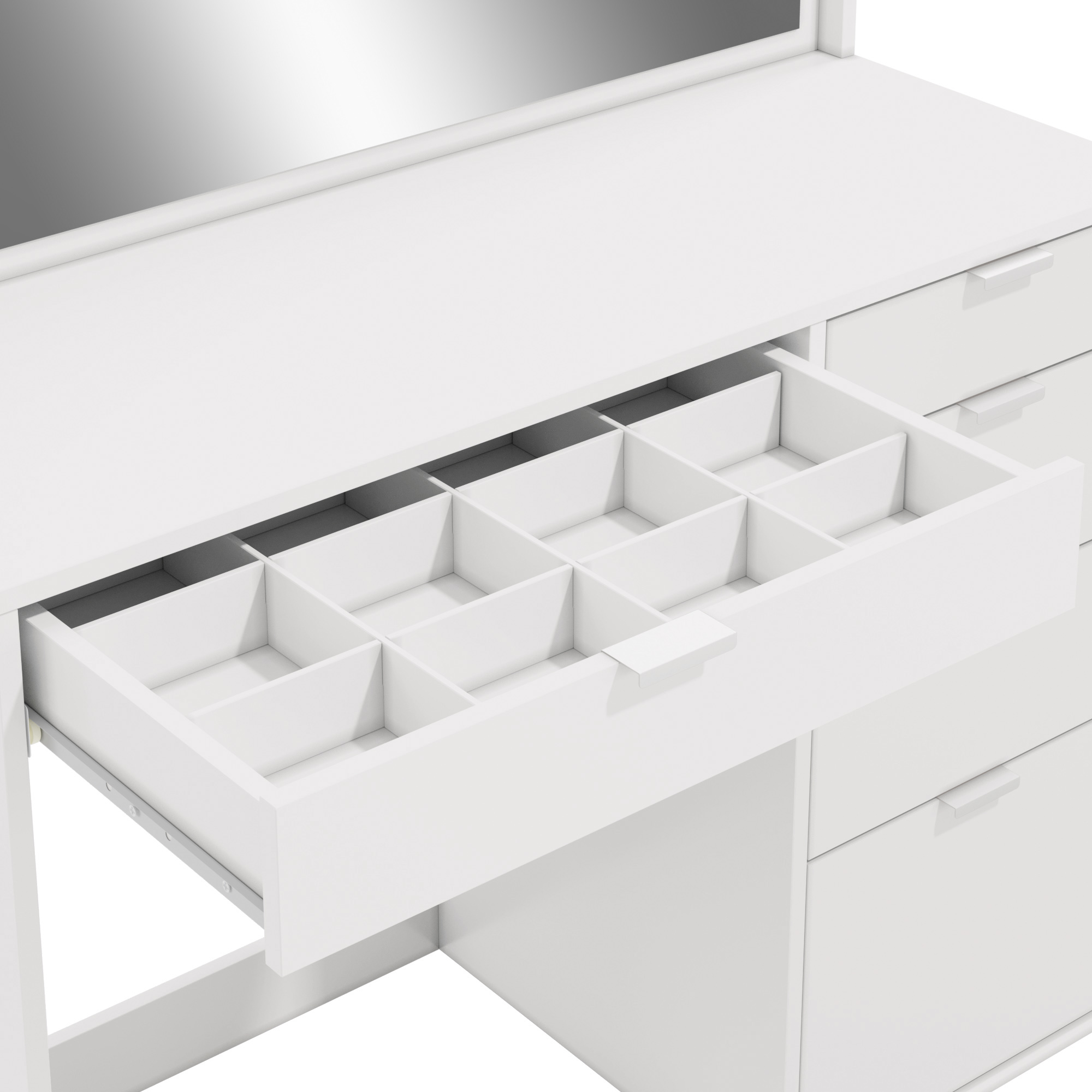 Brand: Kappesberg – Trusted brand known for stylish and functional furniture. Age Group: Adults and Teens – Designed to meet the needs of both teens and adults. Modern White Finish – Sleek, clean-lined design that fits well in any room. Five Drawers for Storage – Store makeup, skincare, and accessories with ease. Wide 42-Inch Mirror – Perfect for makeup, grooming, and daily routines. Built-In Nook for Stool – Space-saving design for adding a stool (sold separately). Spacious Tabletop – Room for beauty tools, decor, and personal items. Durable Engineered Wood – Strong material for long-lasting use. Easy to Assemble – Comes with all hardware and clear instructions.