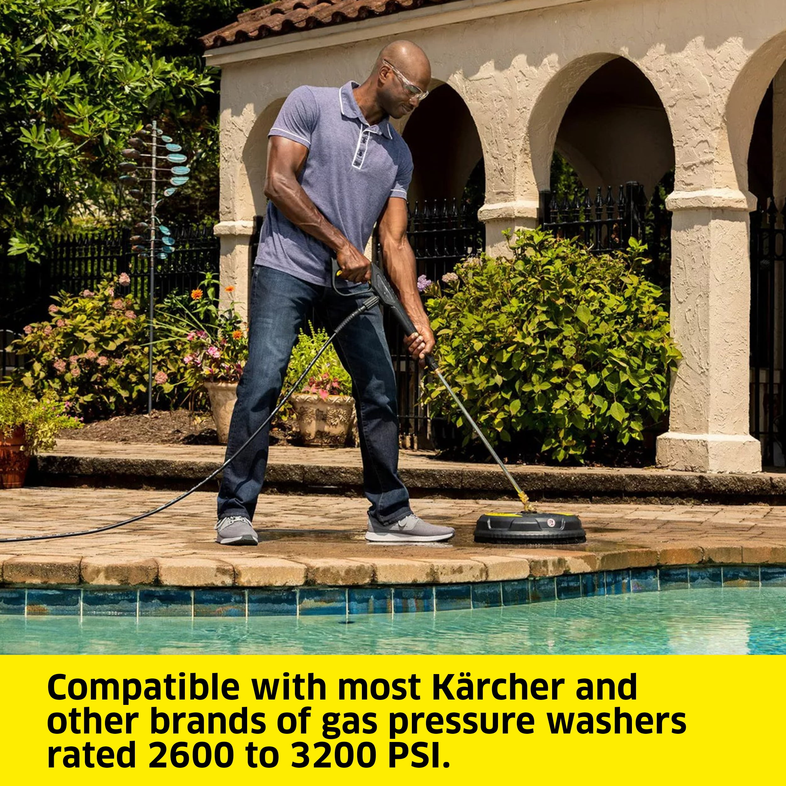 Universal Compatibility: Compatible with most Karcher & Non-Karcher gas power pressure washers rated 2600-3200 PSI, with a flow rate up to 2.7 GPM. Easily connects to wands with a standard quick-connect fitting The Karcher Promise – Cleaner. Quicker: Delivers professional level cleaning over an area wide with two high RPM spinning nozzles instead of one, significantly reducing your cleaning time Multi-Surface Cleaner: Perfect for cleaning large surfaces such as concrete, driveways, patios, decks, sidewalks and more. The Surface Cleaner can also be used to clean vertical surfaces including garage doors and home siding A Drier Cleaning Experience: The Surface Cleaner’s shroud and splash-free skirt minimize overspray, keeping you safe and dry while you clean Superior Clean: Eliminates streaks by keeping the nozzles at a fixed height from the cleaning surface, and cleans flat surfaces up to 4x faster than standard spray nozzles The Karcher Promise: Cleaner – Quicker.