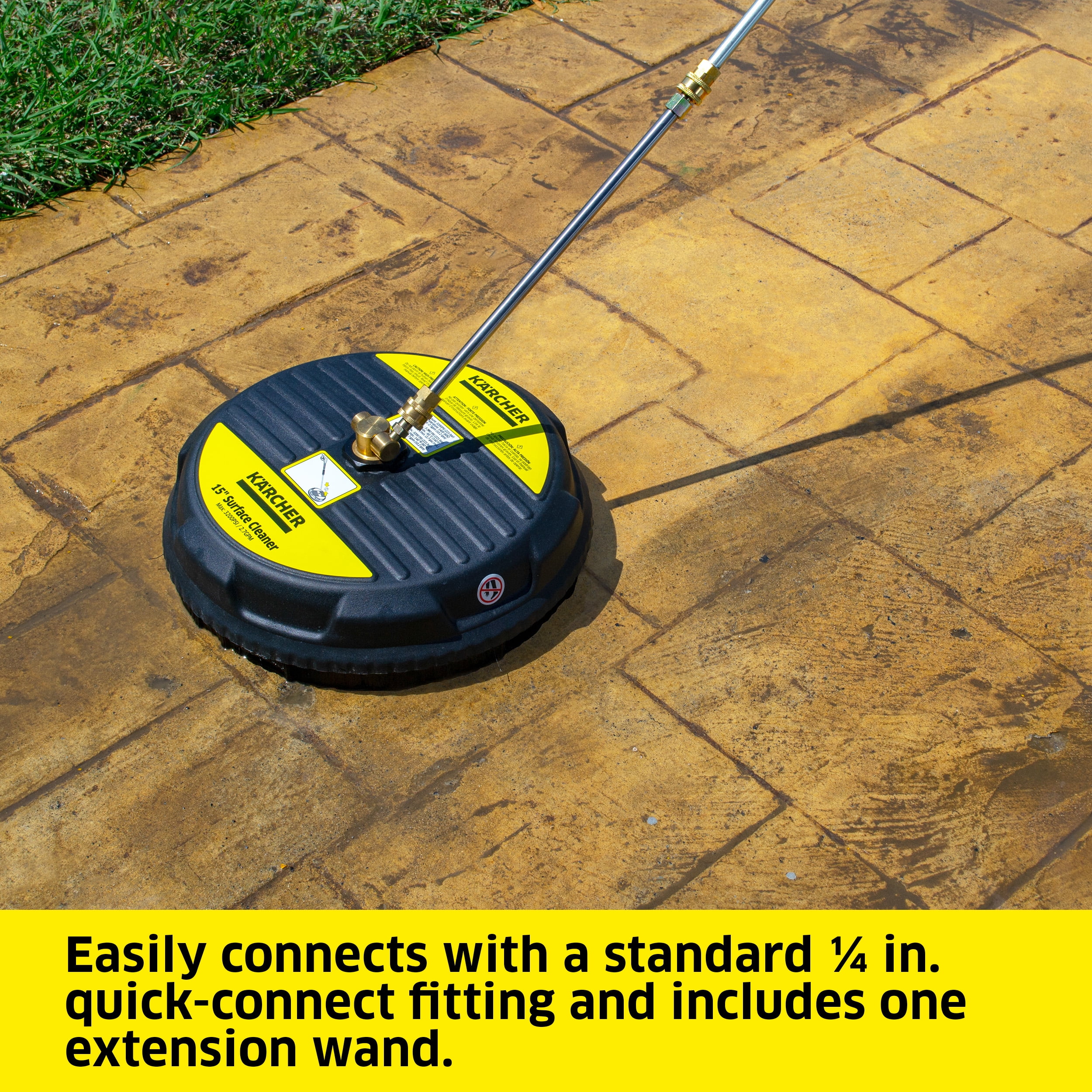 The Karcher 15″ surface cleaner works in tandem with your gas pressure washer (up to 3200 PSI) to quickly deliver professional level cleaning without splash back. It cleans an area 15″ wide with two spinning nozzles instead of one, reducing your cleaning time, & eliminates streaks by keeping the nozzles at a fixed height from the surface. Also cleans vertical surfaces including garage doors & home siding. Quick connect for compatibility with a wide range of electric pressure washers. Get Pro cleaning results with the help of Karcher 15″ surface cleaner.
