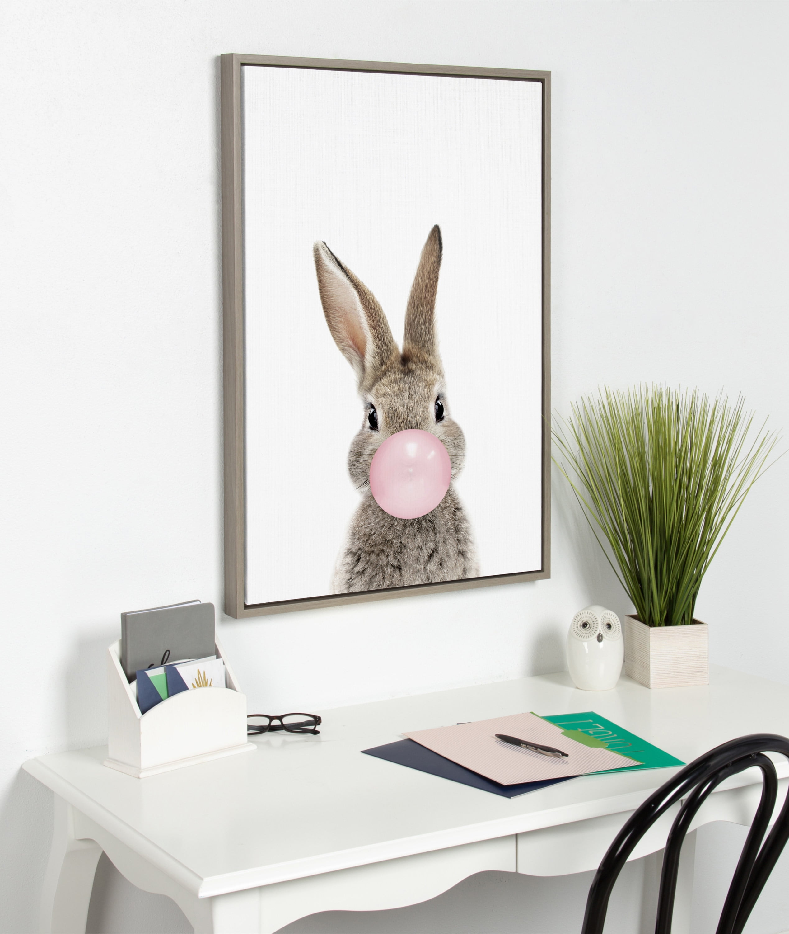 TRANSITIONAL CANVAS WALL ART: Baby rabbit art on framed high quality gallery-wrapped canvas. Print name: “Bubblegum Bunny” by Amy Peterson EASY TO HANG: Metal sawtooth hangers come attached on the inset MDF back for easy wall display LARGE SIZE CANVAS: The frame is lightweight polystyrene with display dimensions of 33 inches by 23 inches LOCALLY FRAMED: Gallery wrapped canvas is printed with fade resistant inks and framed in Waunakee, Wisconsin, USA of domestic and imported parts ARTIST DESIGNED: Print “Bubblegum Bunny” ©2021 Amy Peterson