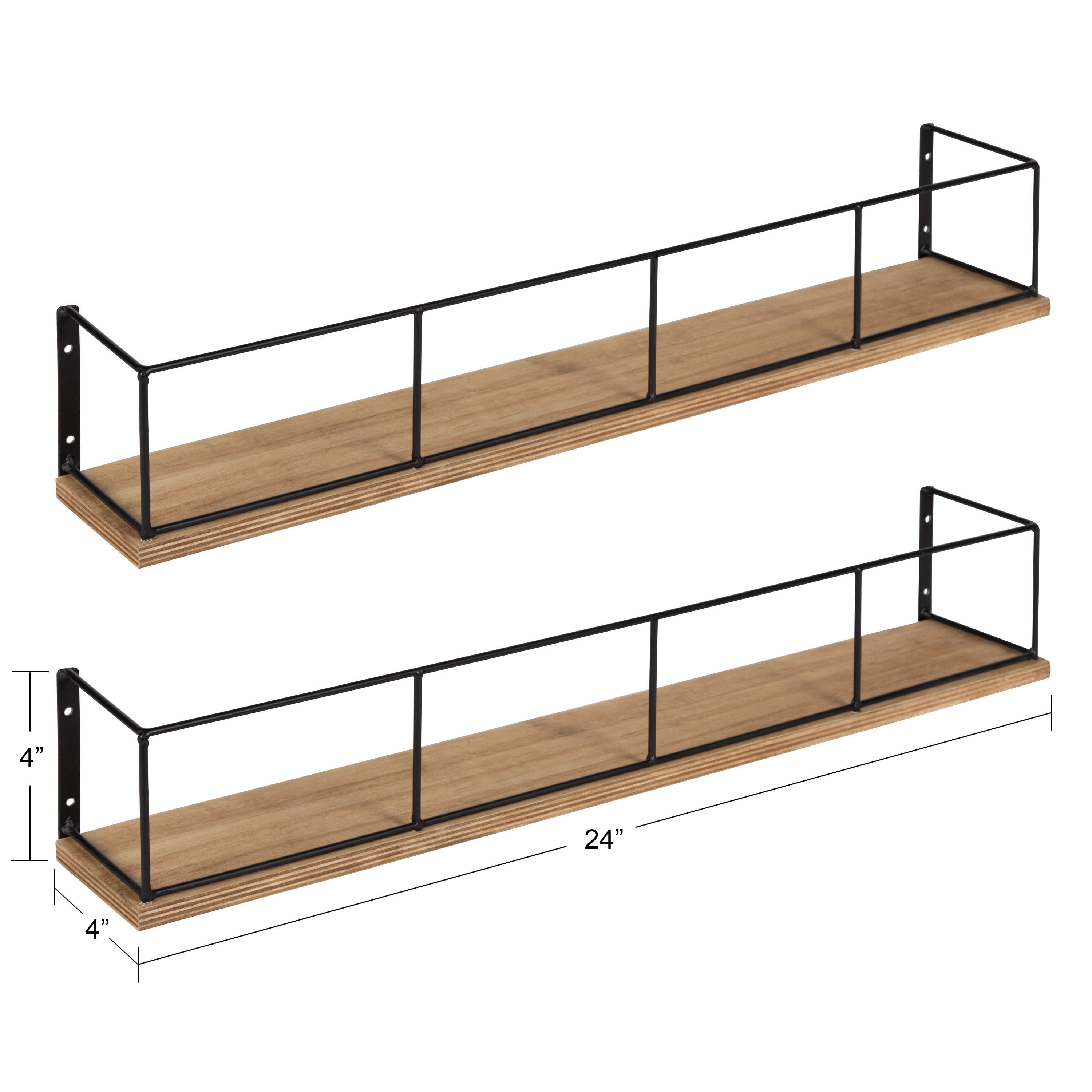 Decorative metal and wood hanging wall shelves for modern design in your home or office Hang these shelves on the walls in any room of the home for beautiful decorative accents and organization Wall display dimensions for each shelf are 24 inches wide by 4 inches deep by 4 inches high Shelves arrive completely assembled ready for display; Holes are pre-drilled on the metal frame for secure wall display Accent shelves are constructed of metal with sturdy wood bases
