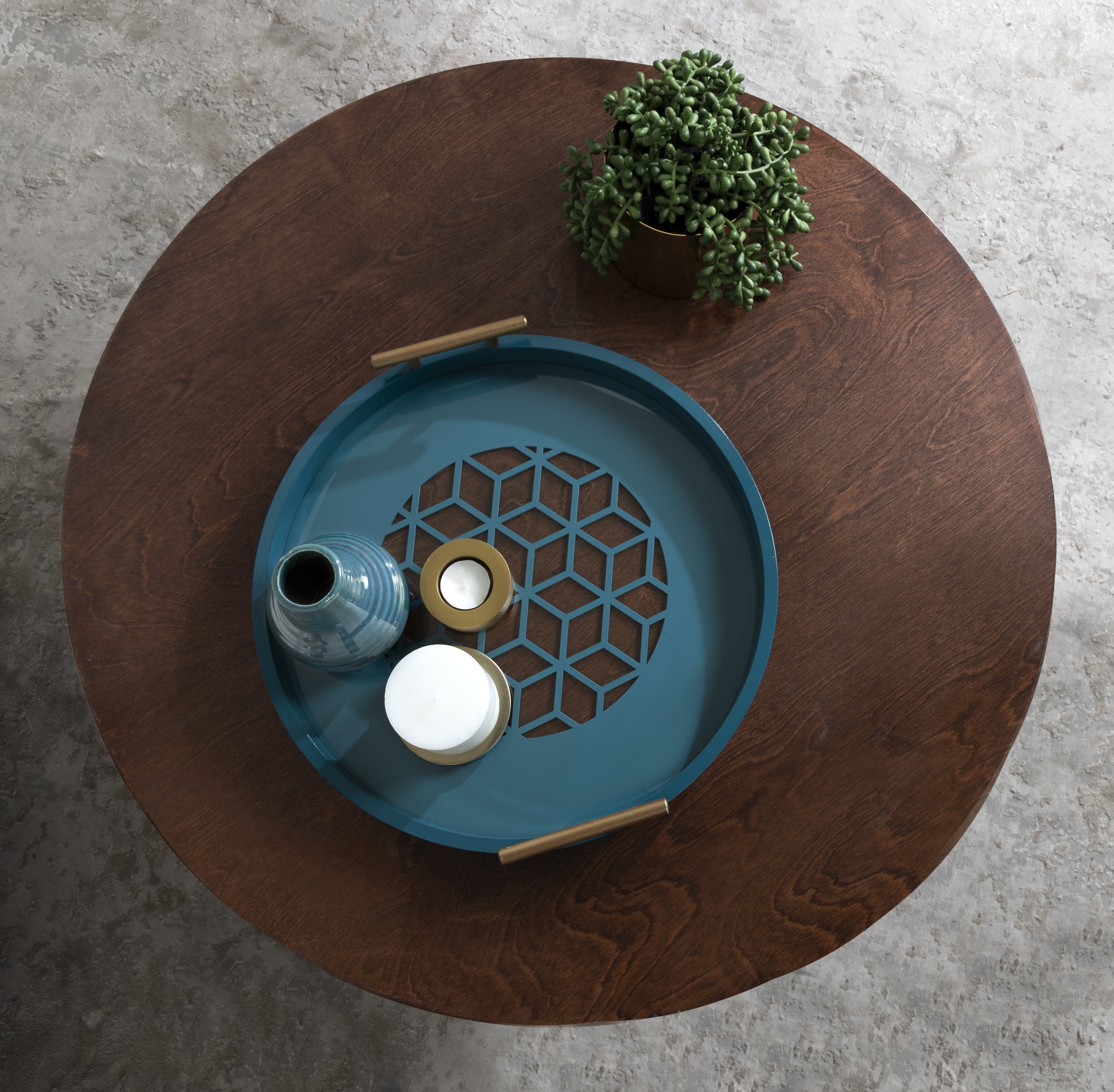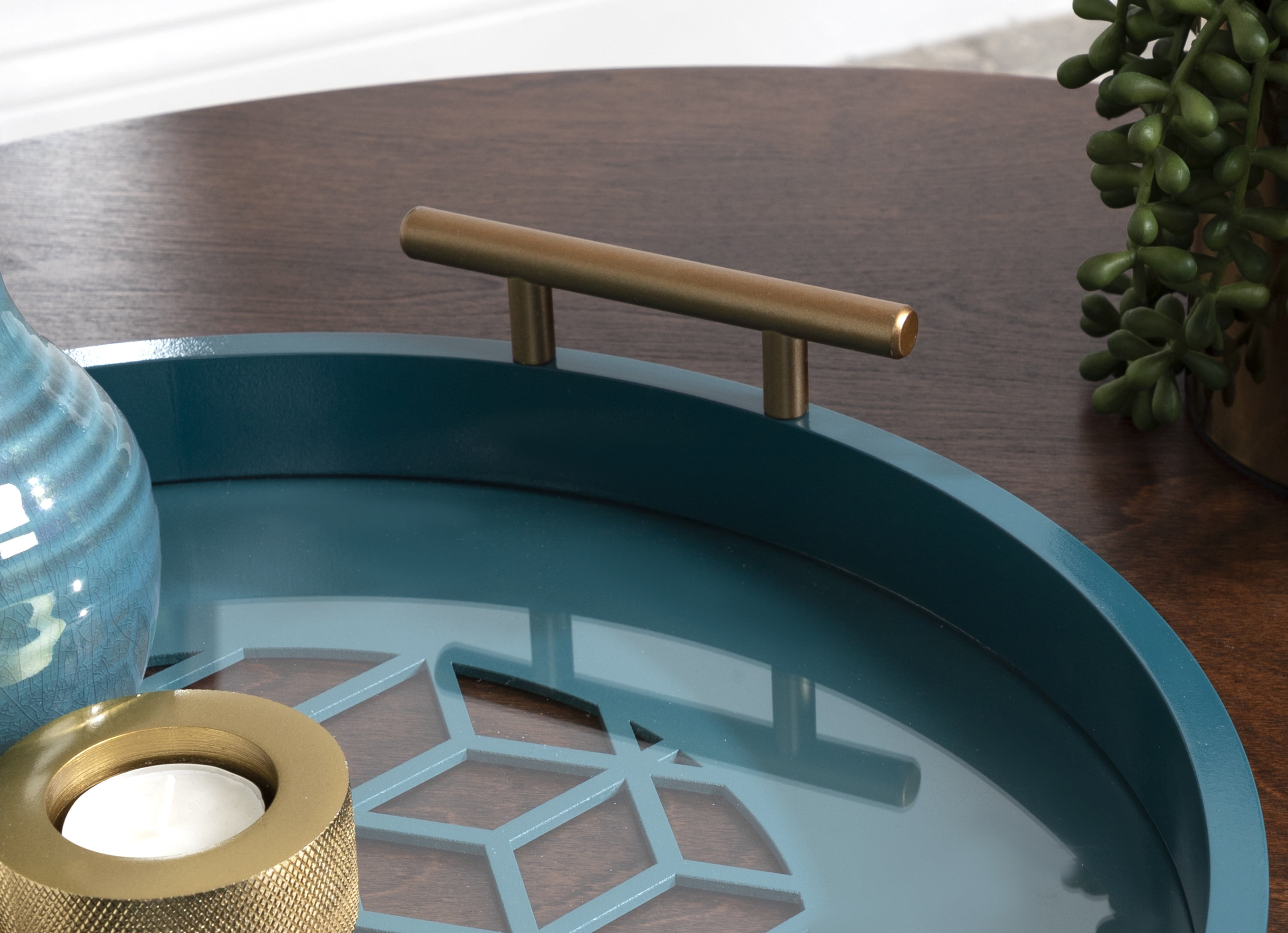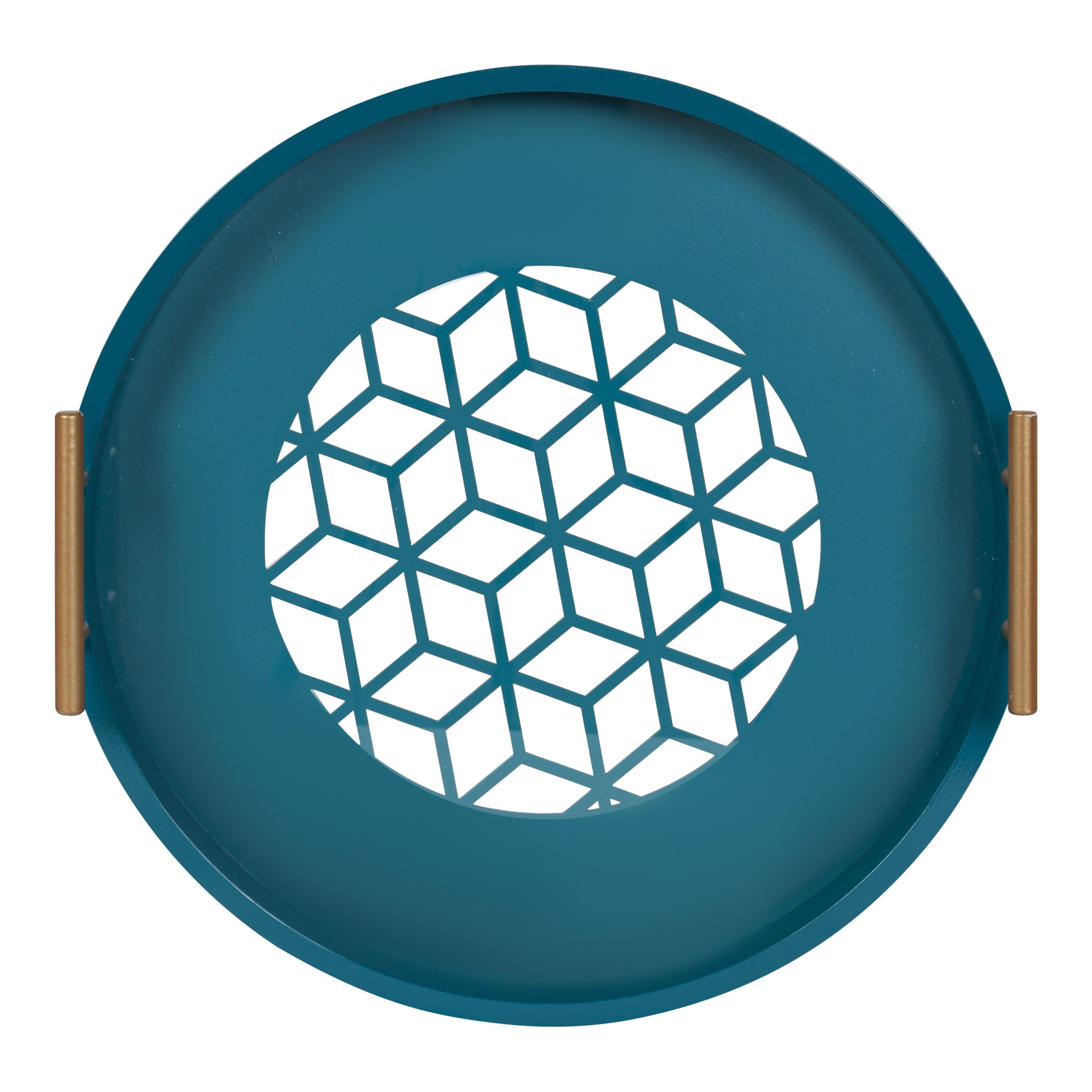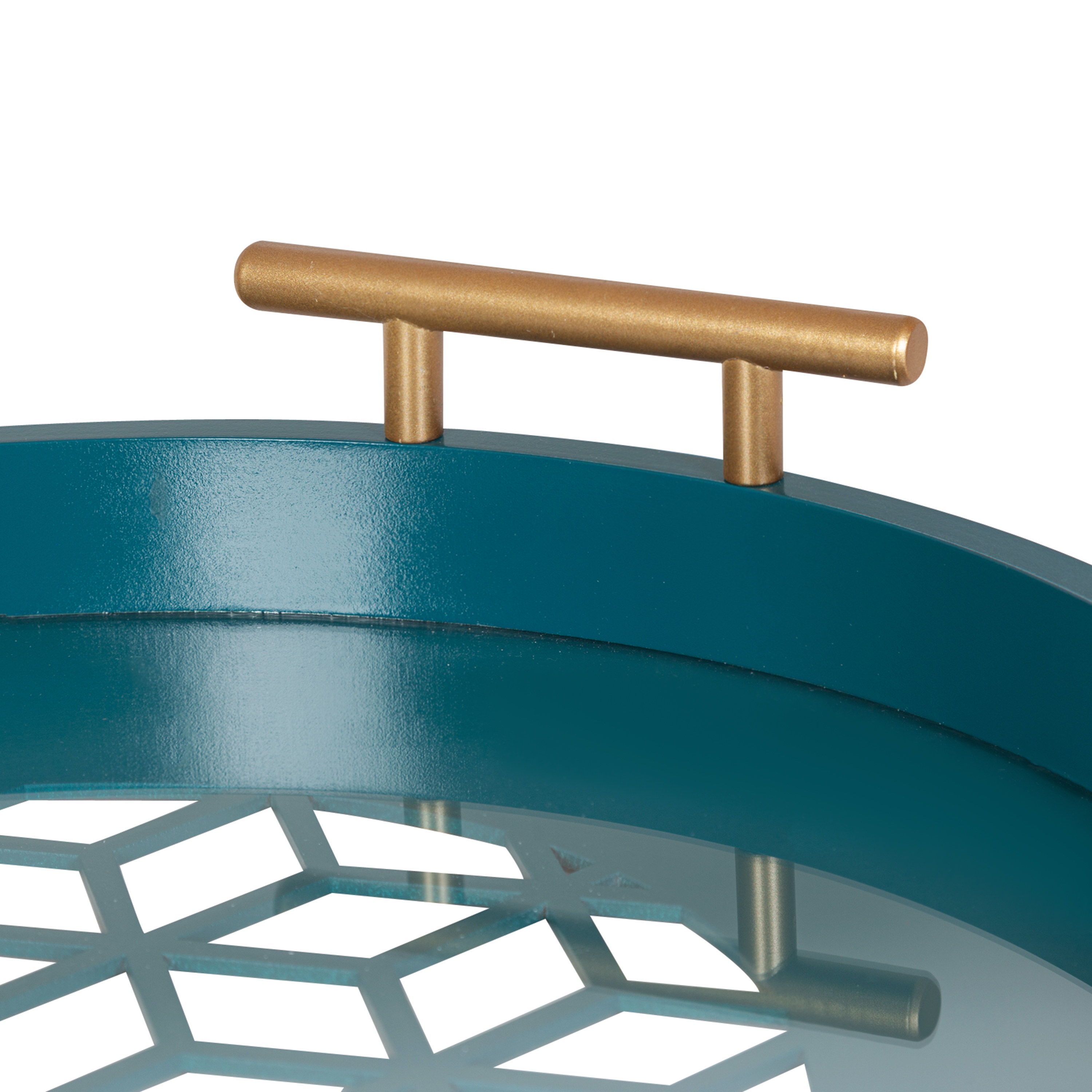 EYE-CATCHING DESIGN: The Caspen tray features a round shape with an ornate patterning on the bottom to add an ornate detailing QUALITY FINISH: The Caspen features a teal finish on the tray while the gold finish on the handles elevates its glamourous style AMPLE SIZE: The Caspen has a 15.5-inch diameter, making it the perfect size for a console table, ottoman, or vanity MULTIFUNCTIONAL: Use this tray to showcase decorative plants, serve drinks, or store media remotes on your ottoman PROTECTED: Felt pads are attached to the bottom of the tray to prevent scuffing and scratches on your hard surfaces