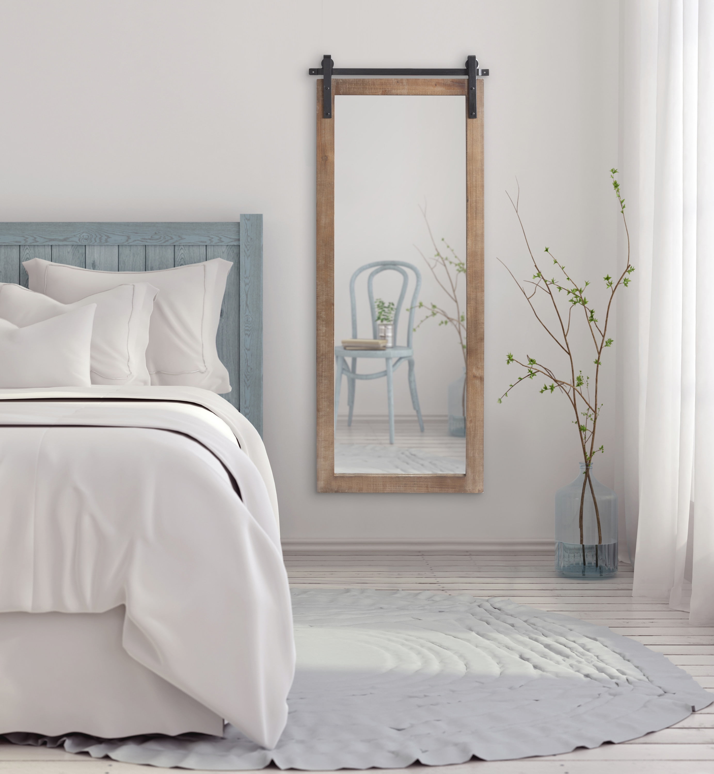 FARMHOUSE DESIGN: The Cates panel mirror features a barn door-inspired design with a one-of-a-kind distressed rustic brown finish on its frame QUALITY MATERIALS: This bold mirror features wood construction with heavy-duty metal brackets for added resiliency LARGE SIZE: The overall display dimensions of this statement piece are 18 inches wide by .75 inches deep by 50.25 inches tall DECORATIVE FUNCTION: Use the Cates as a functional bathroom mirror or as a decorative accent in a farmhouse-themed living space EASY TO HANG: Hang this timeless piece of rustic decor in a matter of seconds with convenient pre-drilled holes within the iron accents