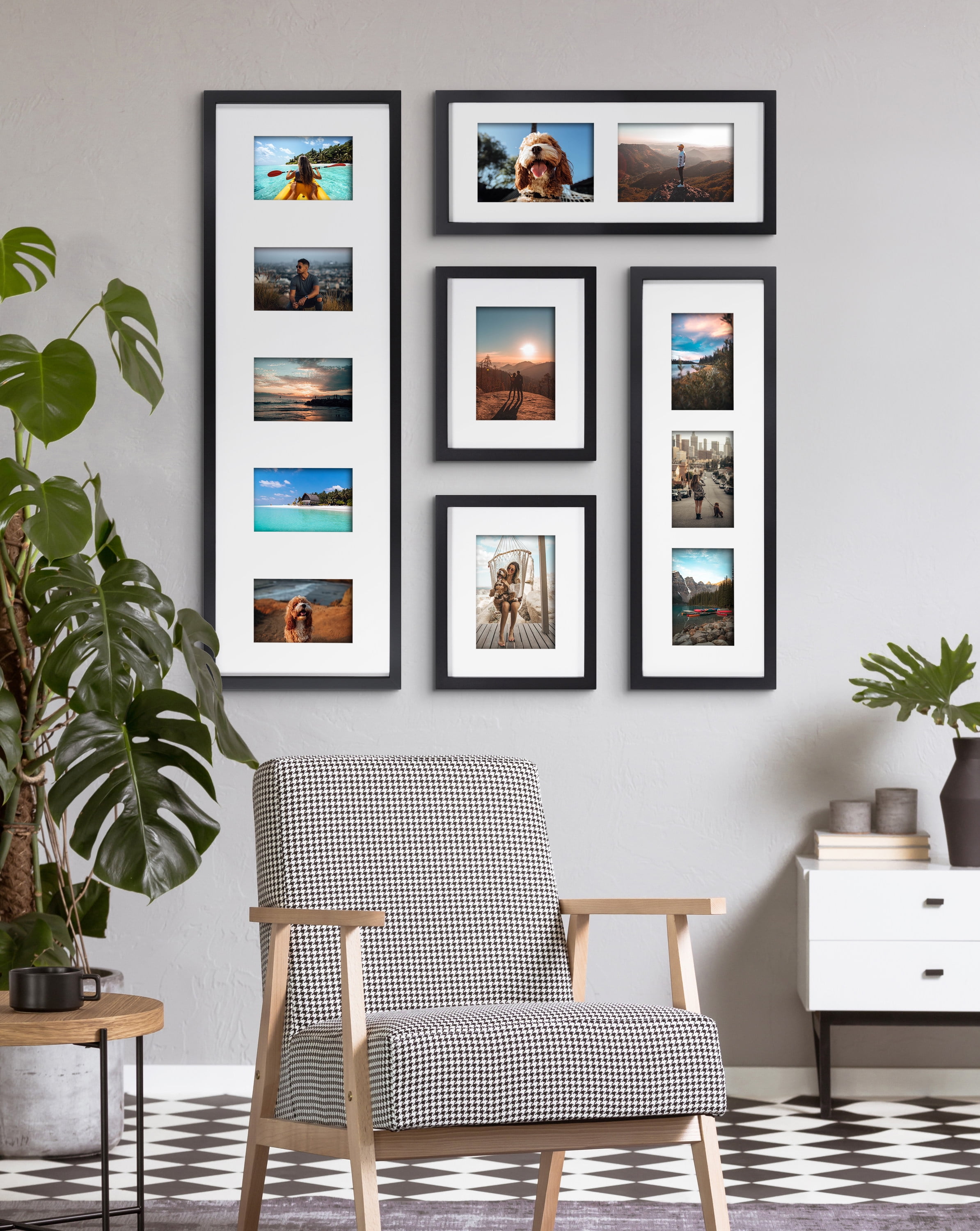 SOPHISTICATED LOOK: The Gallery frame set feature sizes that incorporate mats with multiple display openings, creating a display that showcases all the moments of your prized memories QUALITY MATERIAL: This lovely set of Gallery frames was constructed from a robust blend of wooden material, providing a quality that is both refined and resilient MULTIPLE SIZES: This photo collage features the following frame sizes with mats: 10×32.125 matted to (5) 4×6 display openings, 18×7 matted to (2) 5×7 display openings, 7.25×23 matted to (3) 4×6 openings, and (2) 8×10 matted to 5×7 TEMPLATE INCLUDED: The included hanging template makes arranging your new set of frames easy and uncomplicated EASY TO HANG: The Gallery collection features sawtooth hangers on the back of each frame for quick and efficient installation