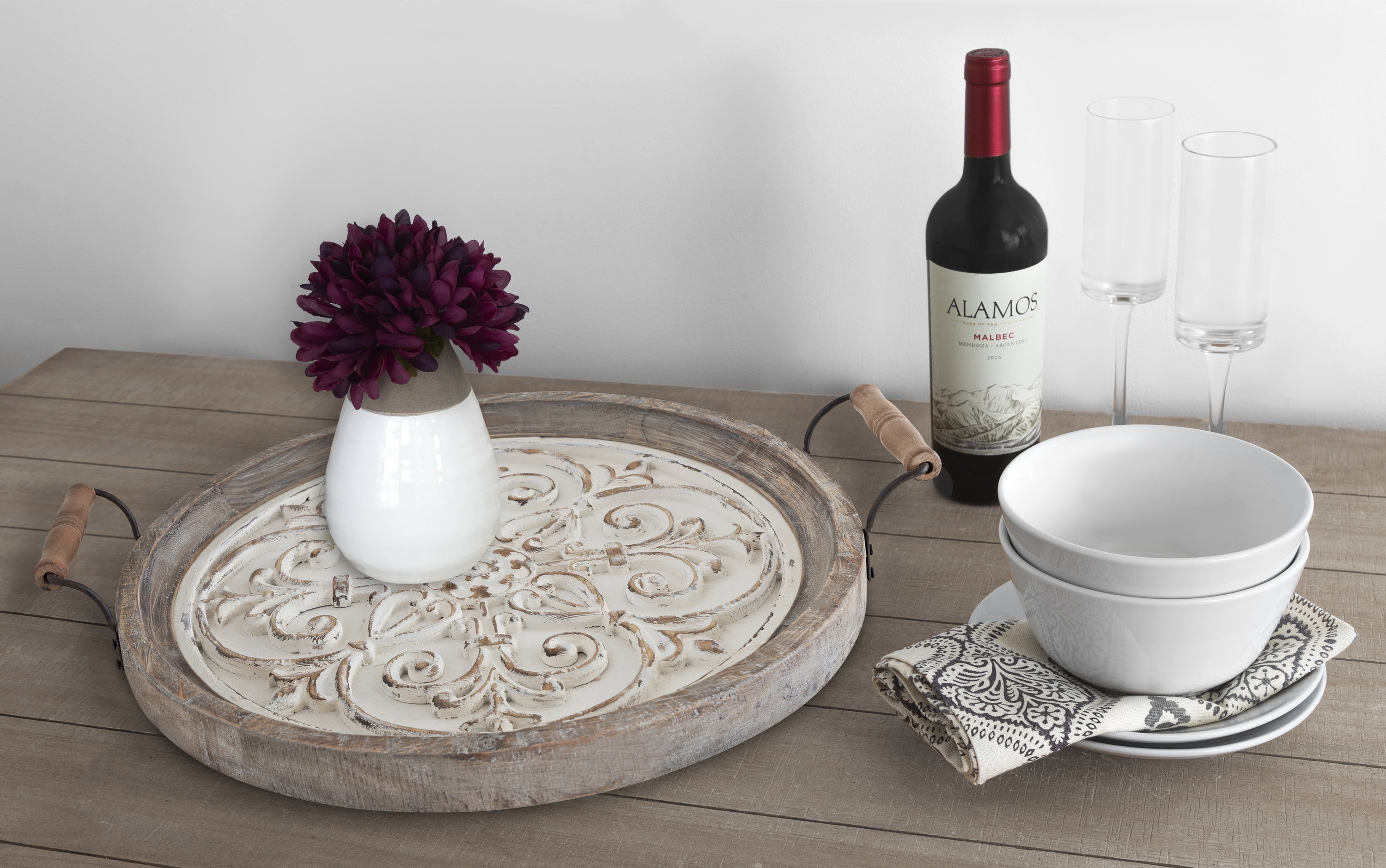 QUALITY MATERIAL: The Hillrose tray features an artisanal solid fir wood surface with two metal handles ORNATE DESIGN: The top surface of this decorative serving tray features a vintage medallion-inspired carved surface for a conversation-starting design detail LARGE SIZE: Each tray is 21 inches wide by 18 inches deep for an excellent surface for serving cocktails, storing books and media remotes, or showcasing your small succulents TWO-TONE FINISH: The Hillrose Tray features a two-tone rustic brown and whitewashed finish that is hand-distressed for a truly one-of-a-kind look PROTECTED AGAINST DAMAGE: Each Hillrose Tray features protective pads on the bottom of the tray to prevent scratching, scuffing, and other damage to hard surfaces