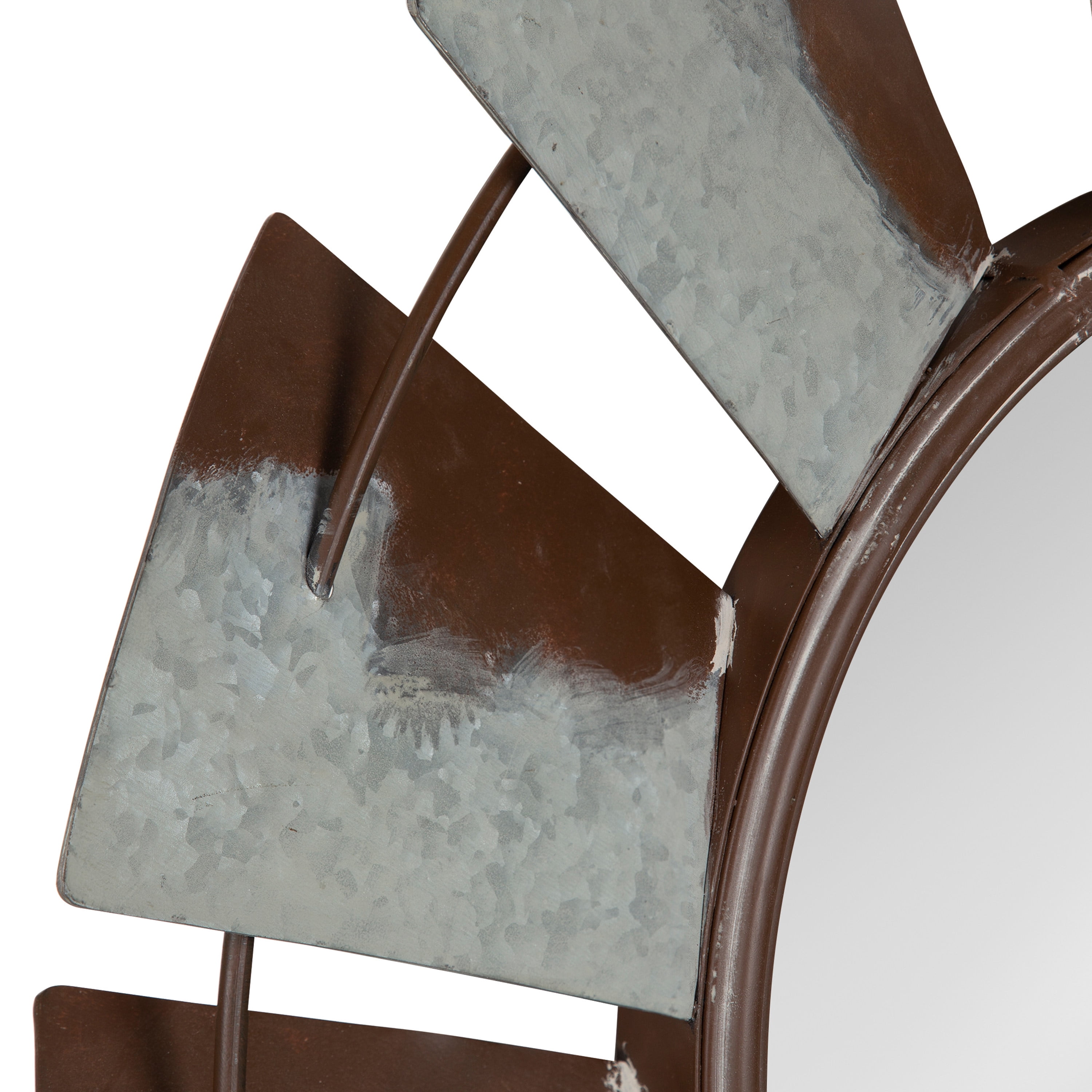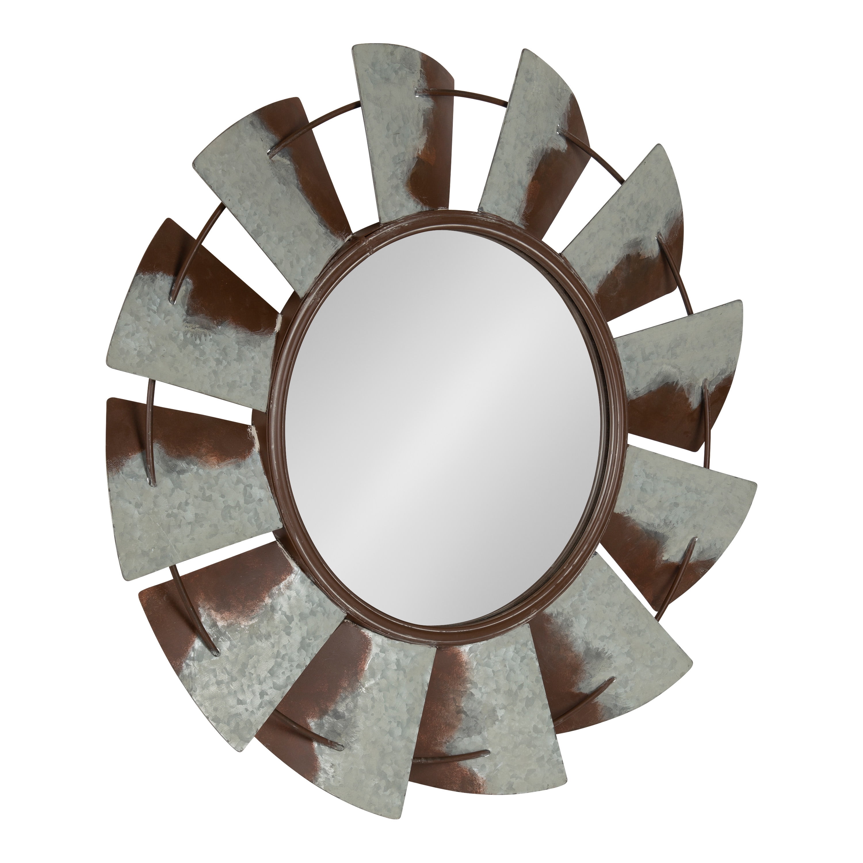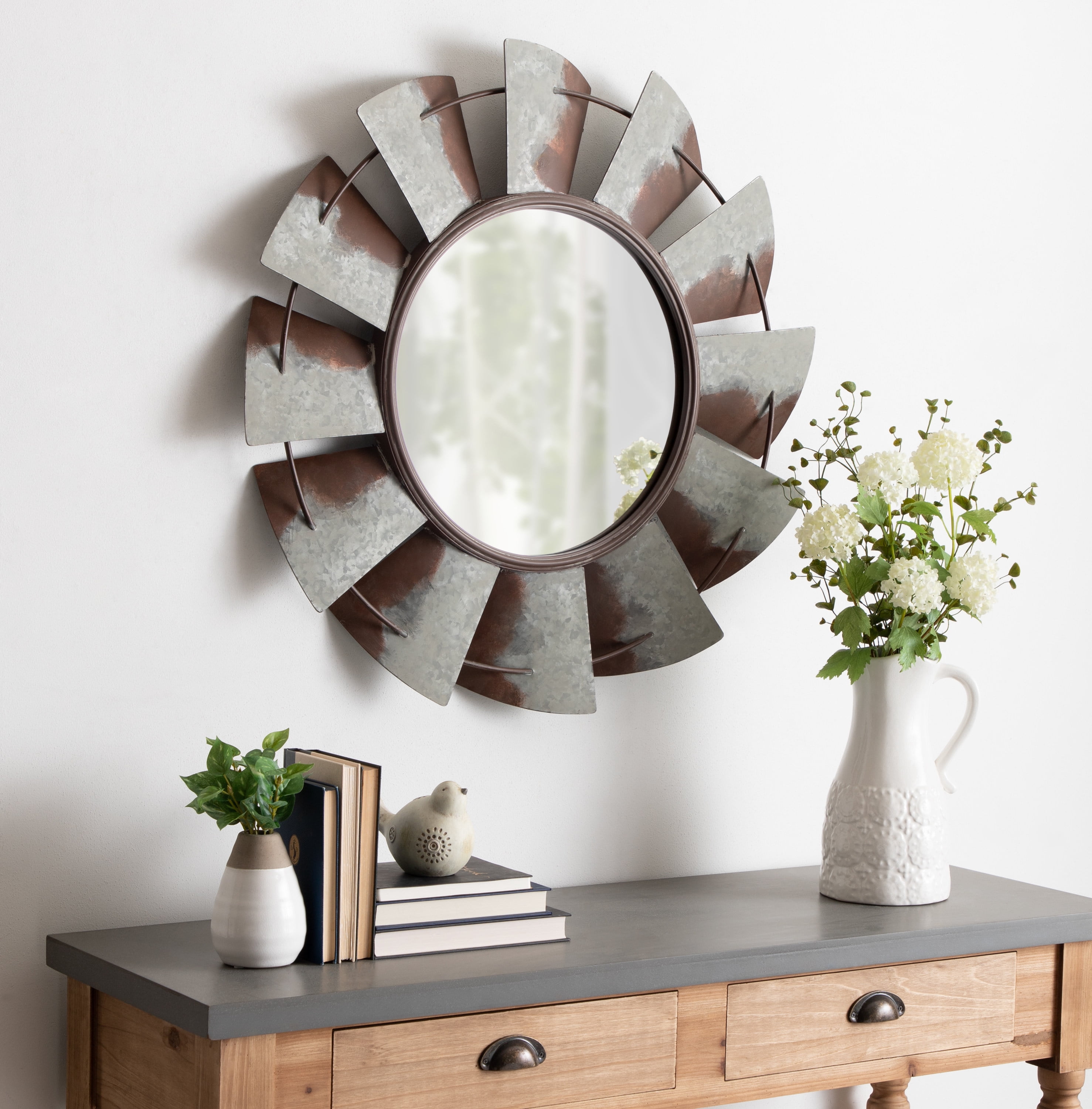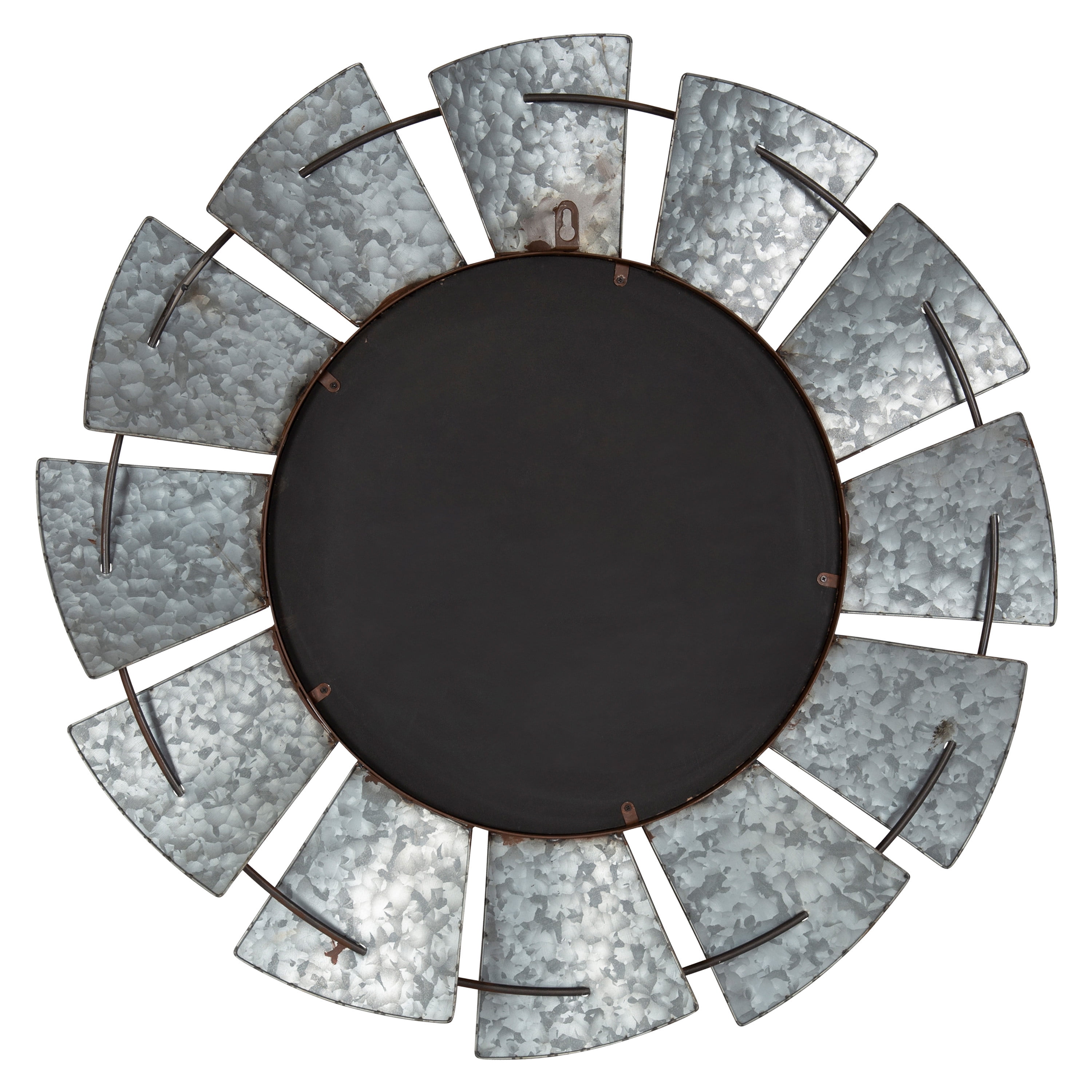 An extra-large vintage windmill wall mirror will be an elegant display in any room of the home where you want to add a rustic farmhouse twist Placed above an entryway console, as part of a grouping in your living room, or as a trendy alternative to a bathroom vanity mirror, it will create a beautiful addition to your home decor The large 32-inch diameter size adds to its good looks. It sits about 2 inches deep from the wall and has a metal keyhole hanger attached to the back of the frame for easy and secure wall display Constructed entirely of metal, the Millbrook Mirror has a unique, antique feel that will add a touch of one-of-a-kind decor to your home This mirror arrives completely assembled ready to hang on the wall