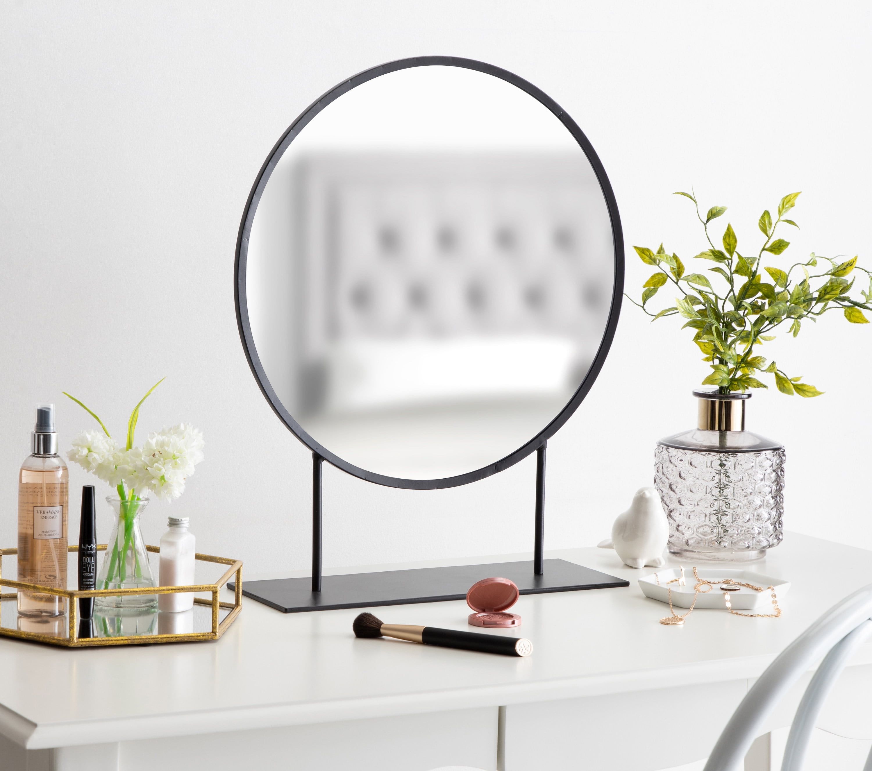 The Rouen Table Mirror was designed with the modern sophisticate in mind with an elegantly glamorous style that offers everyday usability An elegant accent that stands completely on its own allowing you to place it anywhere you need an instant vanity area or a way to add reflection a smaller space The contemporary circular shape is supported by a sturdy base with a tabletop display dimension of 22-inches tall with 18-inch diameter mirror. Large enough to use for makeup application or as an extra bathroom mirror but small enough to be super convenient This carefully constructed mirror is surrounded by a strong metal frame and base One of the best home decor accents you can buy, a decorative tabletop mirror offers an easy way to lighten and brighten your space while offering terrific use!