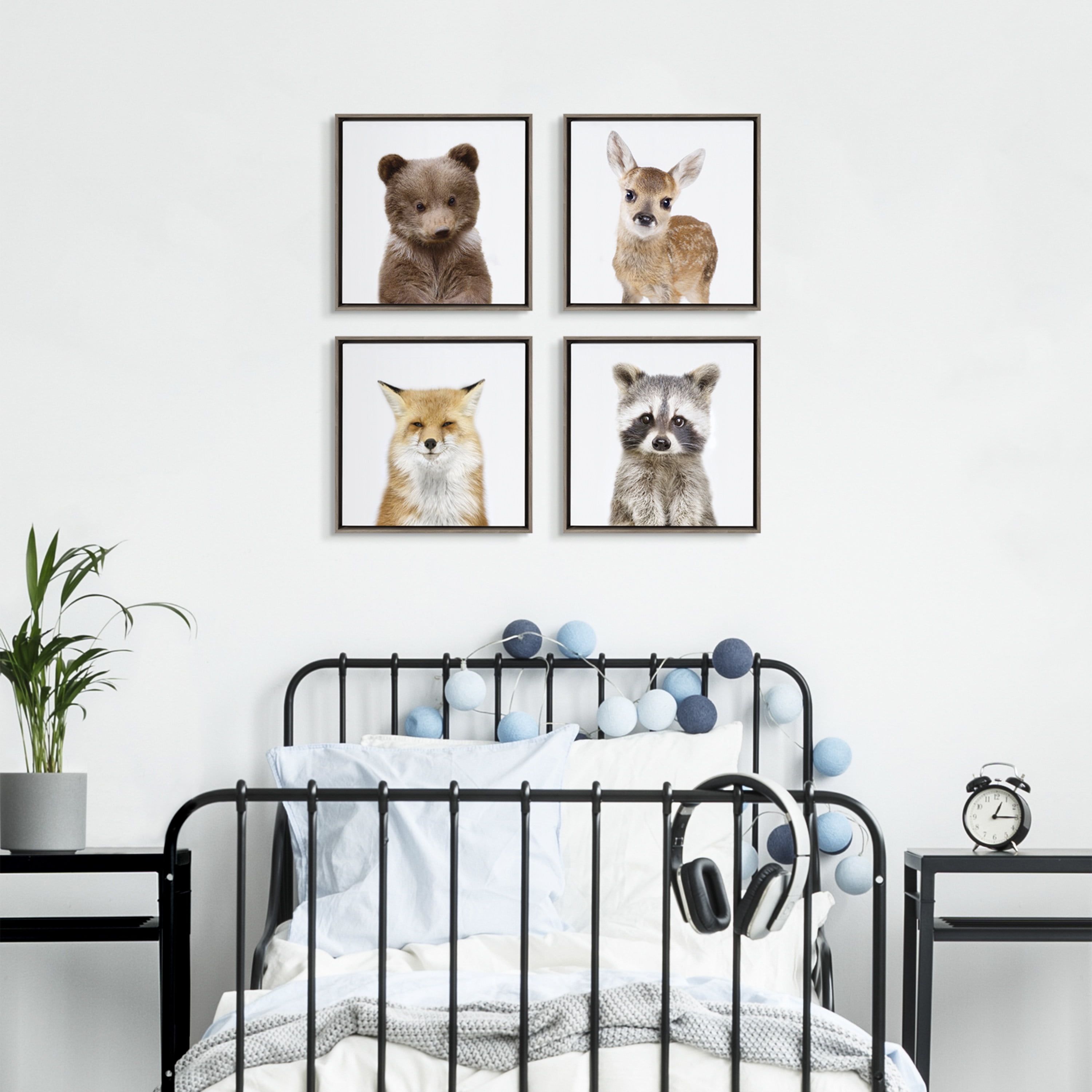 TRANSITIONAL CANVAS WALL ART: Animal art on framed high quality canvas. Display dimensions are 13 inches square QUALITY MATERIALS: Printed with UV-resistant inks to provide increased durability and fade resistance EASY TO HANG: The frames are made with a premium lightweight frame and have a metal sawtooth hanger already attached to the back THIN SLEEK FRAME: Canvas is printed and hand framed with a thin modern frame ARTIST DESIGNED: Prints “Animal Studio Bear, Animal Studio Deer, Animal Studio Fox, Animal Studio Raccoon.” ©2020 Amy Peterson Art Studio