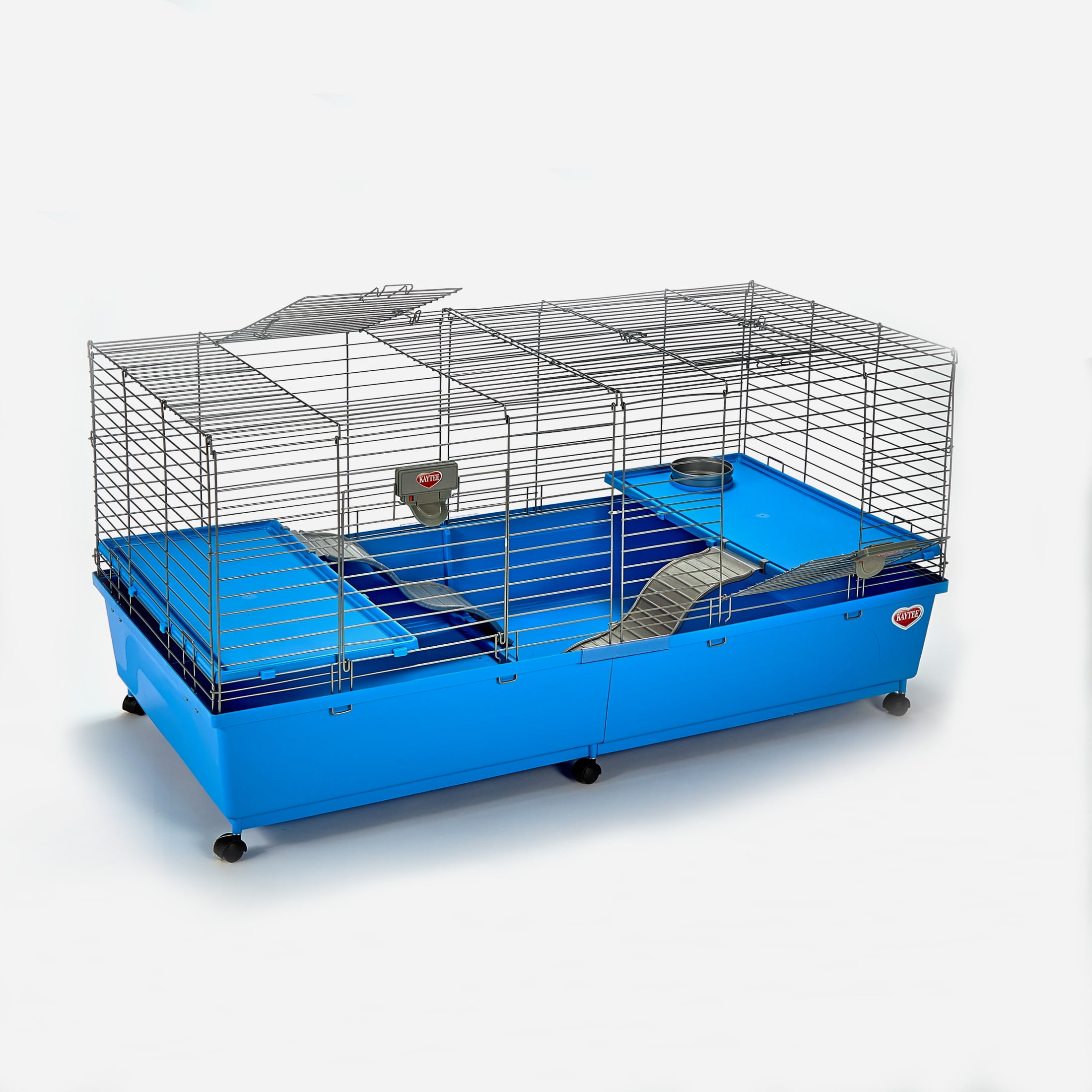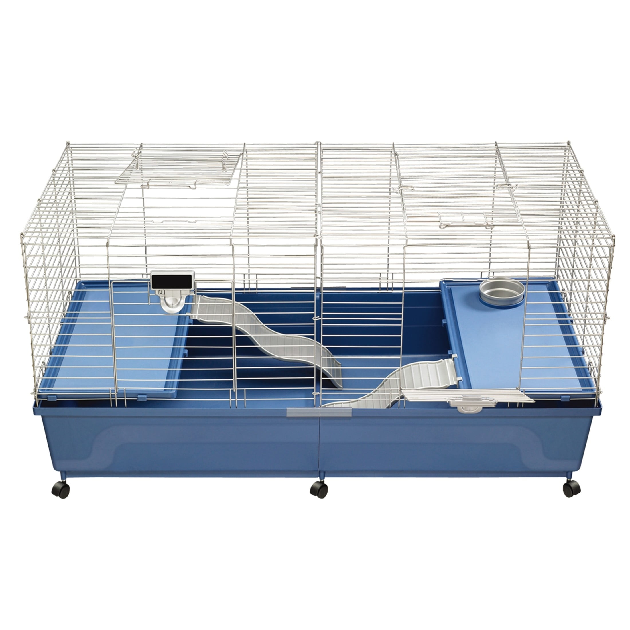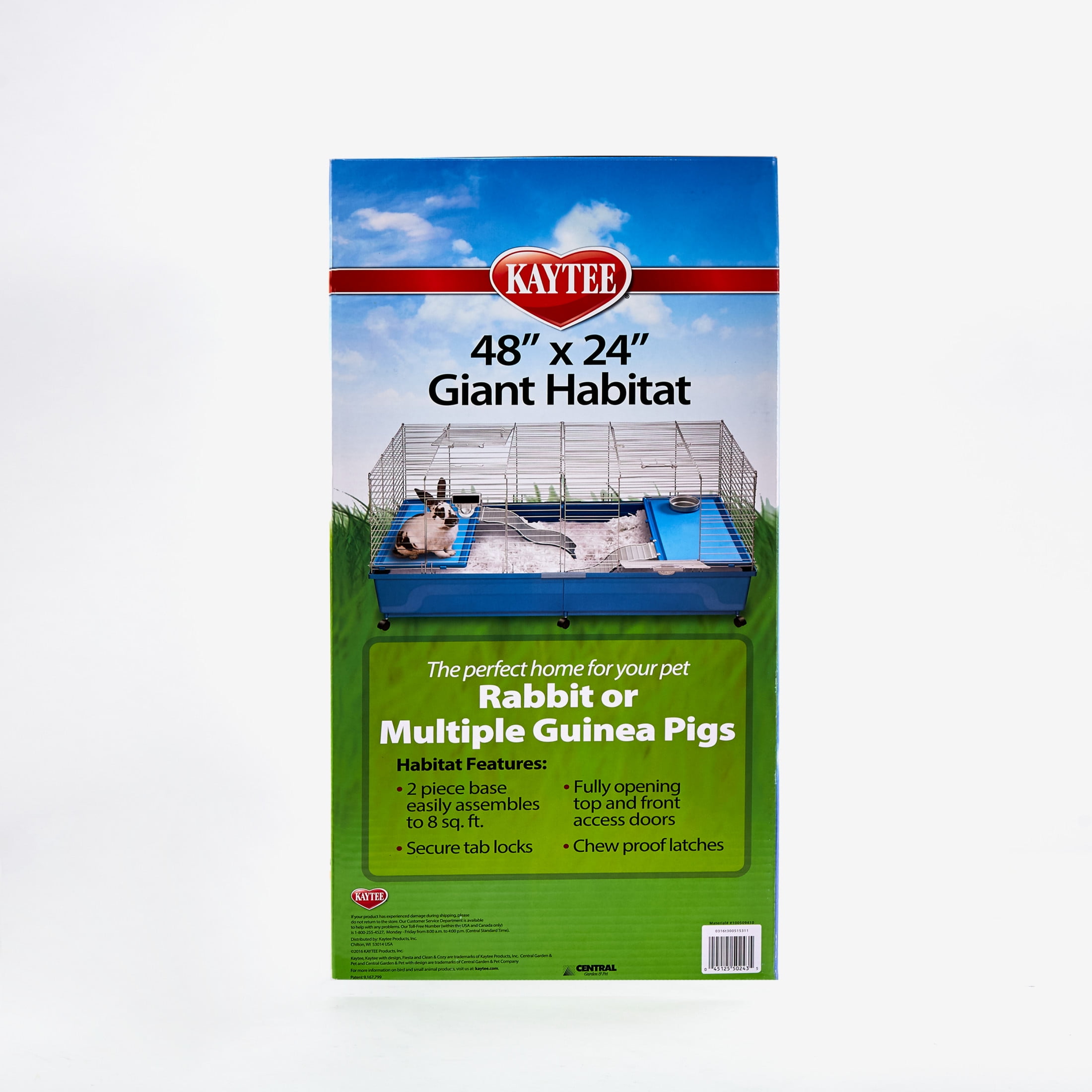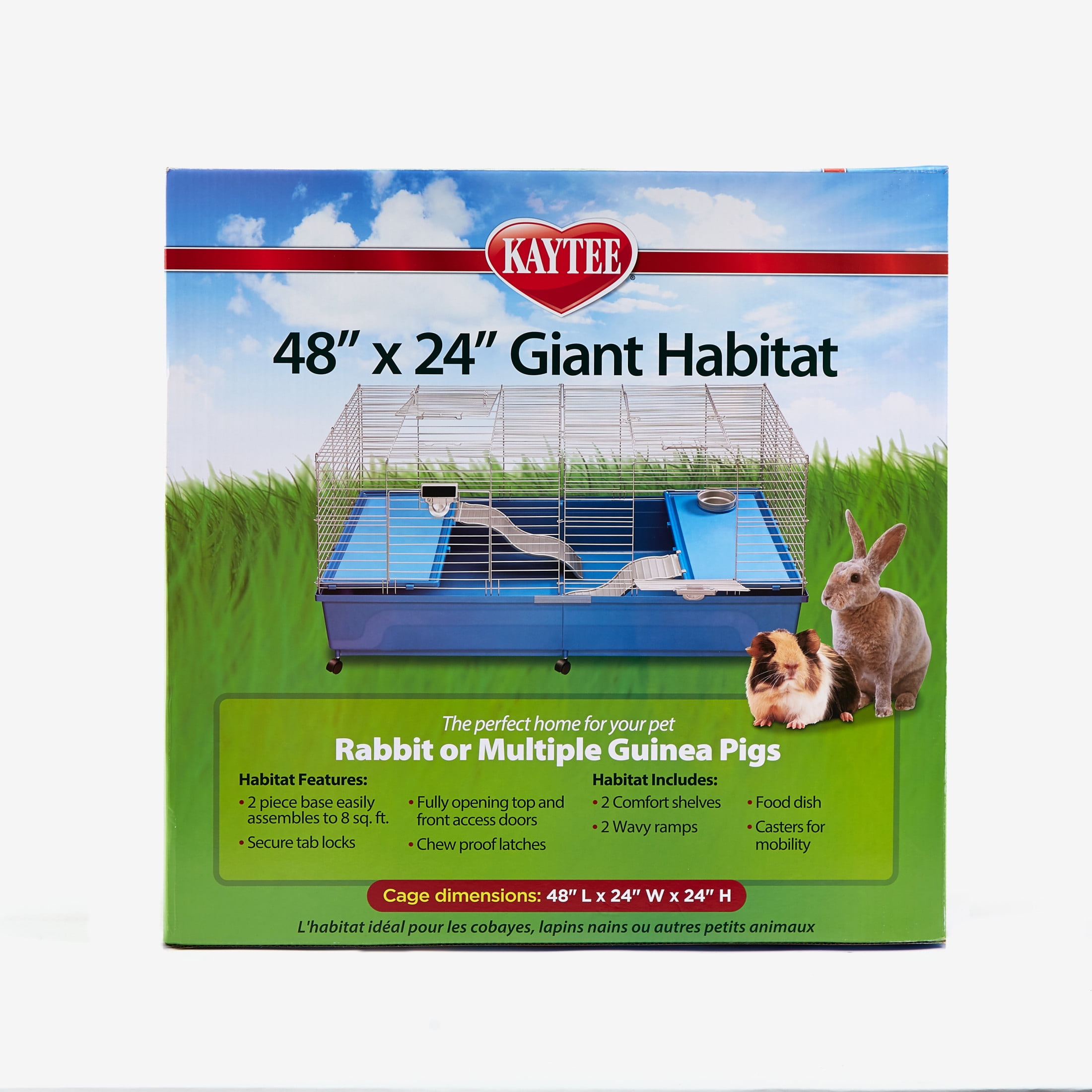 Kaytee Habitat has 8 square feet of living space as recommended by veterinarians and cavy enthusiasts Durable cage with chew-proof locks and wire for maximum safety and security Top and front wire doors for easy access Includes 2 comfort shelves, 2 wavy ramps and a food dish Caster wheels make it easy to move the cage Ideal habitat for a guinea pig or rabbit Cage Dimensions: 48″ x 24″ x 24″