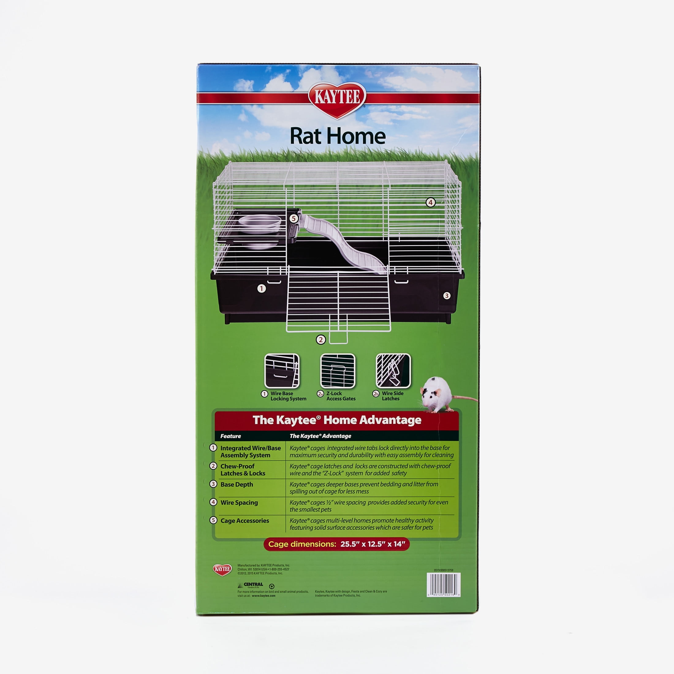 Kaytee Pet Rat Habitat is a durable cage with chew-proof locks and wire for maximum safety and security Deep base prevents bedding and litter from spilling out of the cage Multiple levels promote healthy exercise and activity Solid plastic shelves and ramps are safe and comfortable for pets and easy to clean 1/2″ wire spacing prevents escapes Ideal for rats Cage Dimensions: 25.5″ x 12.5″ x 14″