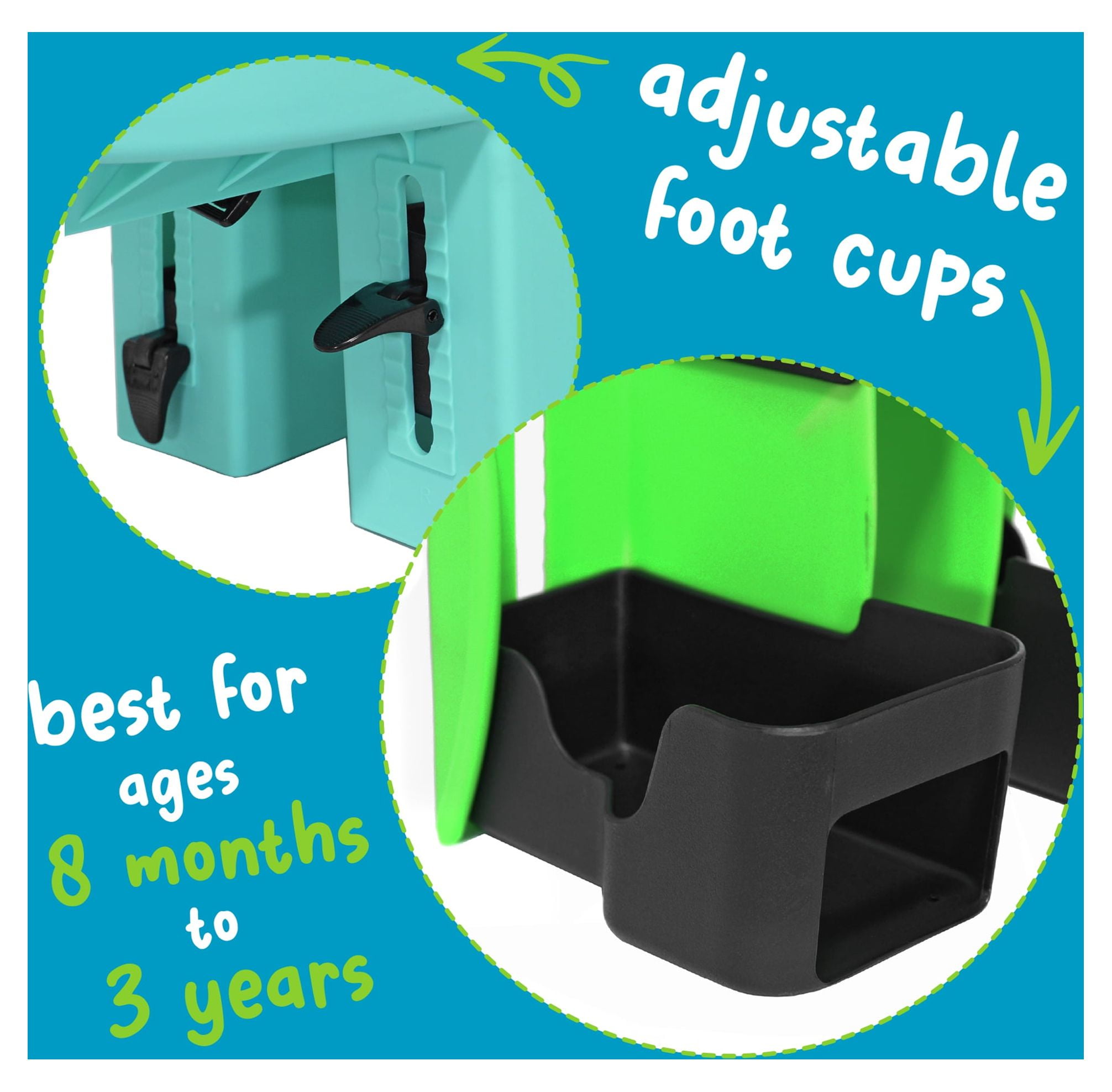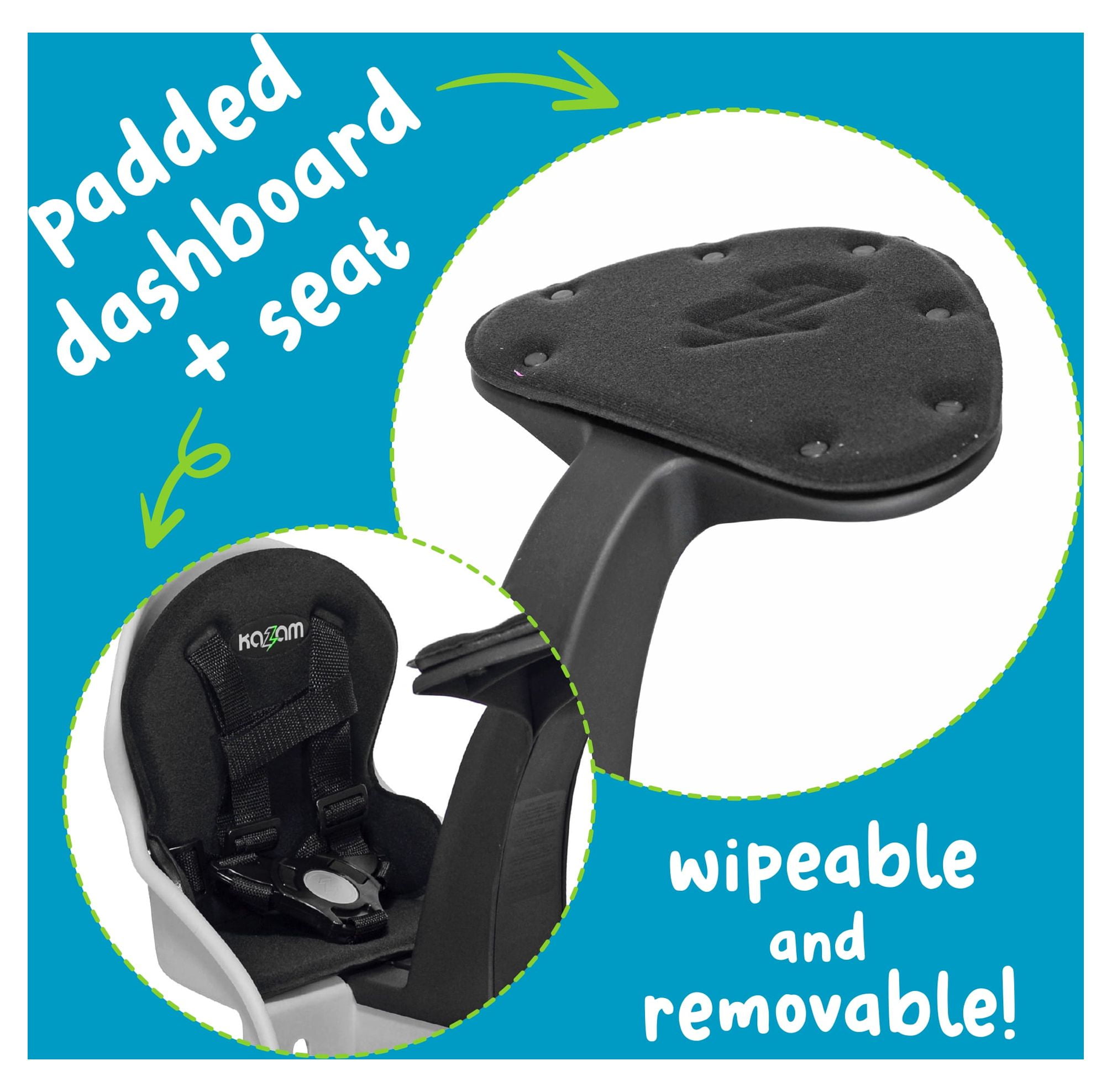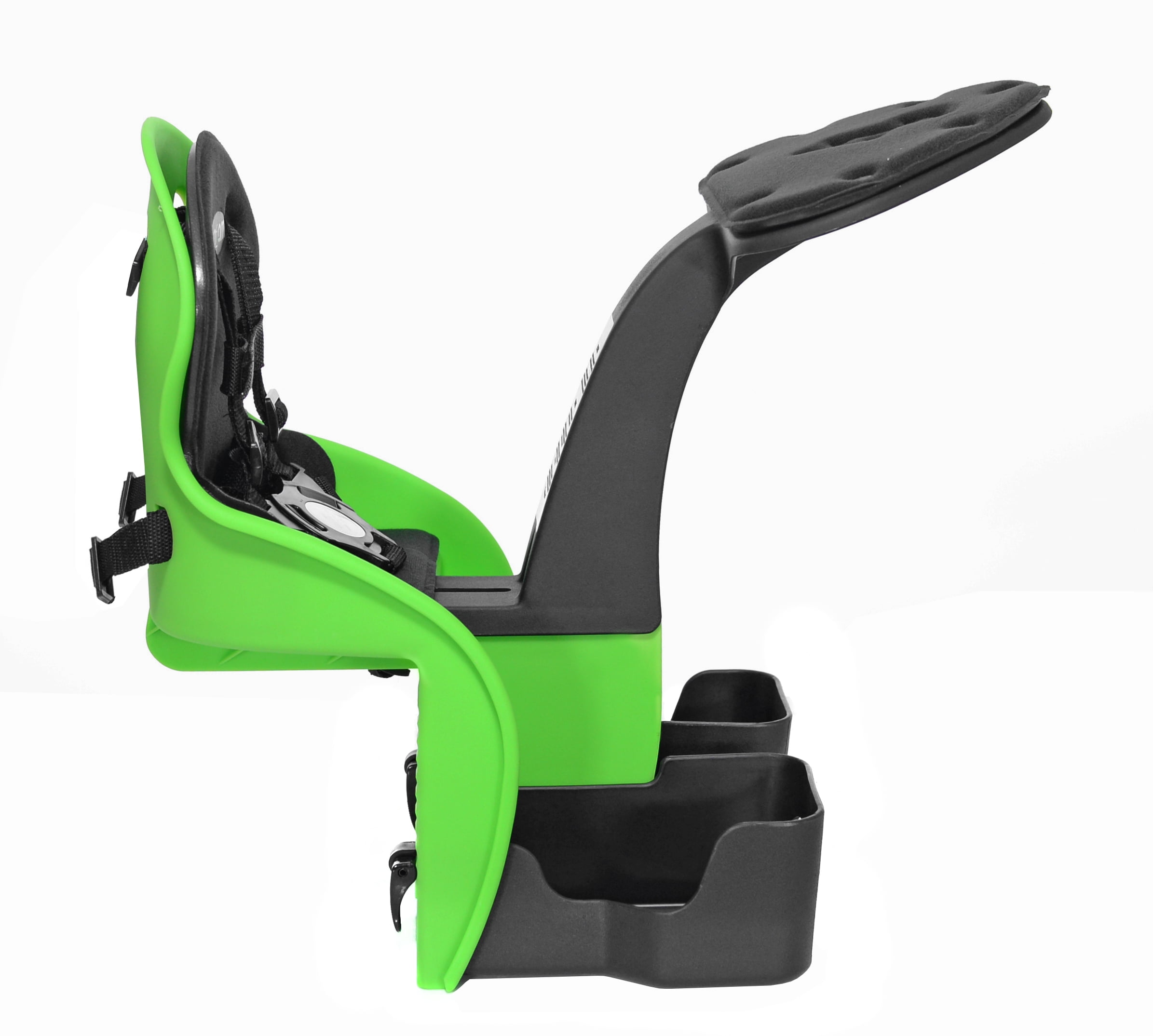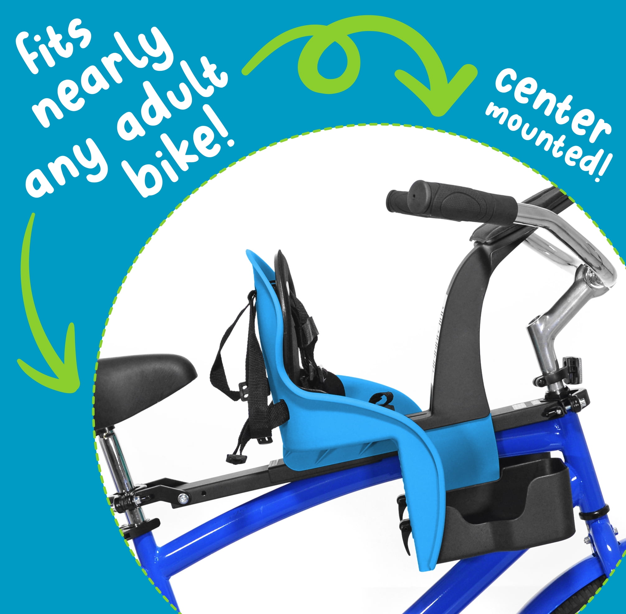 Durable and Weather Resistant Plastic Shell 5 Point Safety Harness Recommended Age: 8 mo – 3 years Adjustable Foot Cups and Straps Max Rider Weight: 38lbs Padded Dashboard and Seat Patented Center Mounting Bar System (included with purchase) Fits Most Adult Bicycle Color: Green KaZam Child Seat