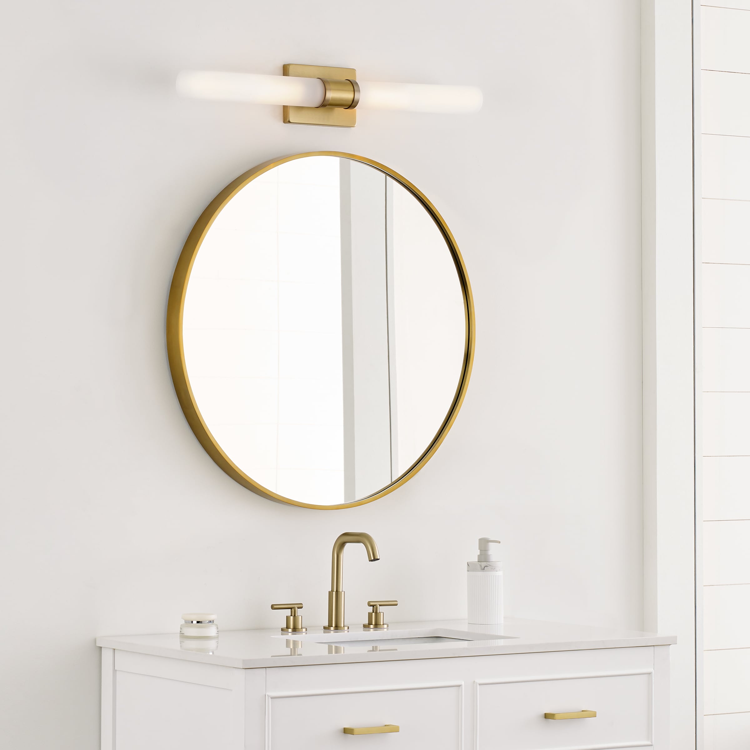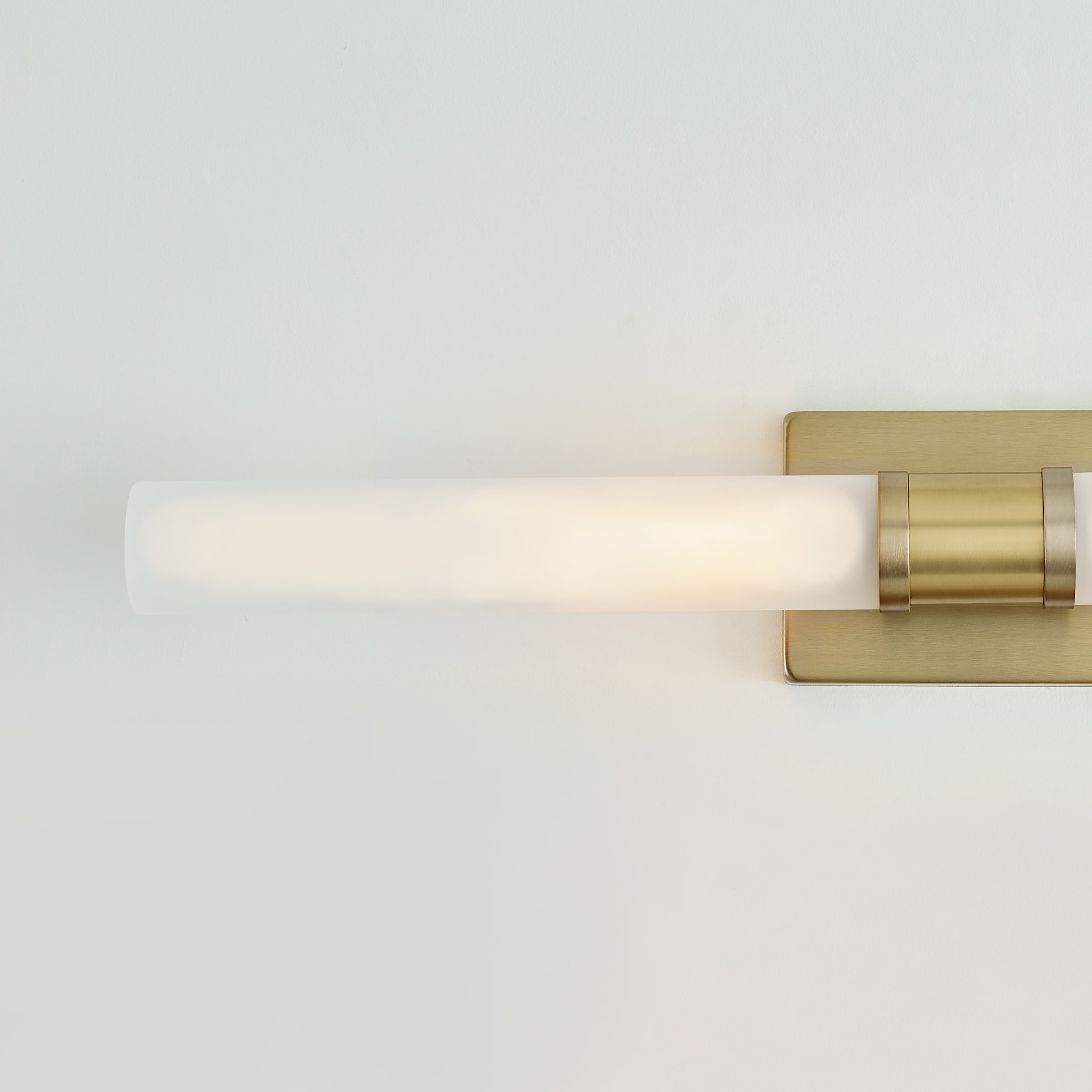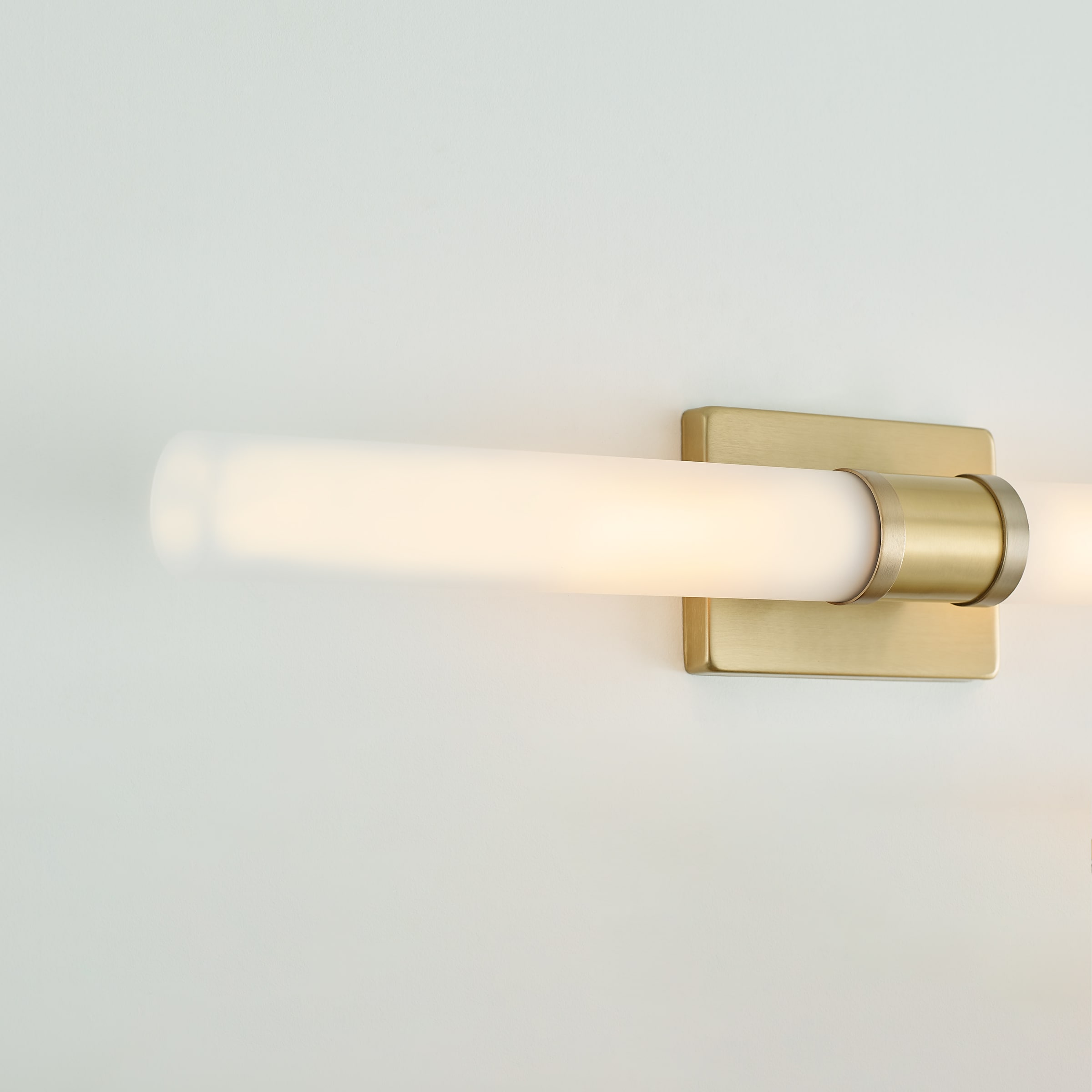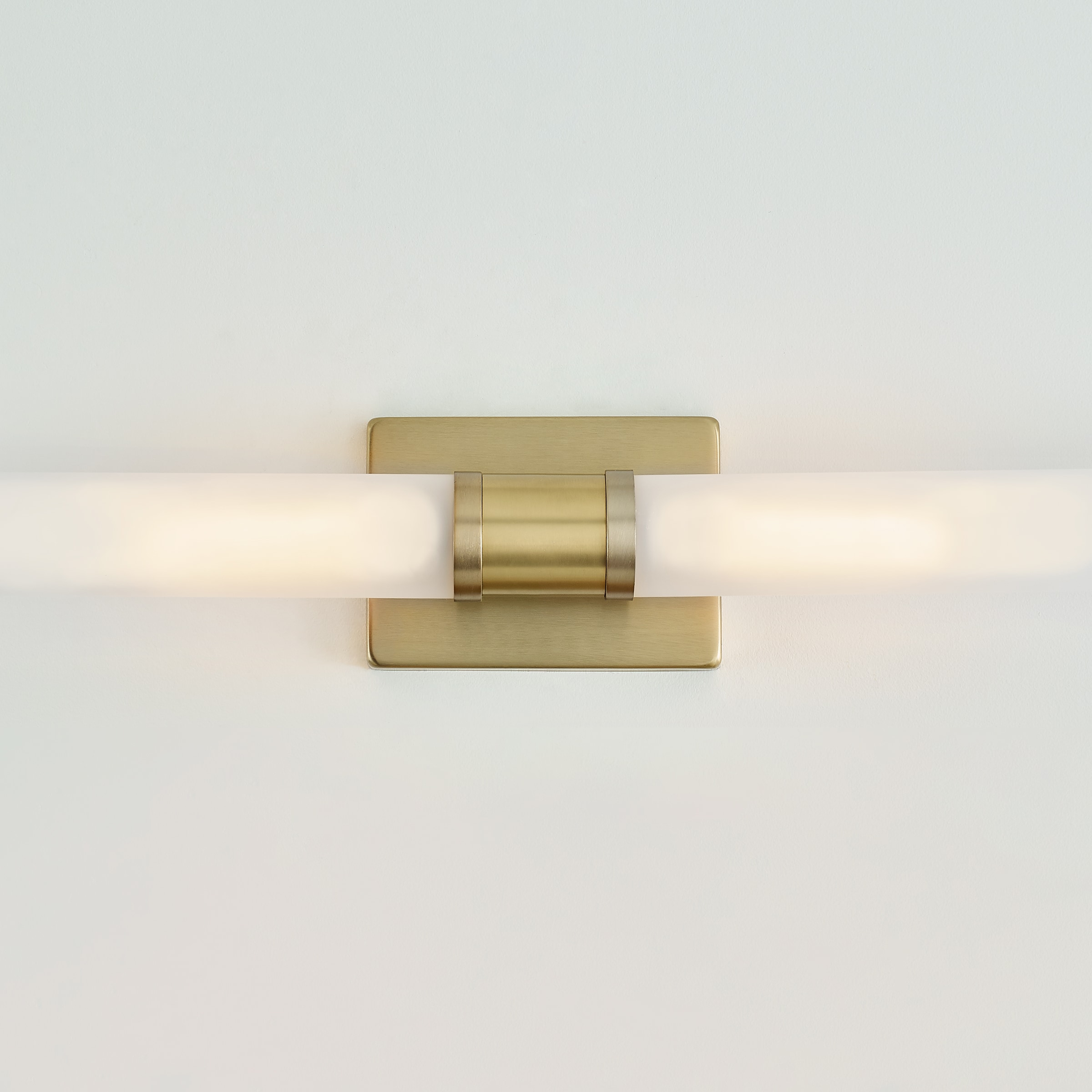 Sleek and modern, this 2-Light bath series pairs a square backplate with tubular etched white opal glass shade. The Keaton two light vanity fixture in Satin Brass provides abundant light for your bath vanity, while adding a layer of today’s style to your interior design.