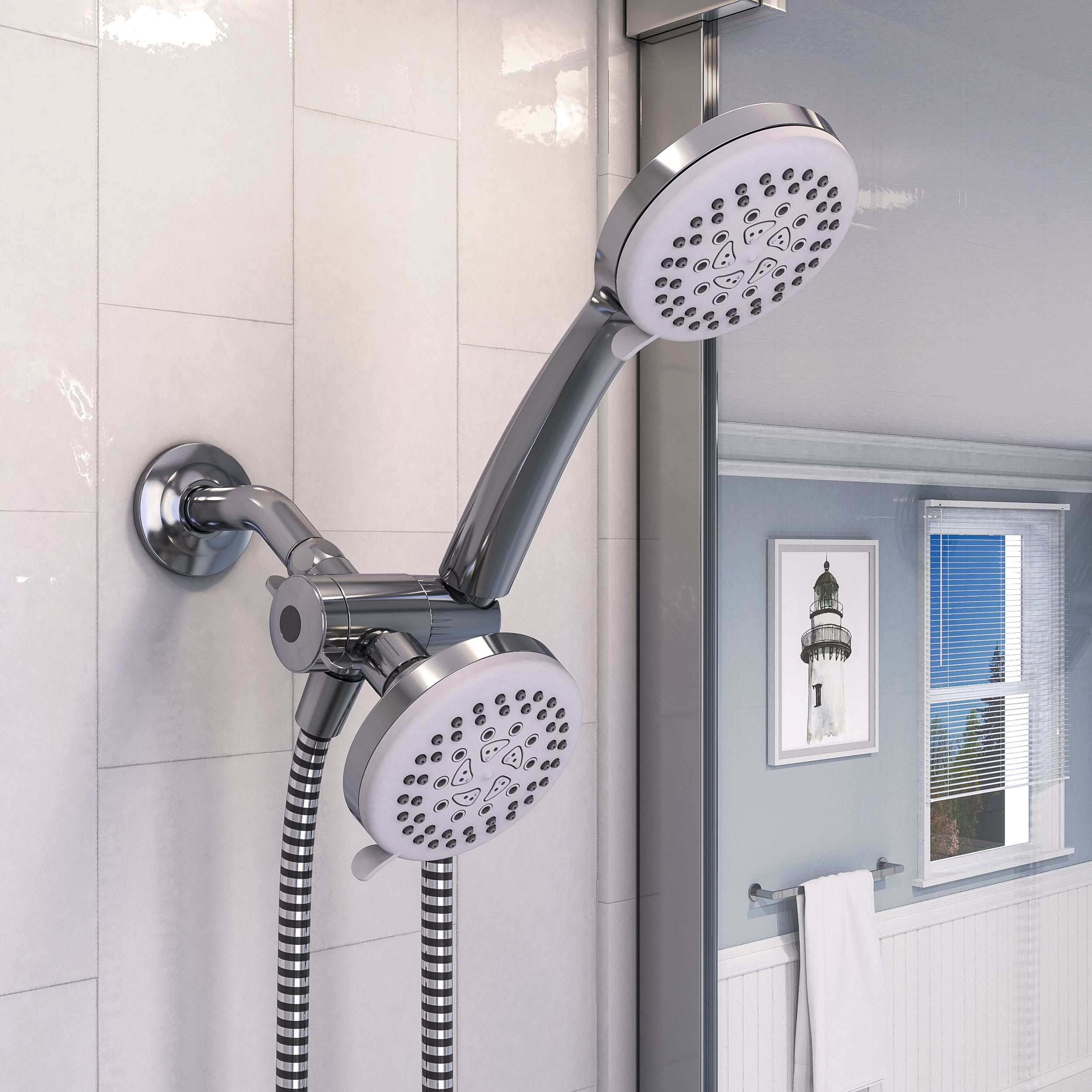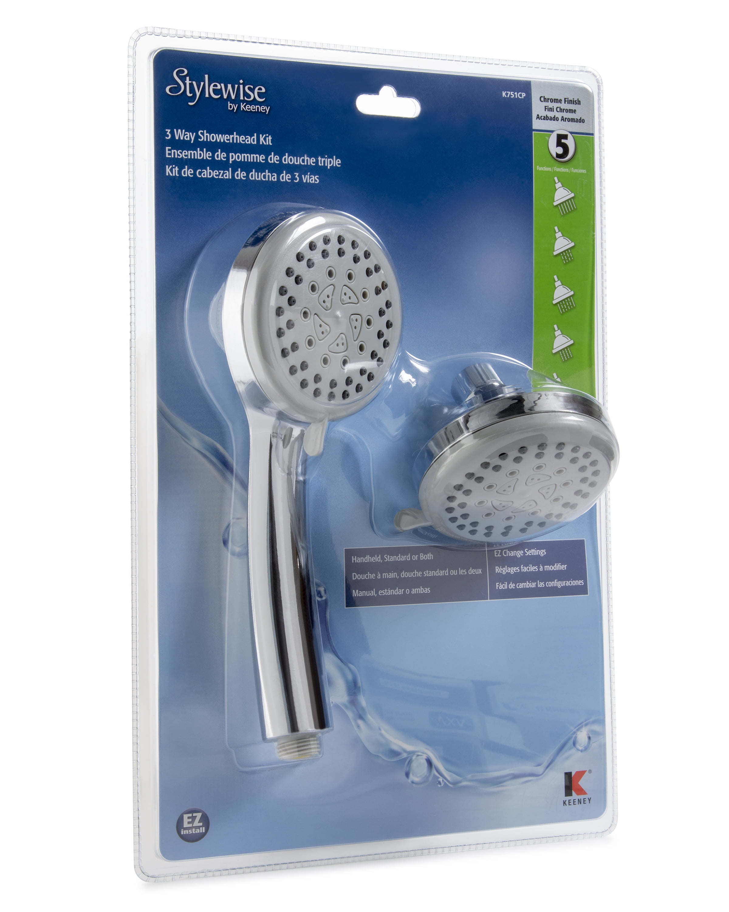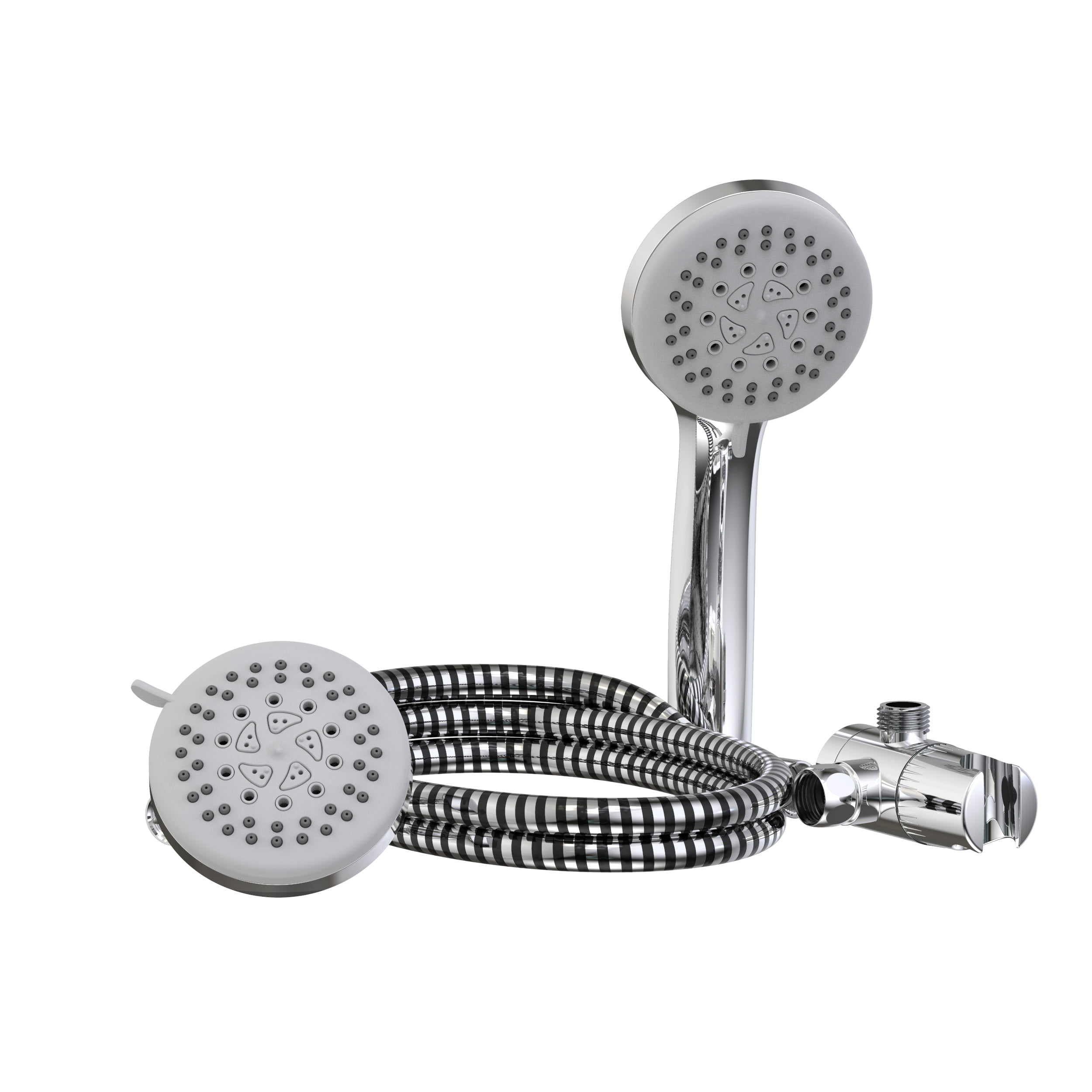 5 function, 3-way showerhead kit with easy change settings to customize your shower experience: spray, massage, bubble, spray & massage, spray & bubble Includes (1) handheld showerhead, (1) standard showerhead, (1) 60-in. flexible hose, and (1) 3-way diverter bracket 3-way diverter makes it easy to use each shower head independently or in combination Easy DIY installation Easy-to-clean rubber nozzles for hassle-free maintenance 3.86-in. round face in a polished chrome finish Eco-friendly 1.8 GPM flow rate meets WaterSense Limited Lifetime Warranty