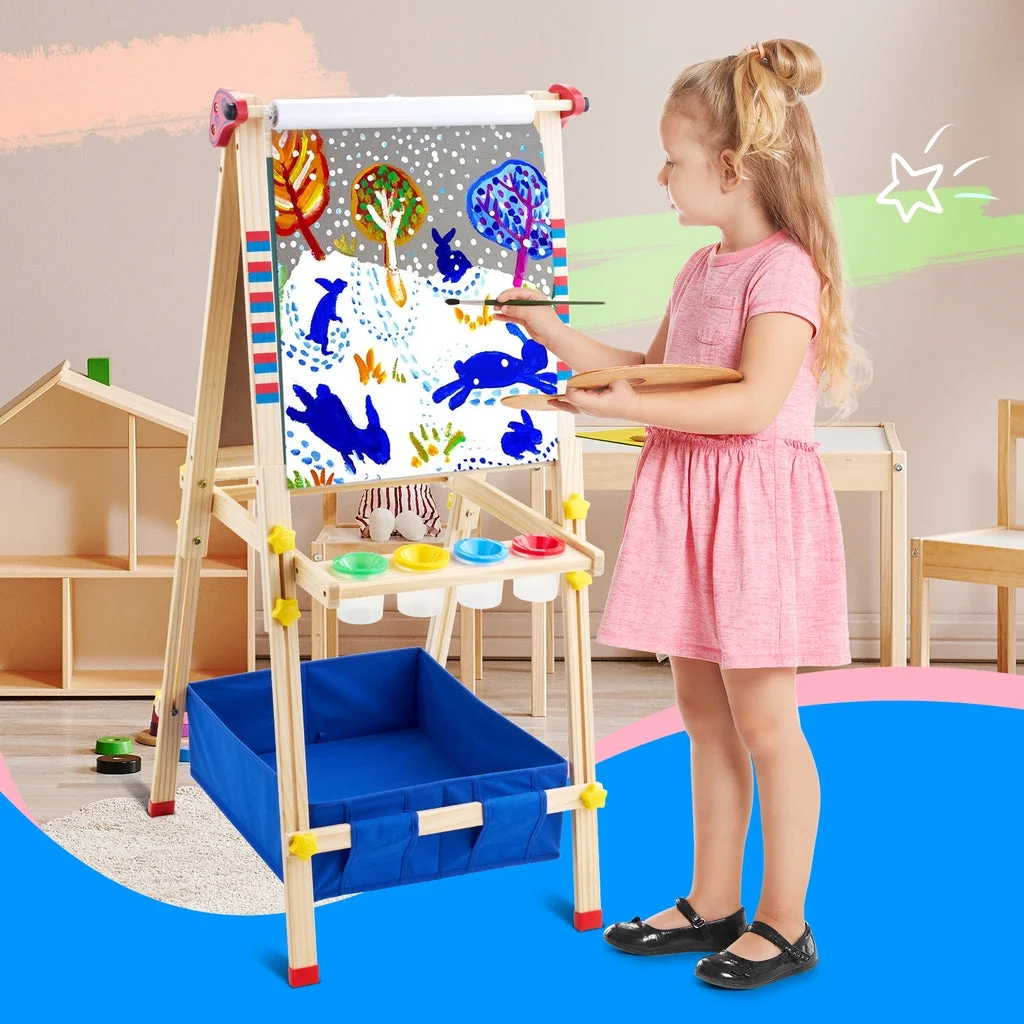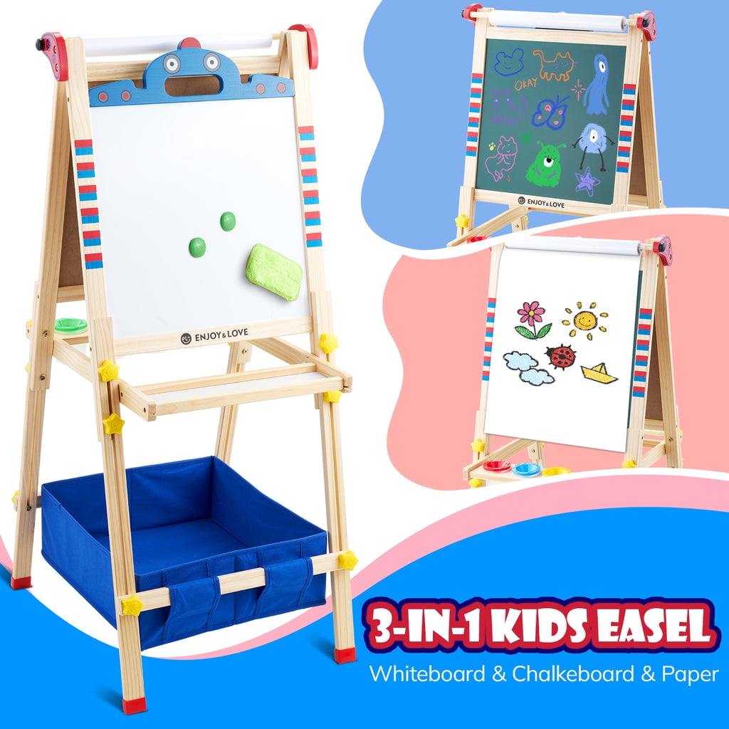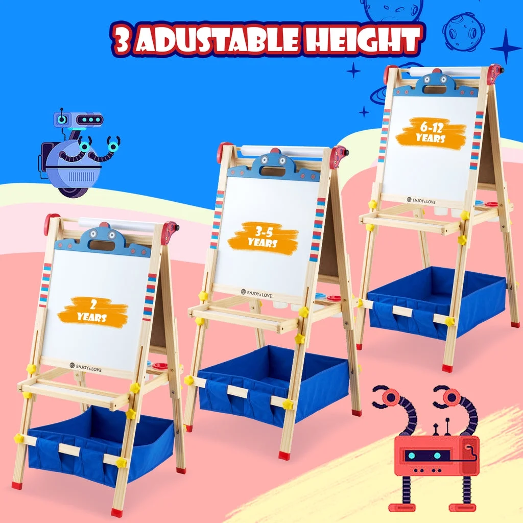 ????【Robot ????-????????-???? Art Easel】 The Keenstone kids painting easel set features a magnetic chalkboard easel for kids on one side, a kid’s magnetic white board on the other side, & a refillable paper roll for painting & drawing.The high-end 3-in-1 kid’s easel is made of natural pine wood. With an 17-inch paper roll attached at the top. ????【MAGNETIC EASEL】 Both sides of the easel are magnetic, adding yet another fun way to play! The tray beneath the drawing board is specially designed for convenient storage & rigidity. ????【CHILD-FRIENDLY DESIGN】 Child’s easel features a sturdy wooden frame, is easy to assemble. It is more stable with non-slip foot rubber cover and triangular vertical easel design. The edges of the easel were all polished and the inverted corners were also rounded to avoid abrasion and bumps, caring with the growth of children. ????【ADJUSTABLE HEIGHT 】 The legs are easily height adjustable, from 32″ to 52″, making it the perfect standing easel for children of all ages, from a toddler easel to a 13-year-olds easel. ✏️【Versatile and Multi-Purpose】 This children’s art easel can be used for various activities like drawing, painting, and practicing handwriting, making it a perfect tool for creative play and educational development. It’s also a magnetic drawing board for kids, which provides endless fun and educational opportunities. Whether in the classroom or at home, our easel is perfect for a range of activities that your child will love! ????【BEST CHOICE EASEL SET】 The chalkboard easel suitable for homeschooling, school enlightenment, training class, parent-child activity. A perfect art toys gift for Birthday, Christmas, Children’s day gift. ????【ACCESSORIES BUNDLE】 This kids art easel includes a huge ????????????+ pcs: Apron, Paints & Pots, Brushes, Chalk, Markers, Eraser & Cloth, Ruler, Paper Roll, & Magnetic Nos., Letters & Animals.