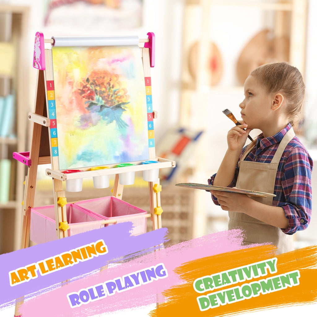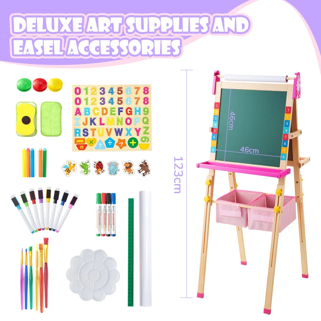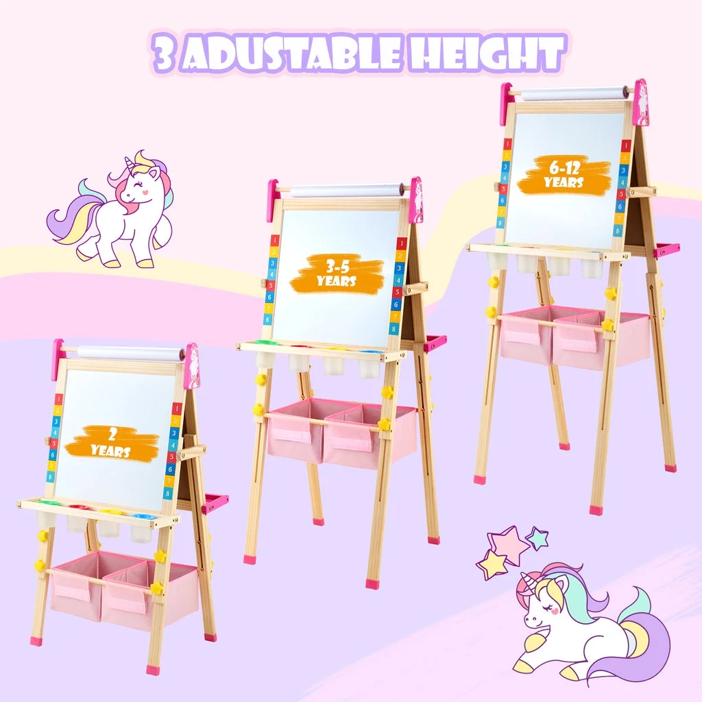 ????【Unicorn ????-in-???? Art Easel】 The Keenstone kids painting easel set features a magnetic chalkboard easel for kids on one side, a kid’s magnetic white board on the other side, & a refillable paper roll for painting & drawing.The high-end 3-in-1 kid’s easel is made of natural pine wood. With an 17-inch paper roll attached at the top. ????【MAGNETIC EASEL】 Both sides of the easel are magnetic, adding yet another fun way to play! The tray beneath the drawing board is specially designed for convenient storage & rigidity. ????【CHILD-FRIENDLY DESIGN】 Child’s easel features a sturdy wooden frame, is easy to assemble. It is more stable with non-slip foot rubber cover and triangular vertical easel design. The edges of the easel were all polished and the inverted corners were also rounded to avoid abrasion and bumps, caring with the growth of children. ????【ADJUSTABLE HEIGHT 】 The legs are easily height adjustable, from 32″ to 52″, making it the perfect standing easel for children of all ages, from a toddler easel to a 13-year-olds easel. ✏️【Versatile and Multi-Purpose】 This children’s art easel can be used for various activities like drawing, painting, and practicing handwriting, making it a perfect tool for creative play and educational development. It’s also a magnetic drawing board for kids, which provides endless fun and educational opportunities. Whether in the classroom or at home, our easel is perfect for a range of activities that your child will love! ????【BEST CHOICE EASEL SET】 The chalkboard easel suitable for homeschooling, school enlightenment, training class, parent-child activity. A perfect art toys gift for Birthday, Christmas, Children’s day gift. ????【ACCESSORIES BUNDLE】 This kids art easel includes a huge ????????????+ pcs: Apron, Paints & Pots, Brushes, Chalk, Markers, Eraser & Cloth, Ruler, Paper Roll, & Magnetic Nos., Letters & Animals.
